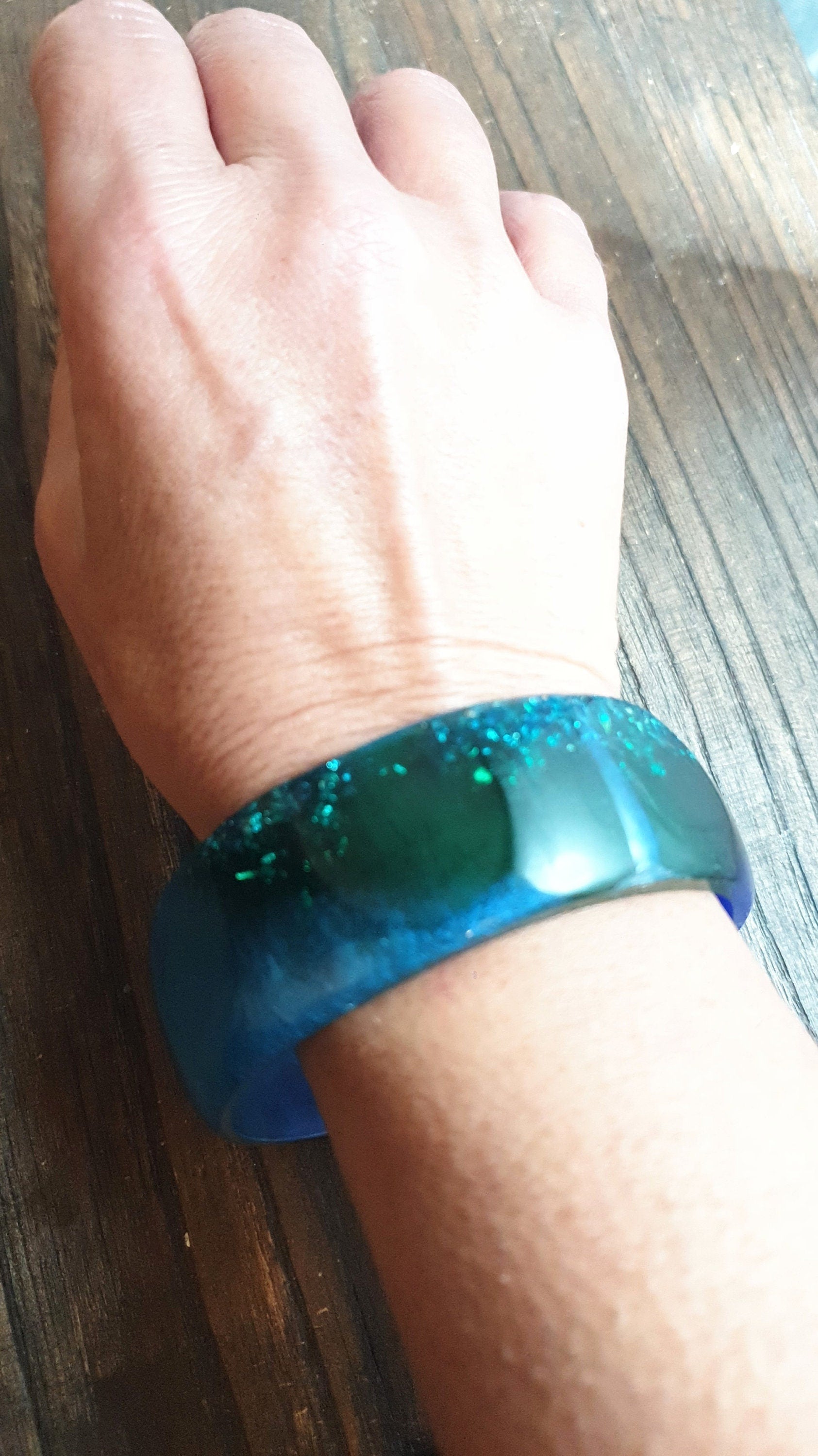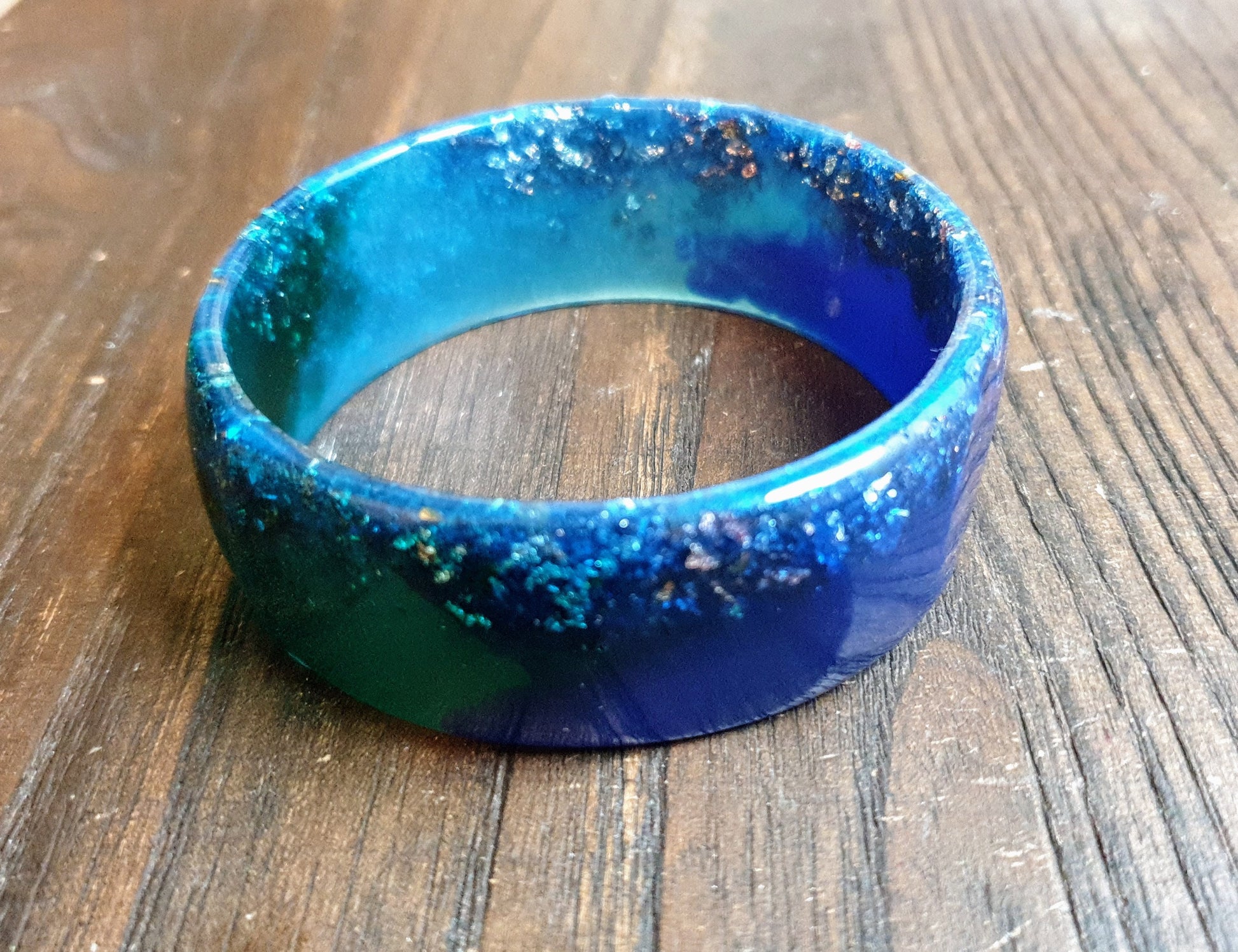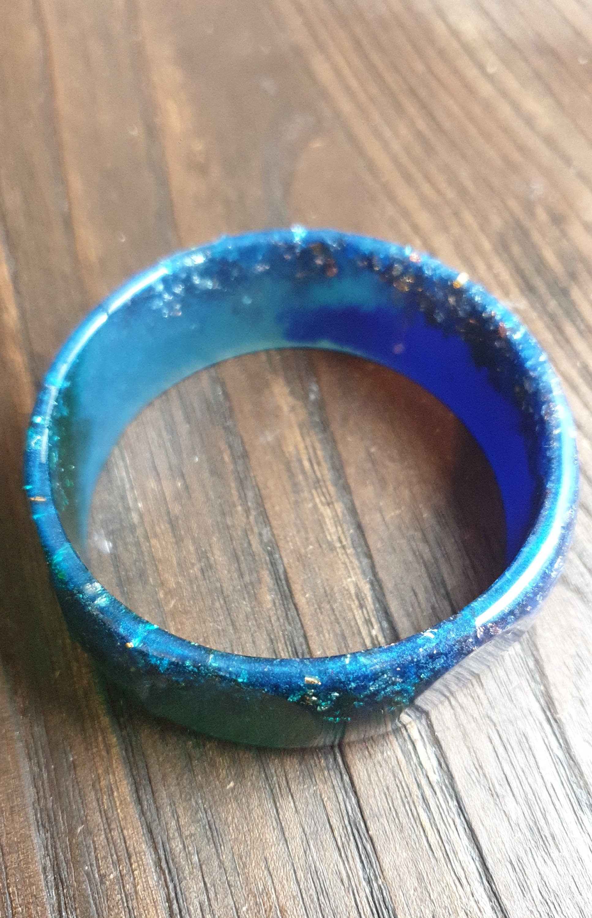 Unique Mixed Blues and Green Wide Resin BangleMaterial: poured resin mixed with blue, aqua and green pigment and silver and rosegold leaf.Colour: aqua, blue, green, silver, rose goldInner diameter: 67mm
