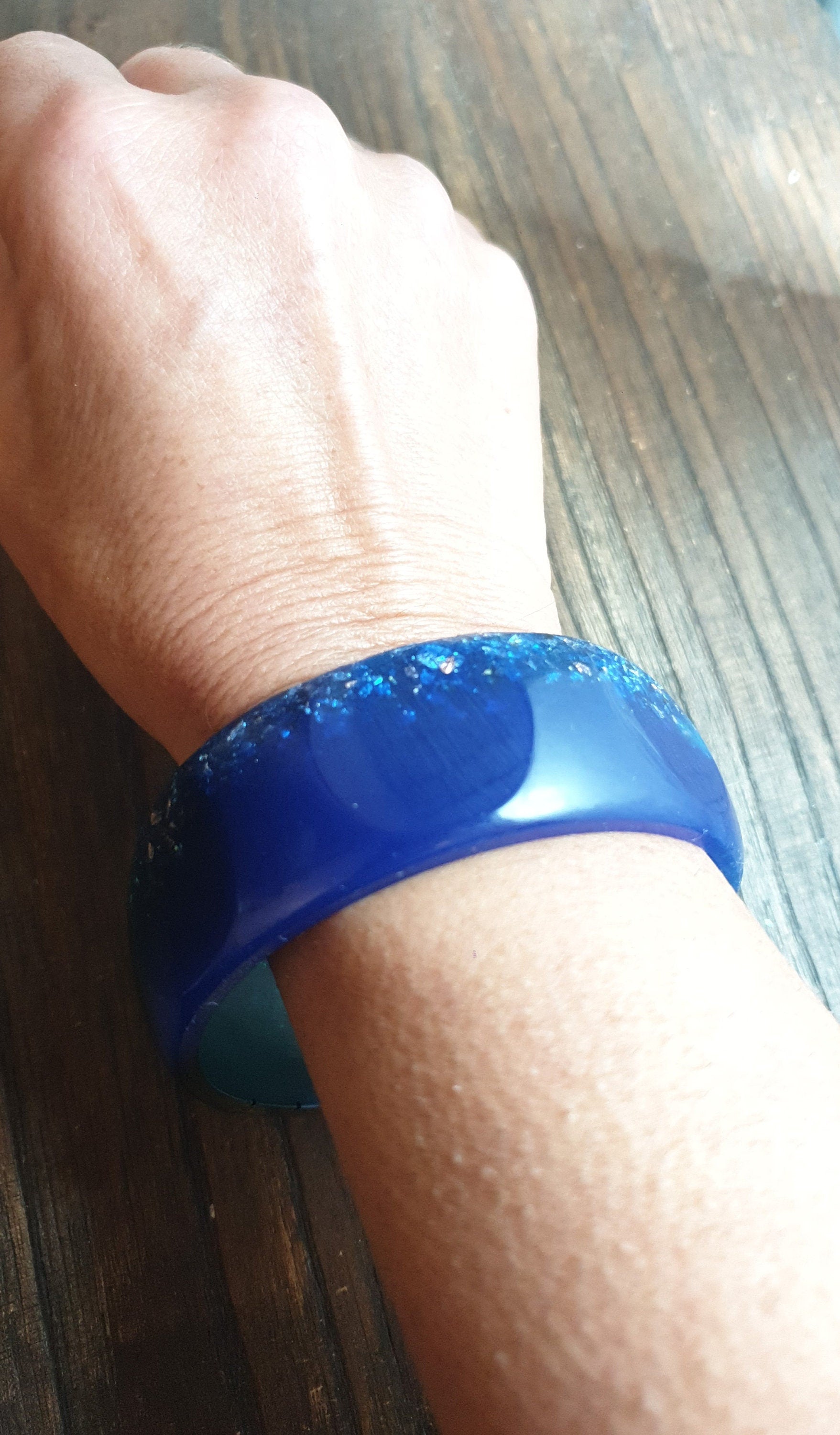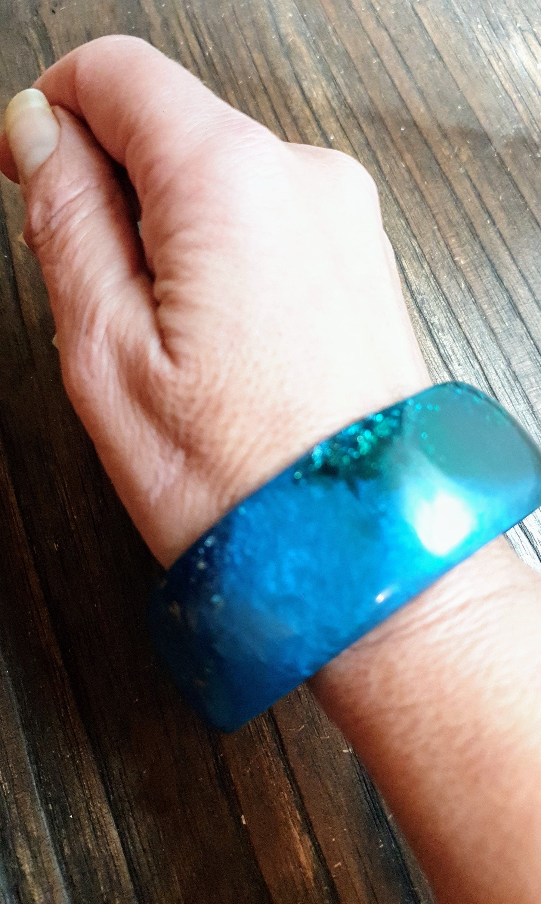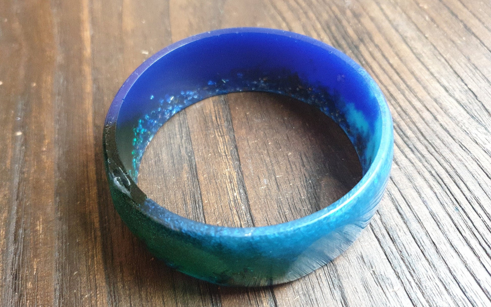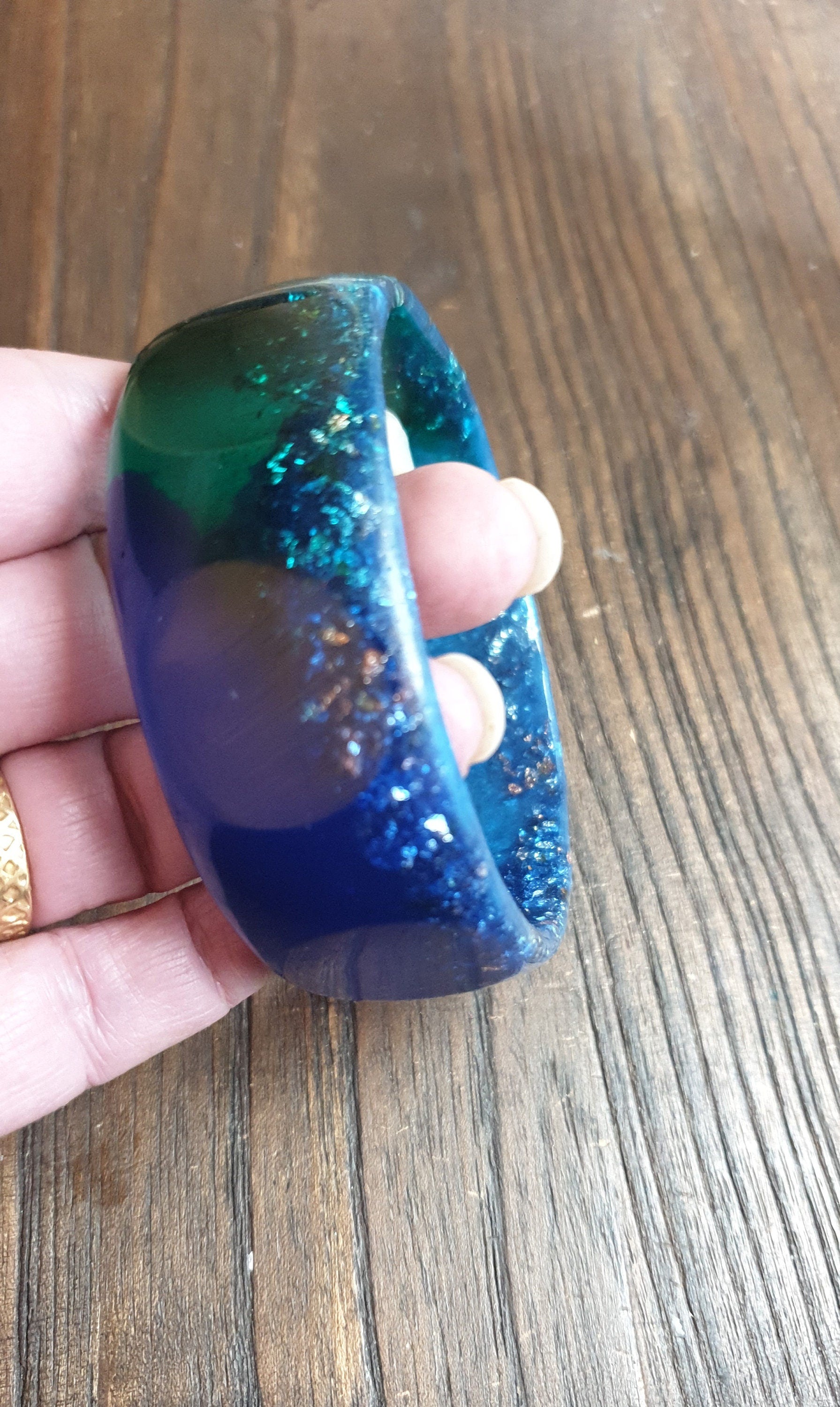 Unique Mixed Blues and Green Wide Resin BangleMaterial: poured resin mixed with blue, aqua and green pigment and silver and rosegold leaf.Colour: aqua, blue, green, silver, rose goldInner diameter: 67mm