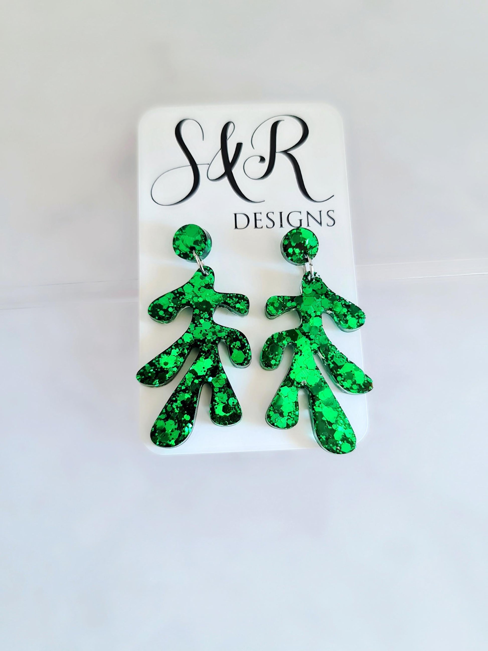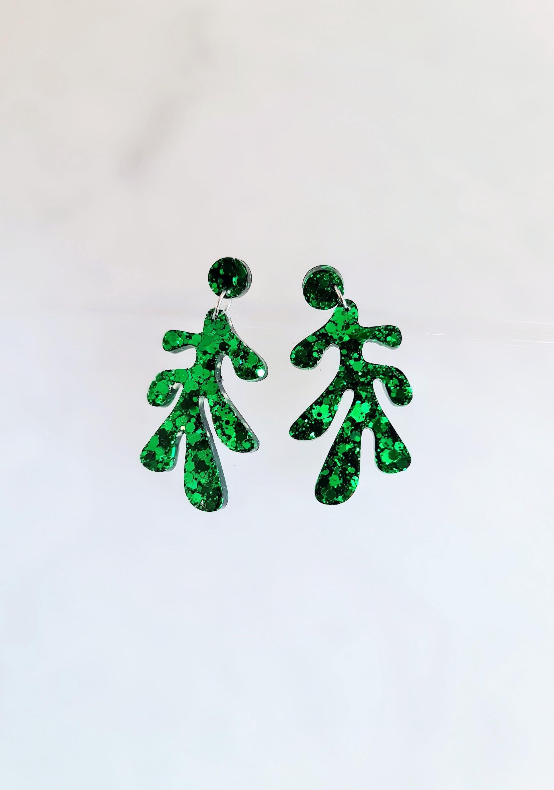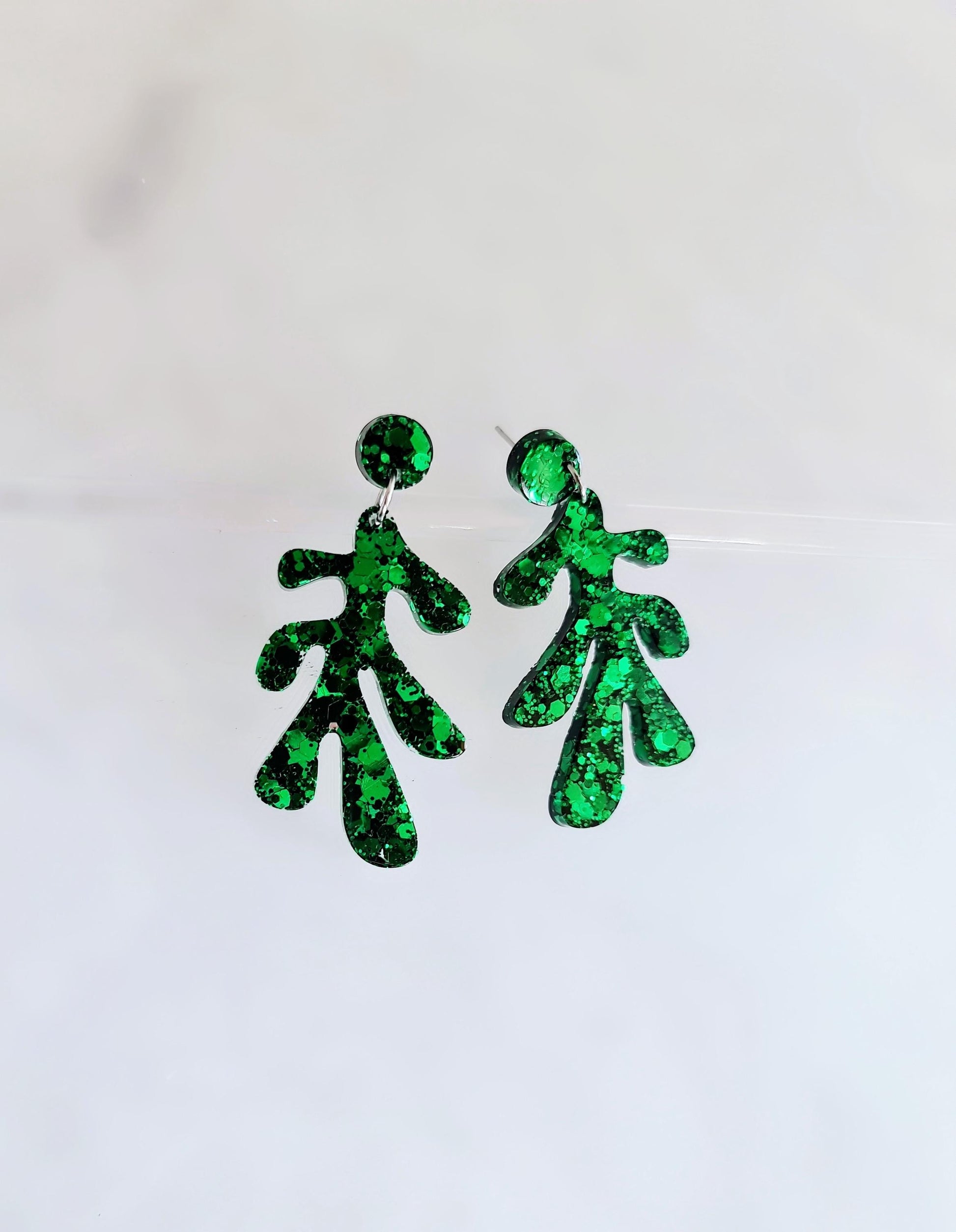 Emerald Green Glitter Resin Earrings: Flower Leaf Dangles, Hypoallergenic