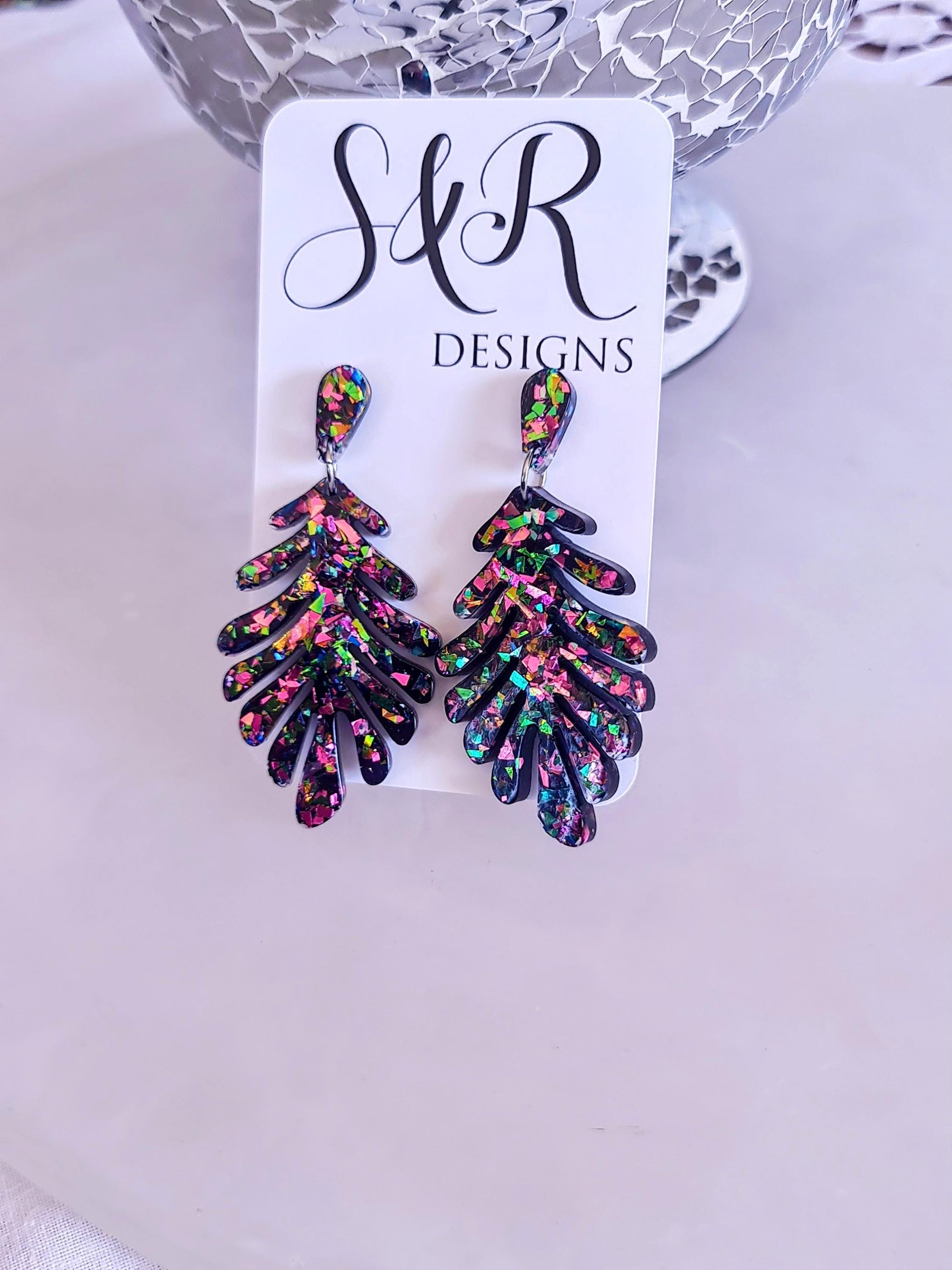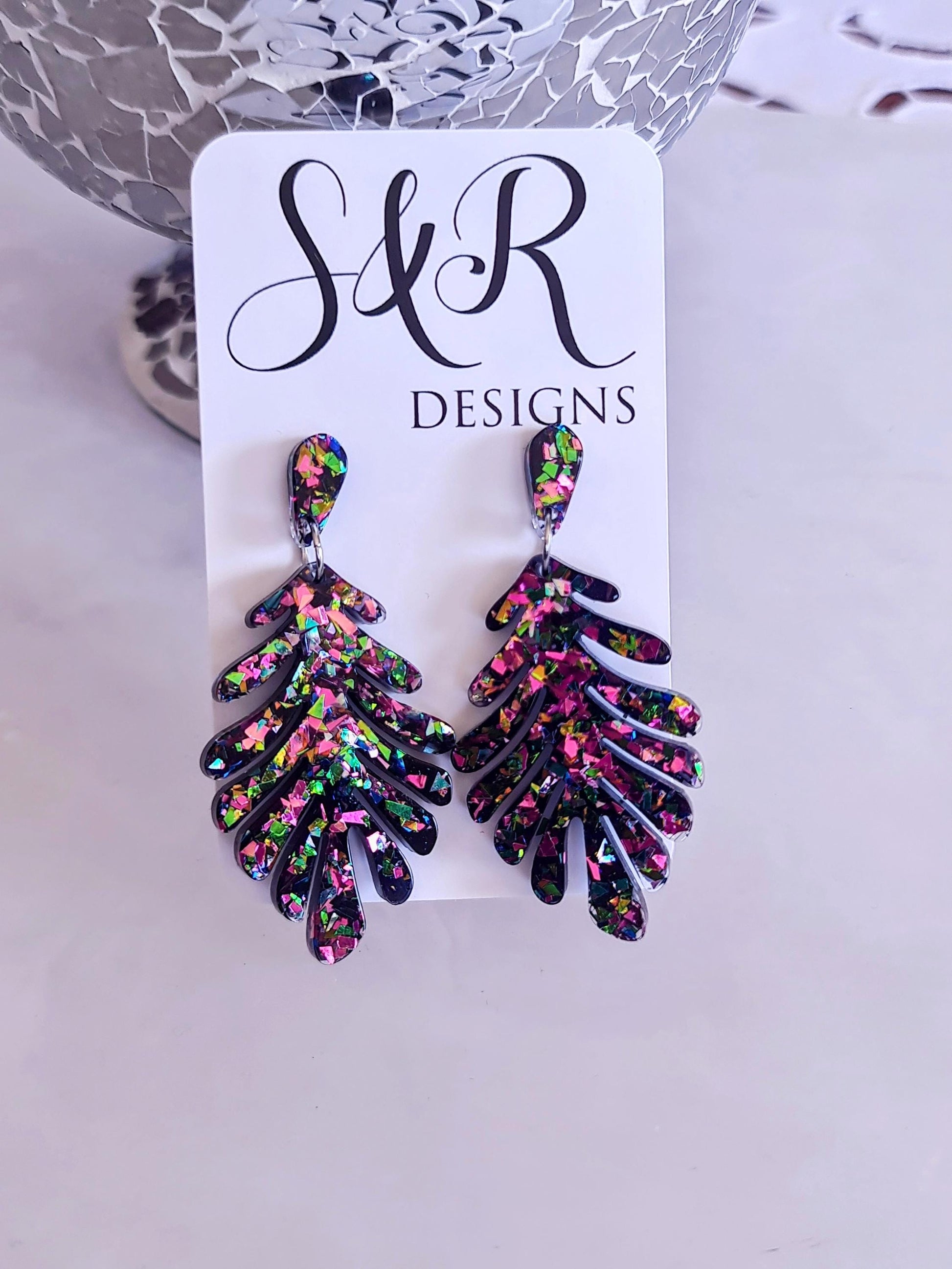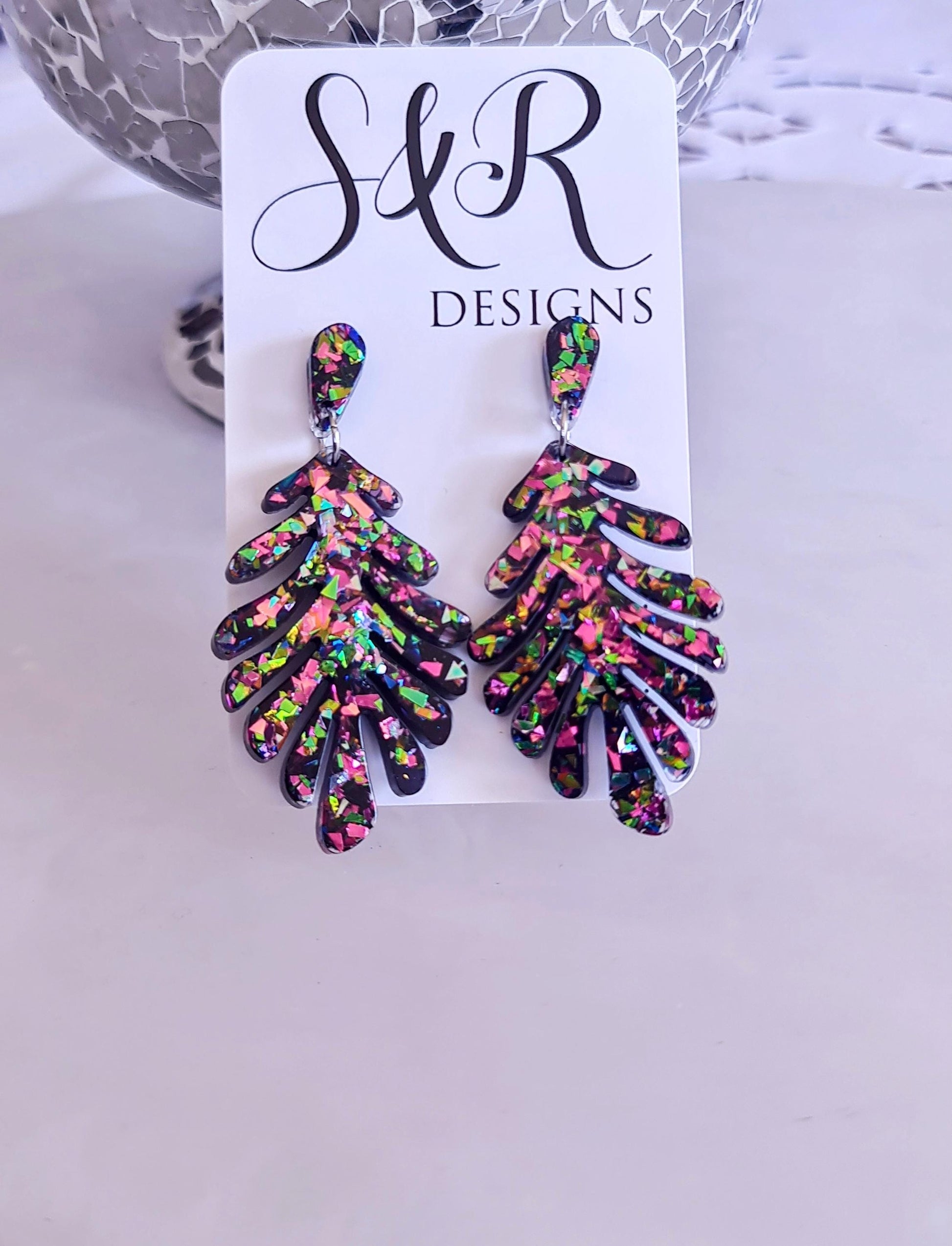 Handmade Glitter Resin Leaf Earrings - Multicoloured Bold Statement Jewellery