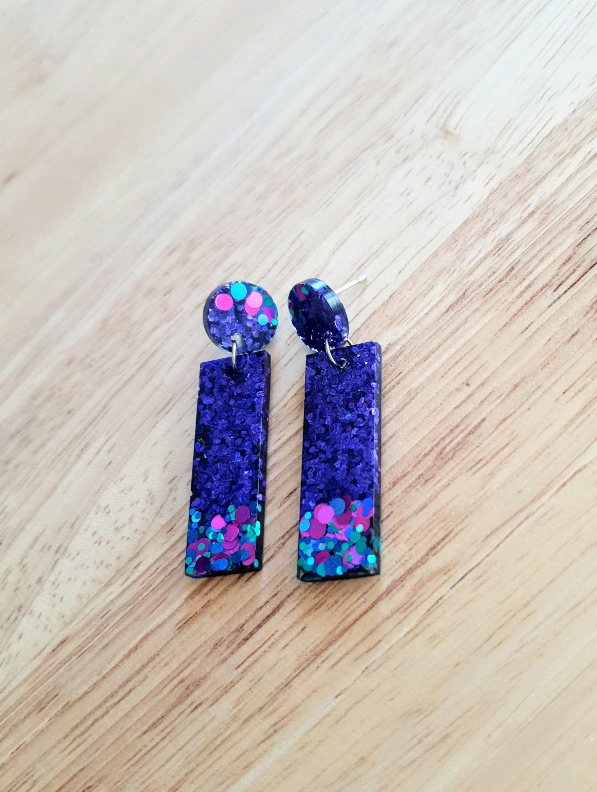 Multi Coloured Stunning Rectangle Bar Dangle Resin Earrings Material: Stainless steel, resin, glitter Colour: purple, aqua and pinkSize: 56mm length drop X 14mm wideIf you like light weight comfortable earrings then these are for you. Sparkly you can wear everyday or a night out.These earrings can be made in any colour you want. Custom your colour or if you would like shapes moved around.All metals are made with stainless steel which is perfect for sensitive ears and never changes colour.