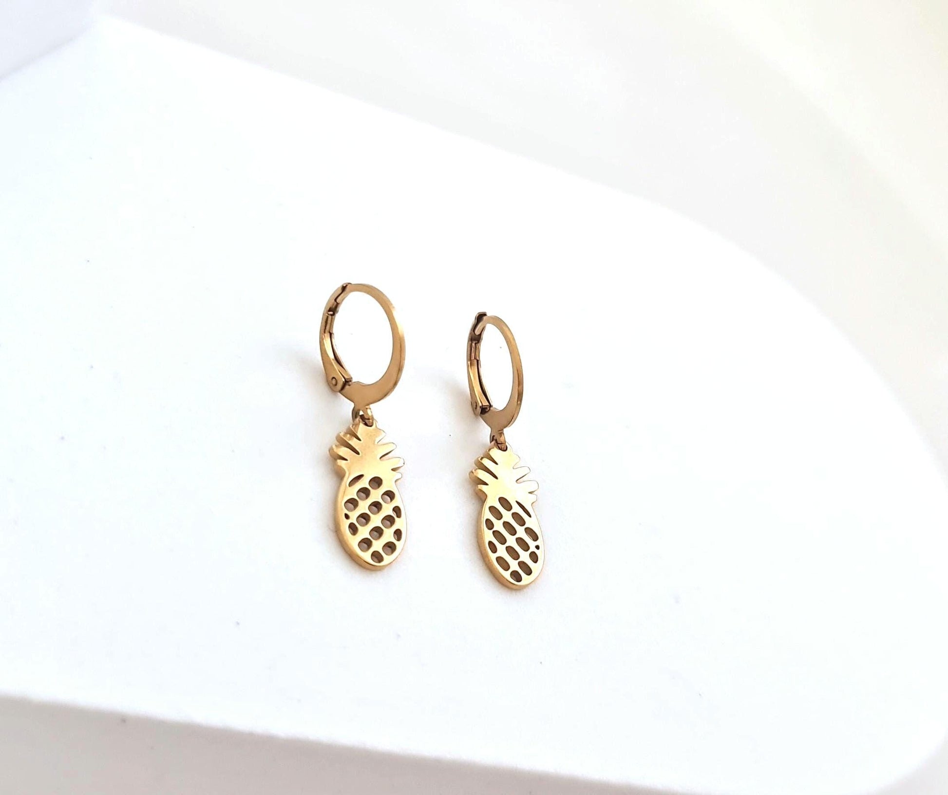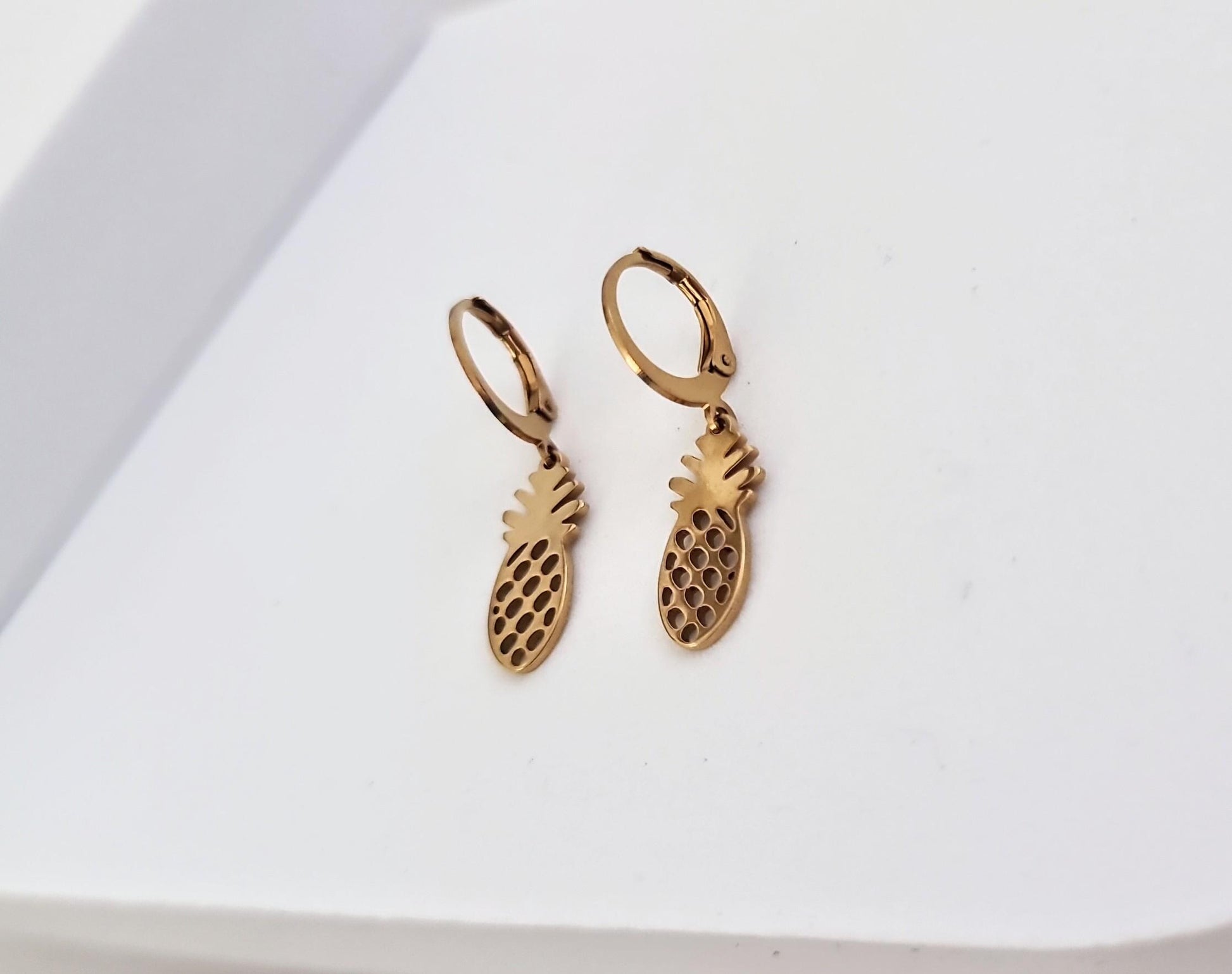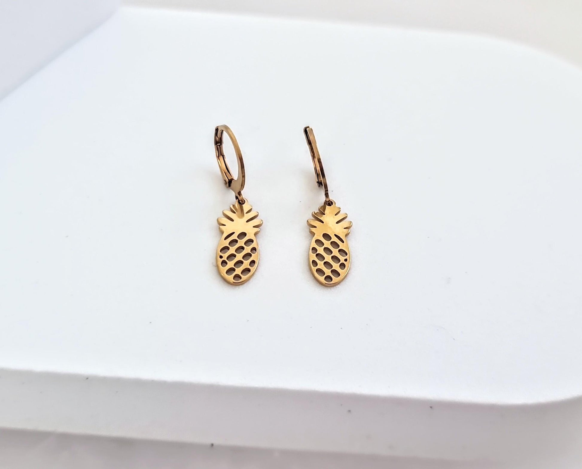 18k Gold Pineapple Earrings, Exotic Tropical Fruit, Gold PVD Stainless Steel Dangle Leverback Earrings. Fruit Lover