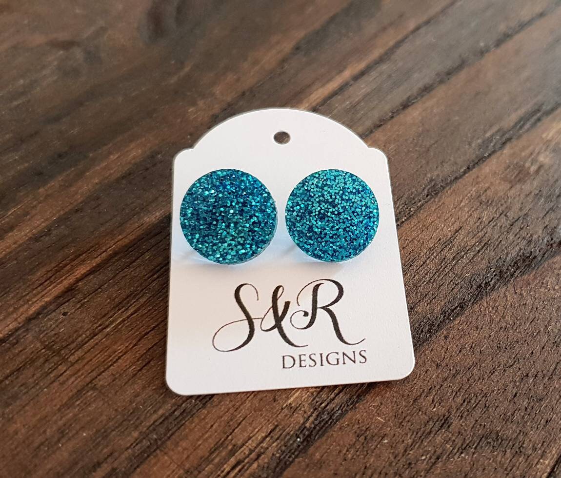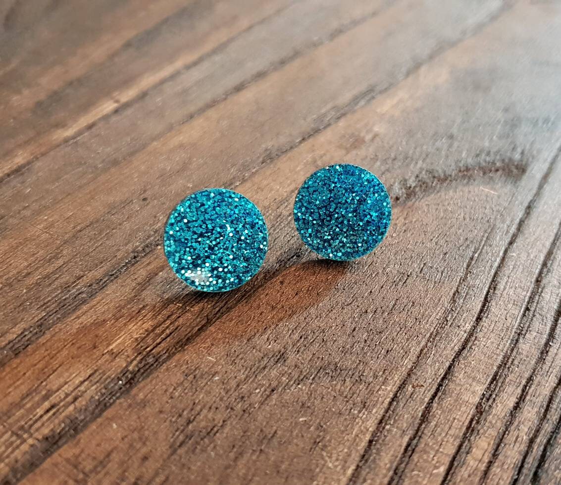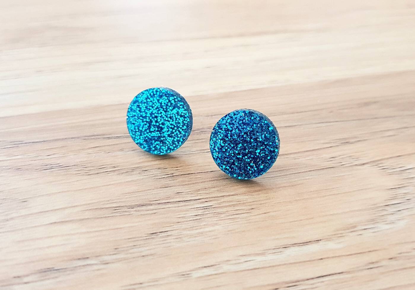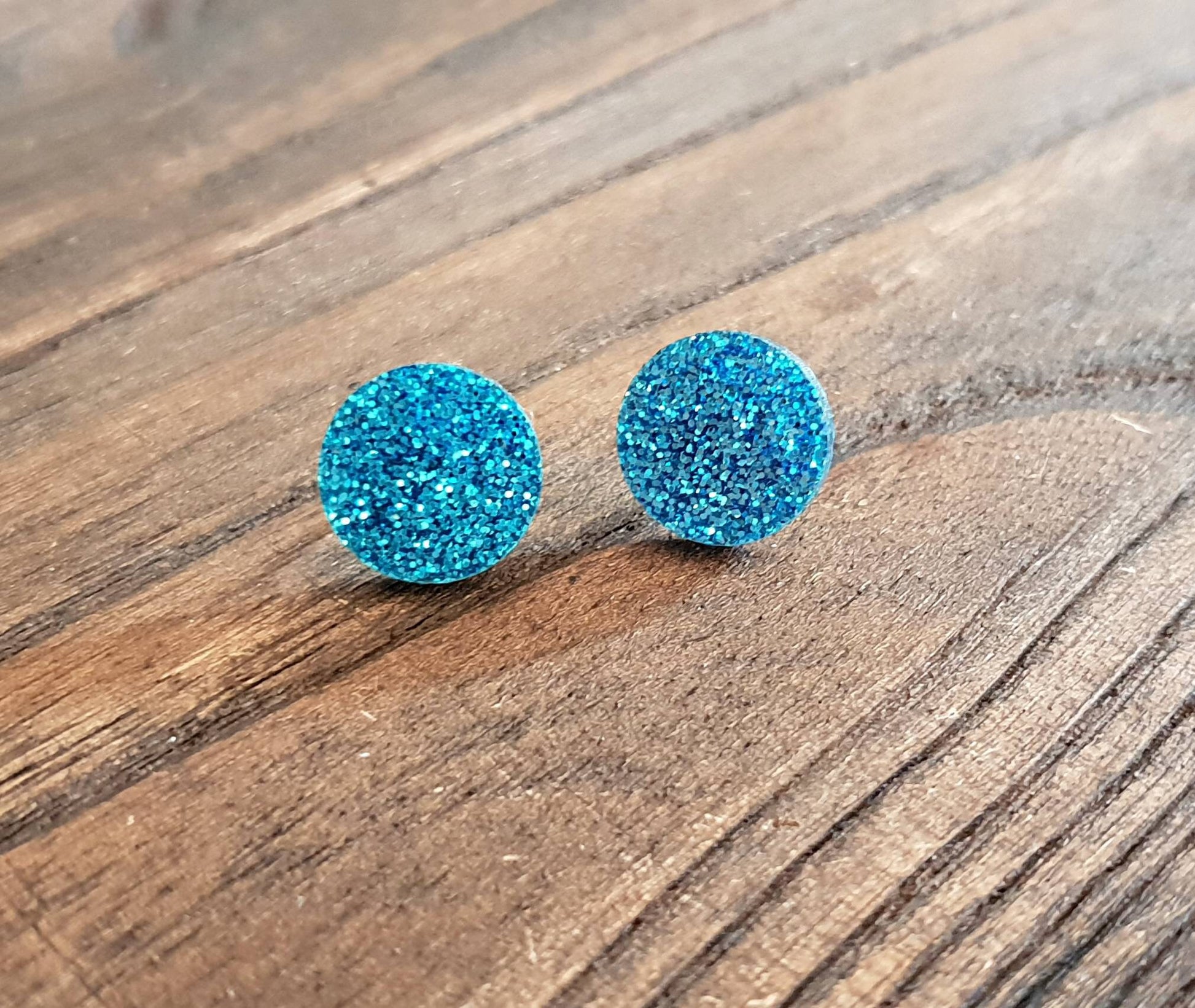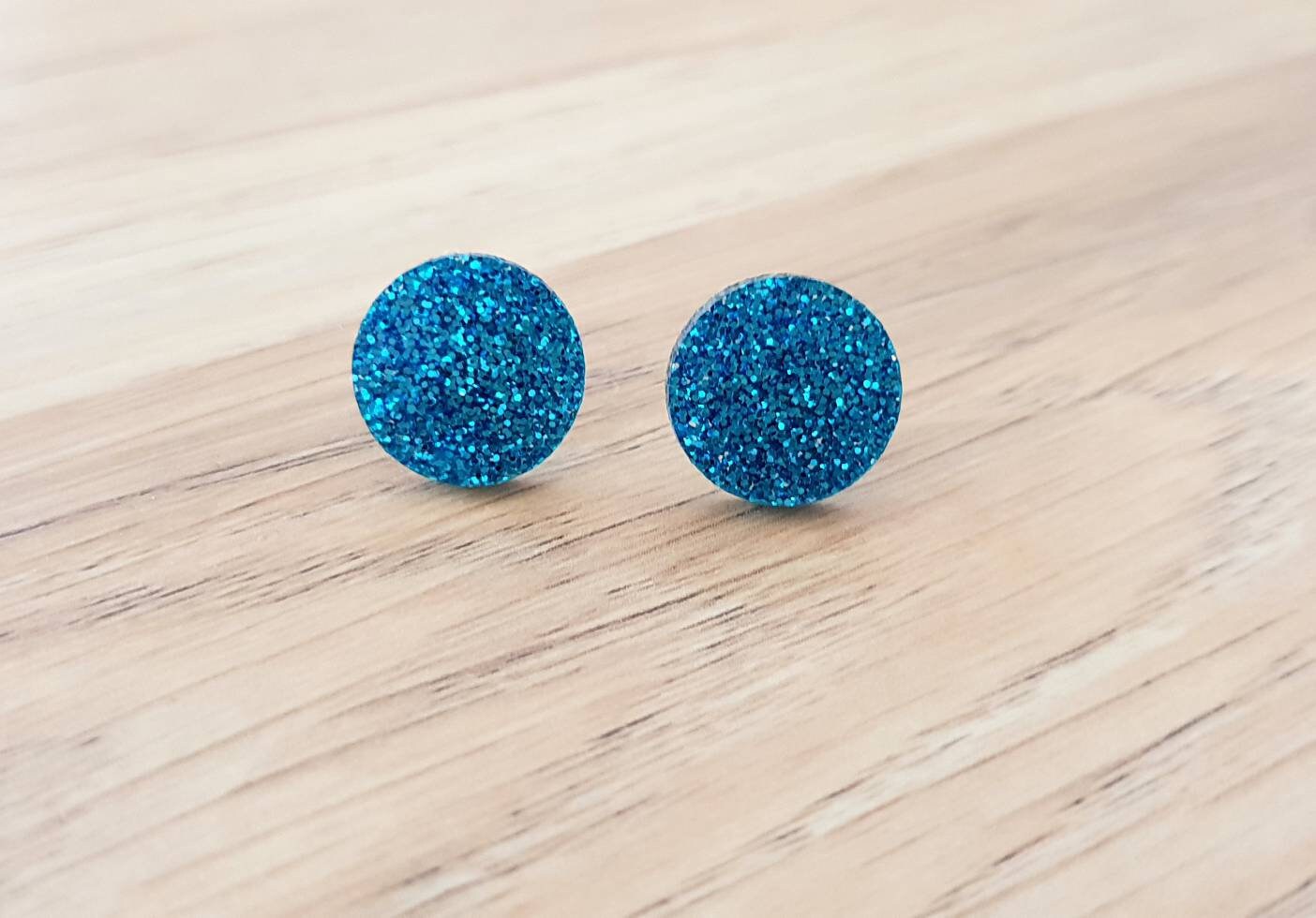 Aqua Blue Circle Studs, Blue Fine Glitter Circle Stud Earrings, Acrylic Earrings, Stainless Steel Earrings.