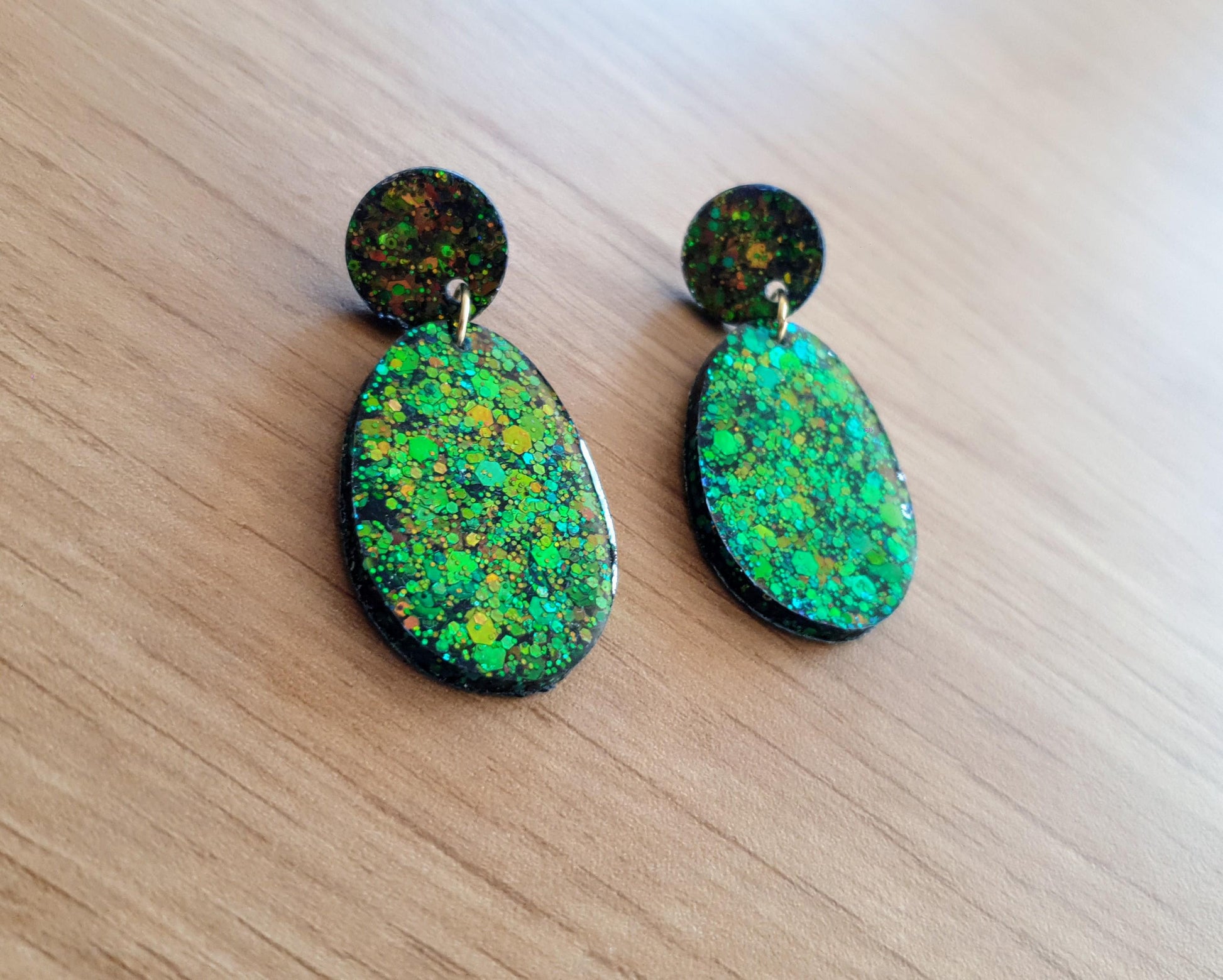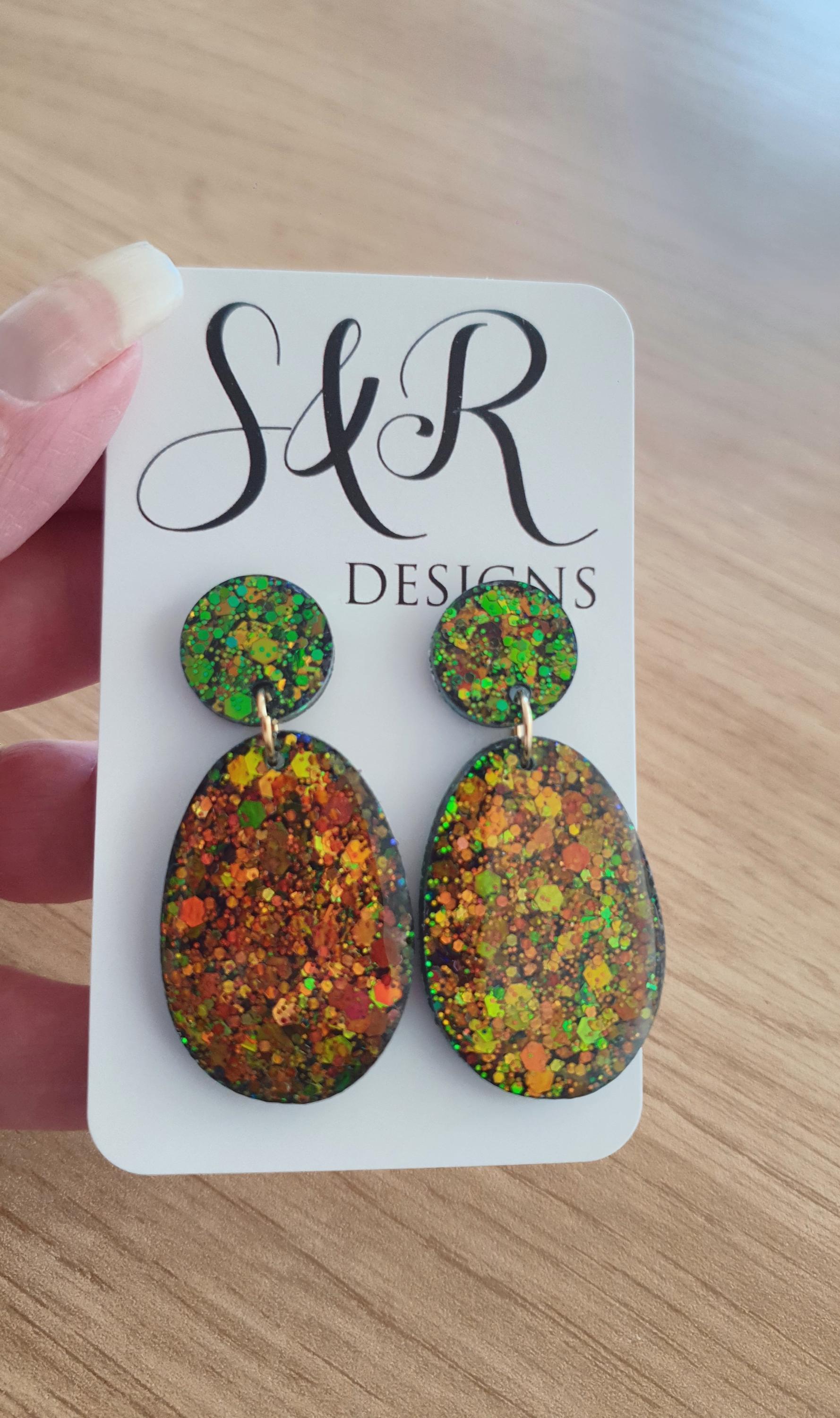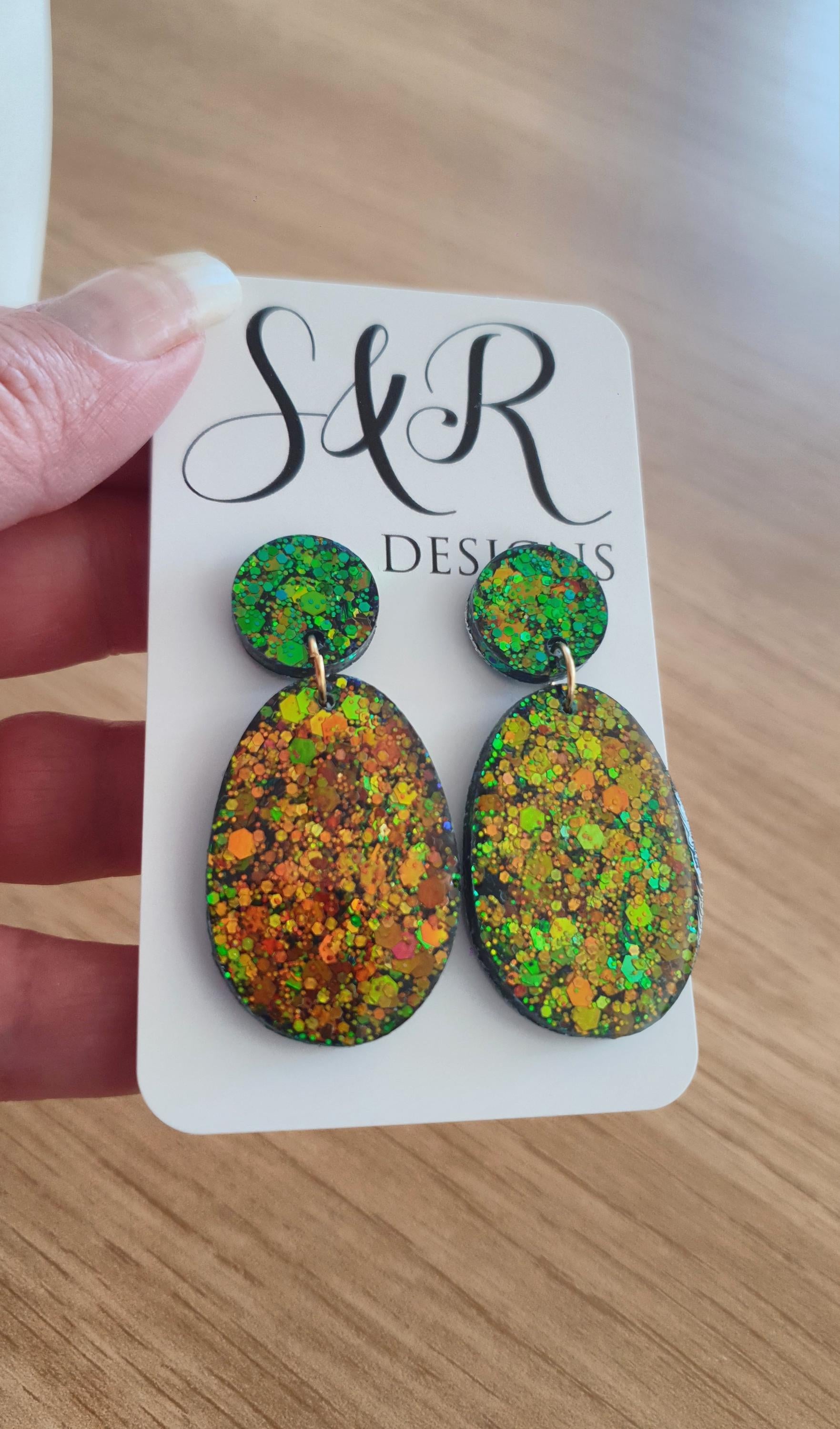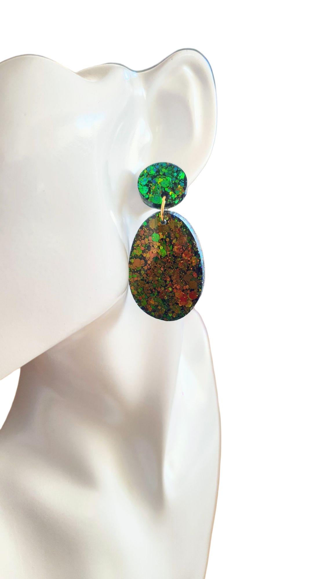 Statement Handmade Glitter Oval Long Earrings.Material: Stainless steel, poured resin, glitters.Colour: green, brown and gold mix Size: 50mm length drop X 24 mm wide.All resin is mixed and poured, sanded and polished and made by me Angie. If you would like different colours please email me.