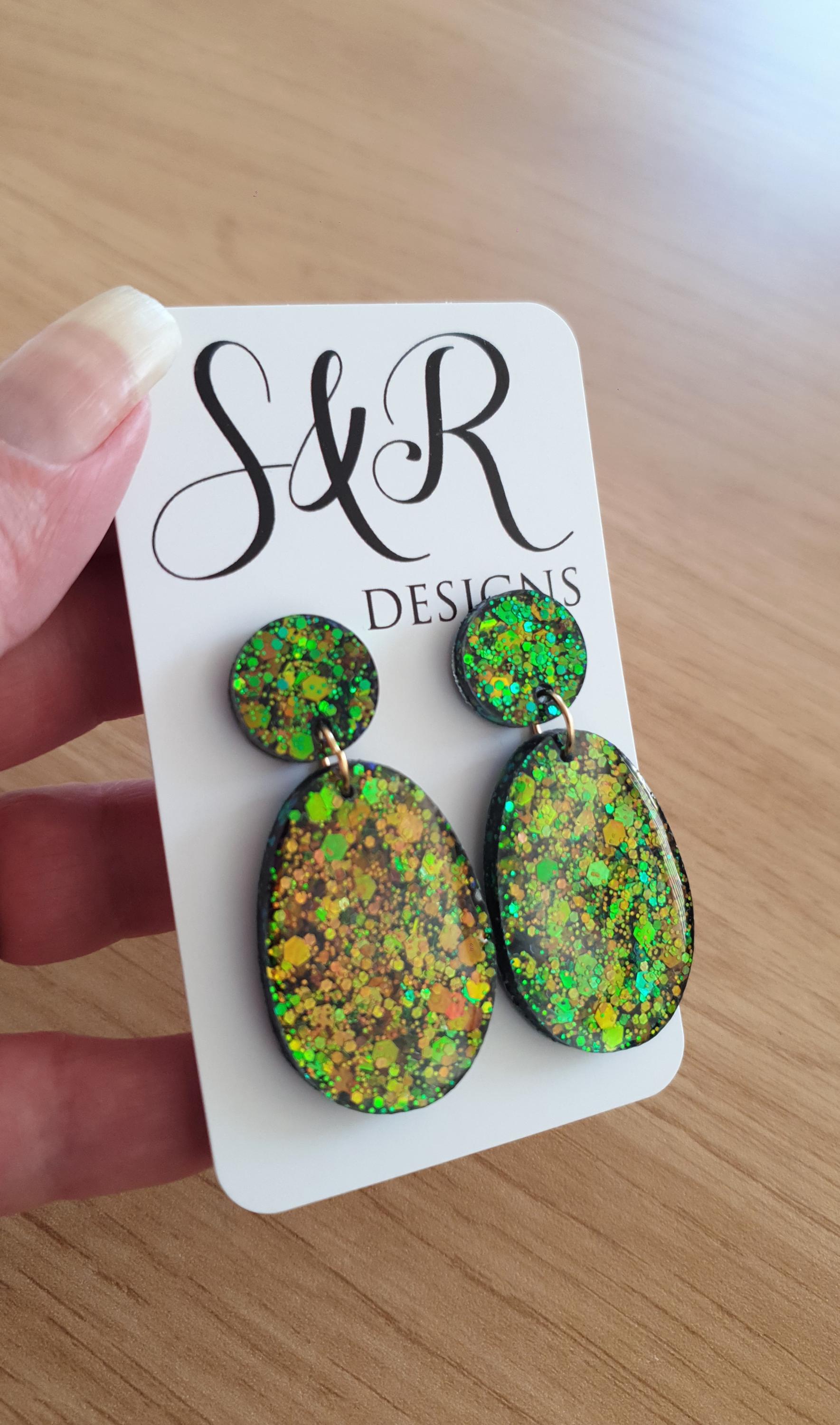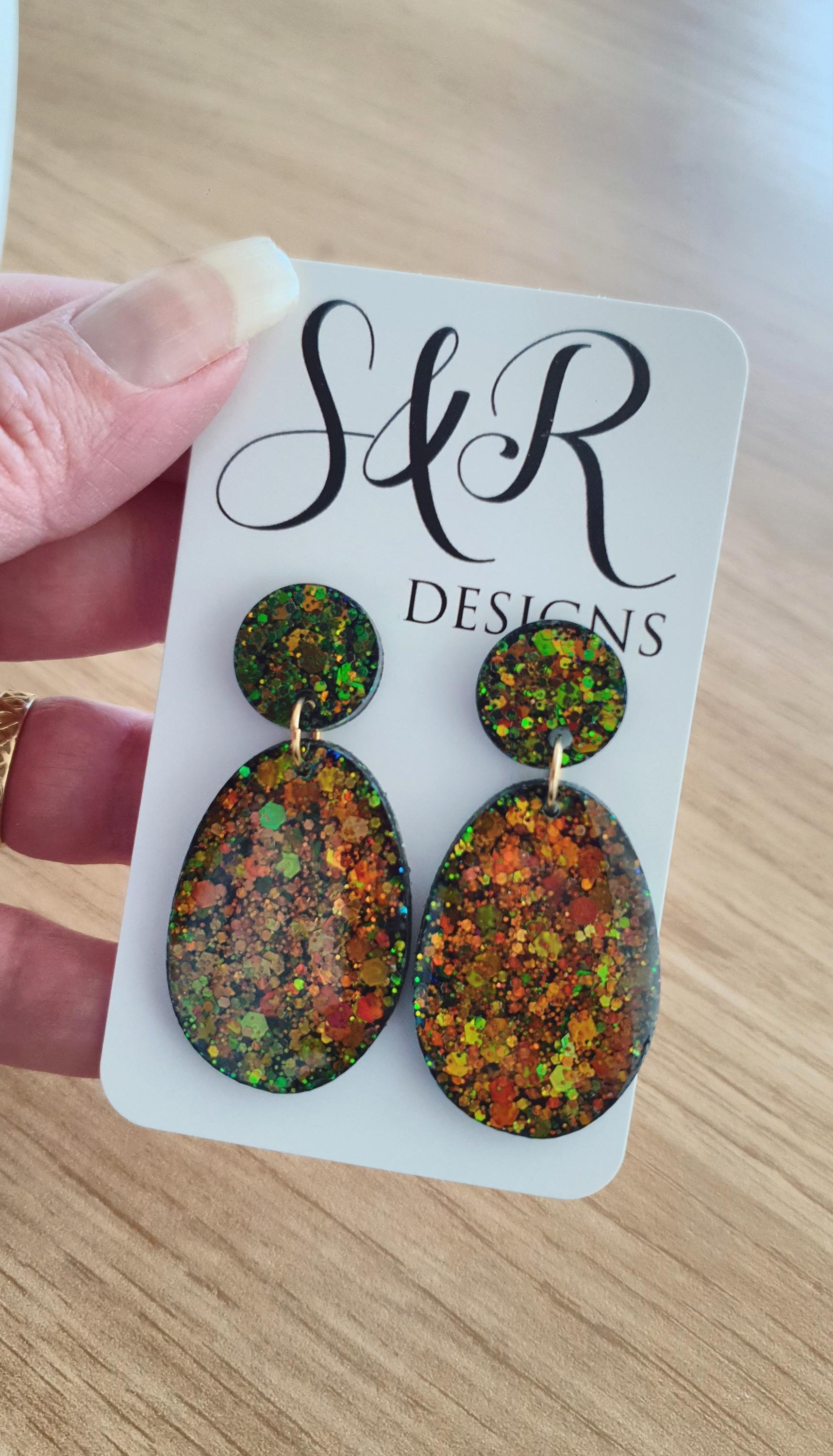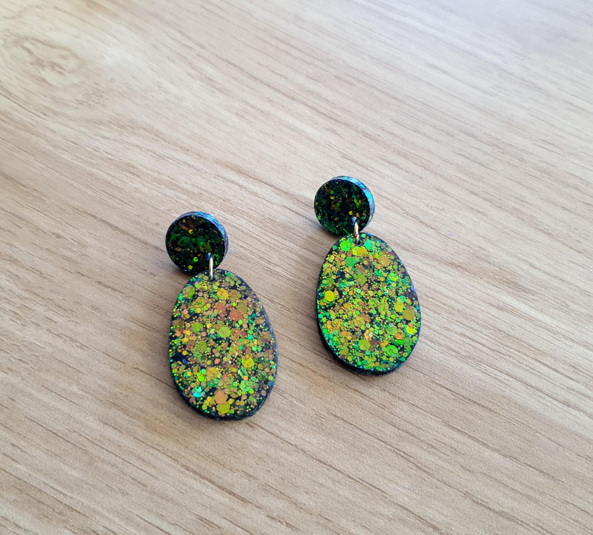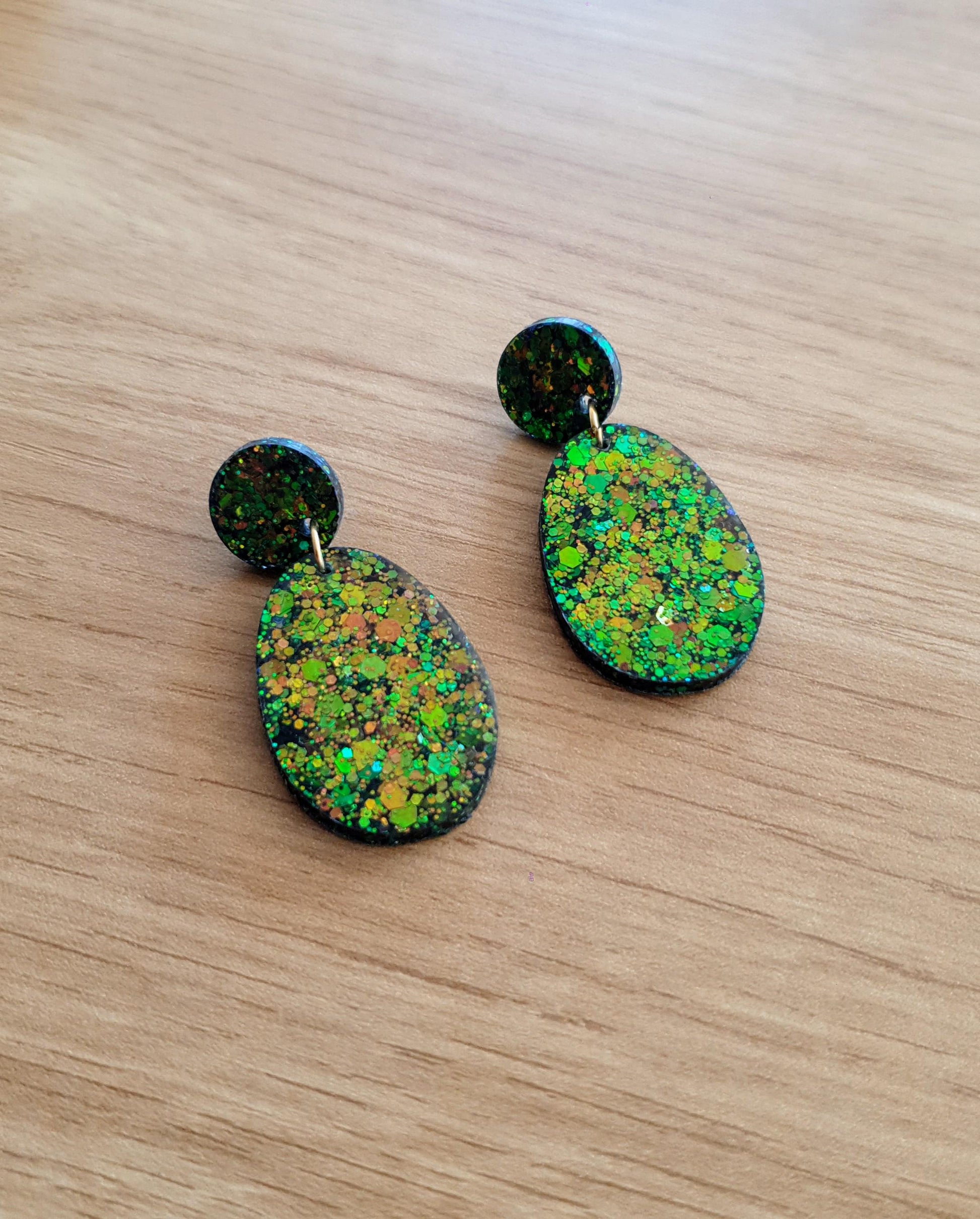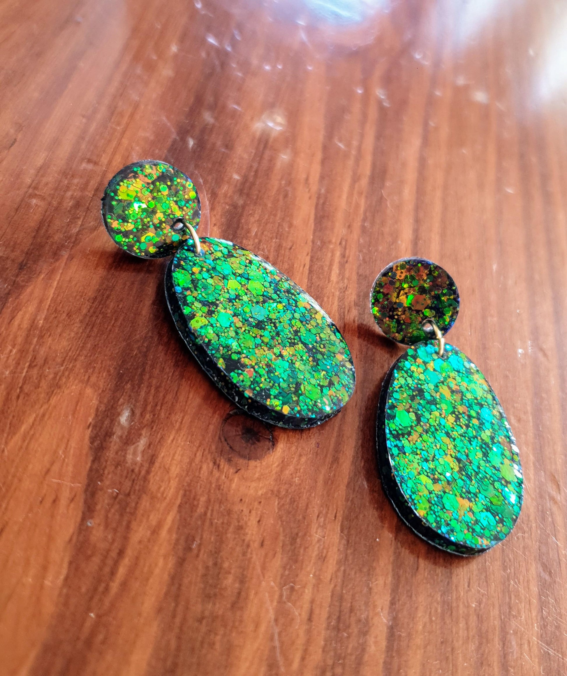 Statement Handmade Glitter Oval Long Earrings.Material: Stainless steel, poured resin, glitters.Colour: green, brown and gold mix Size: 50mm length drop X 24 mm wide.All resin is mixed and poured, sanded and polished and made by me Angie. If you would like different colours please email me.