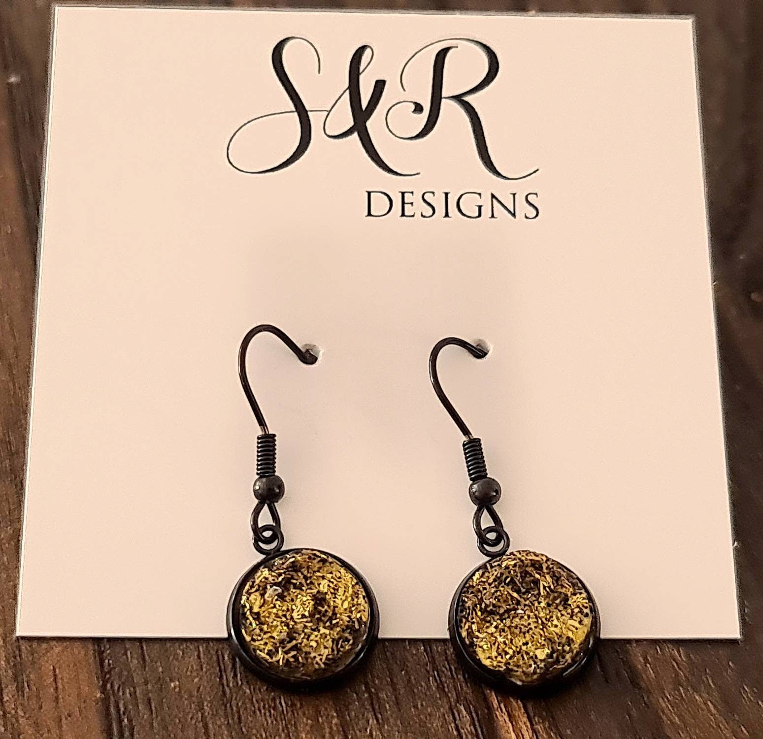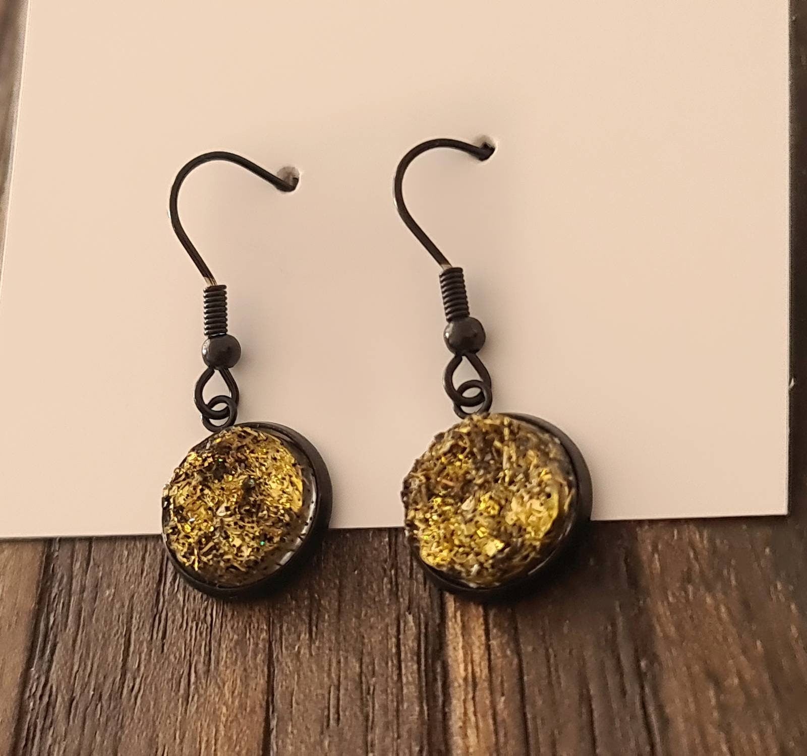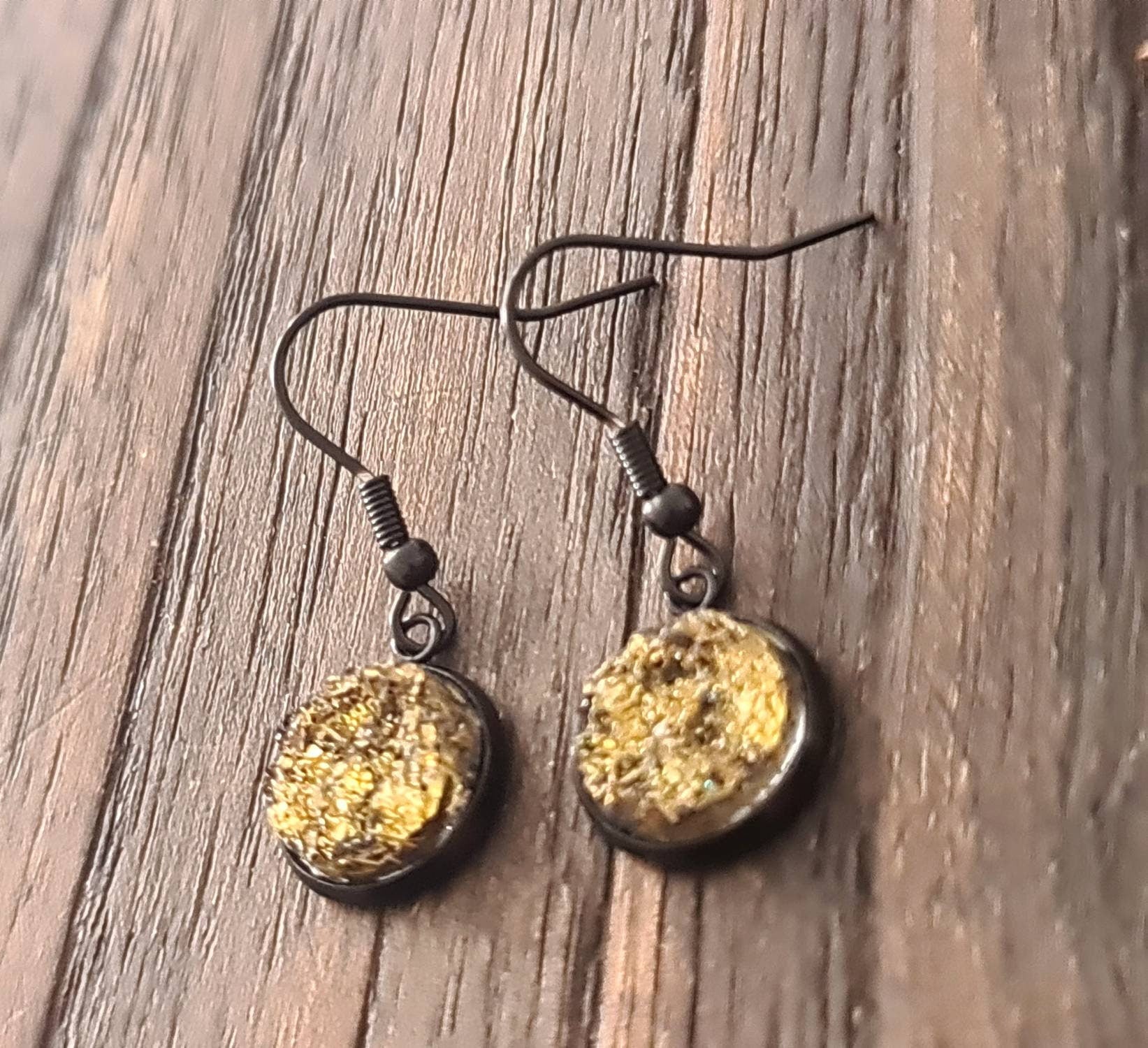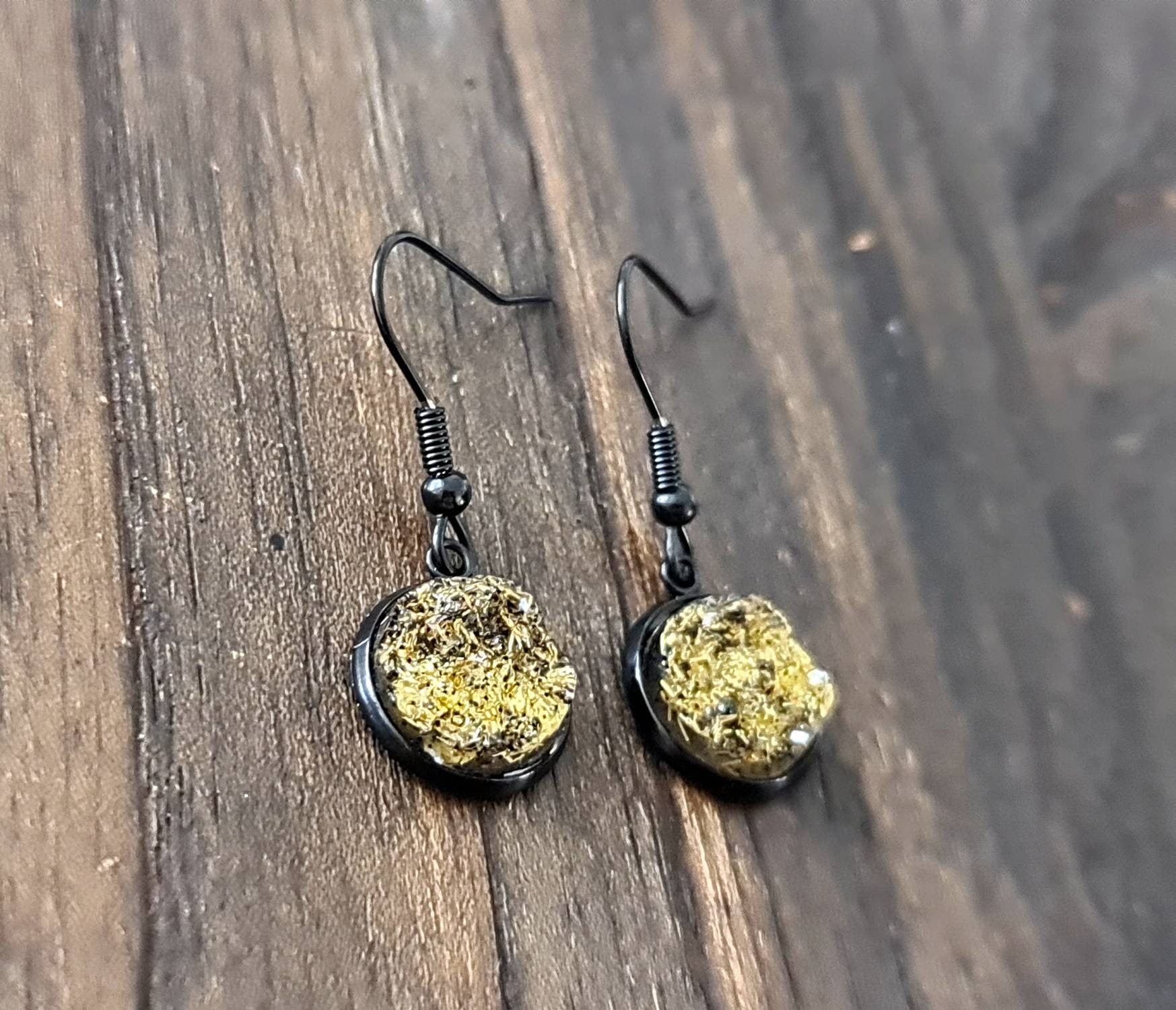 Black Bezel with Gold Shimmer Faux Druzy Dangle Earrings, Black Stainless Steel Bezel Hook Dangle Earrings