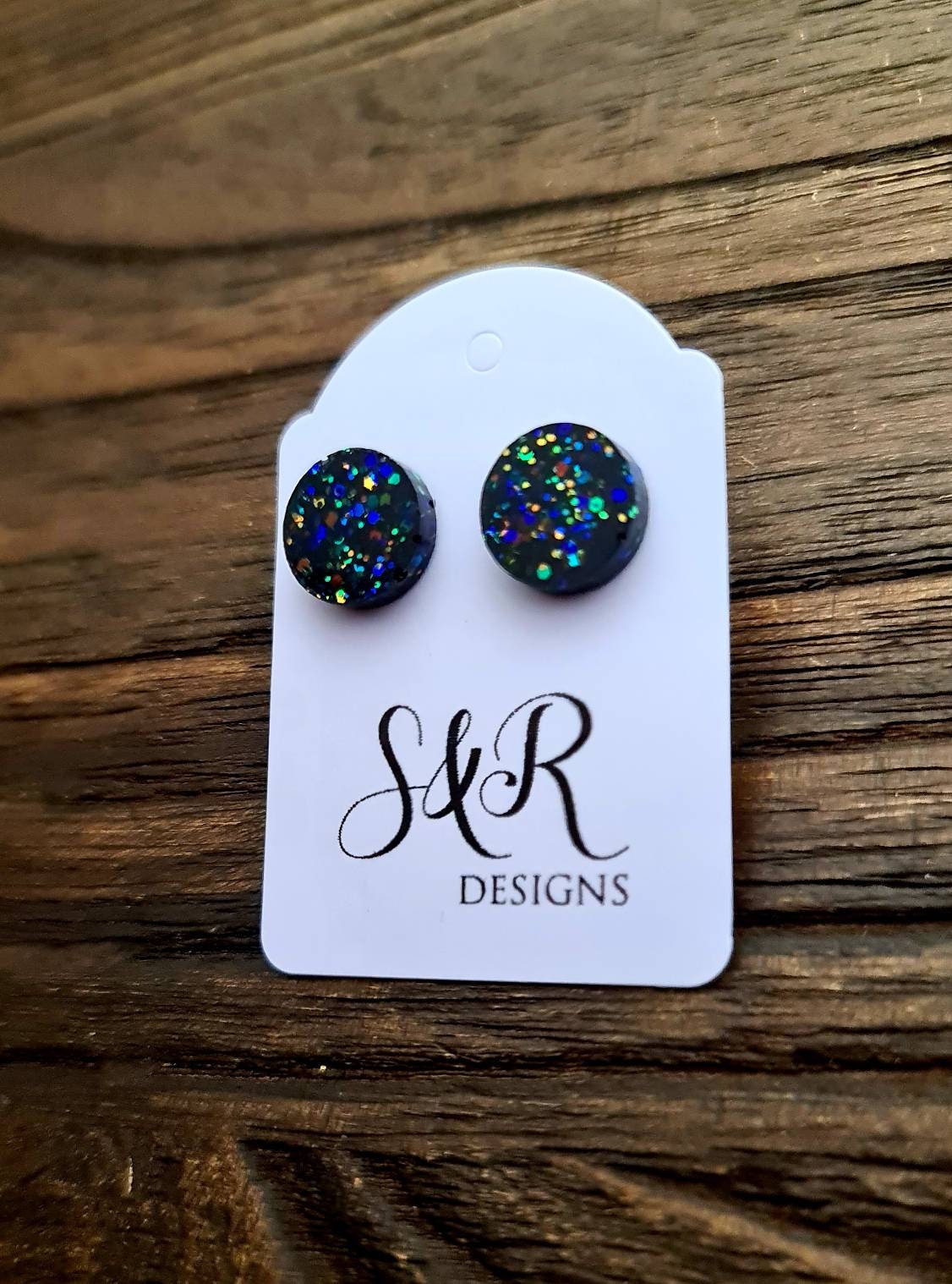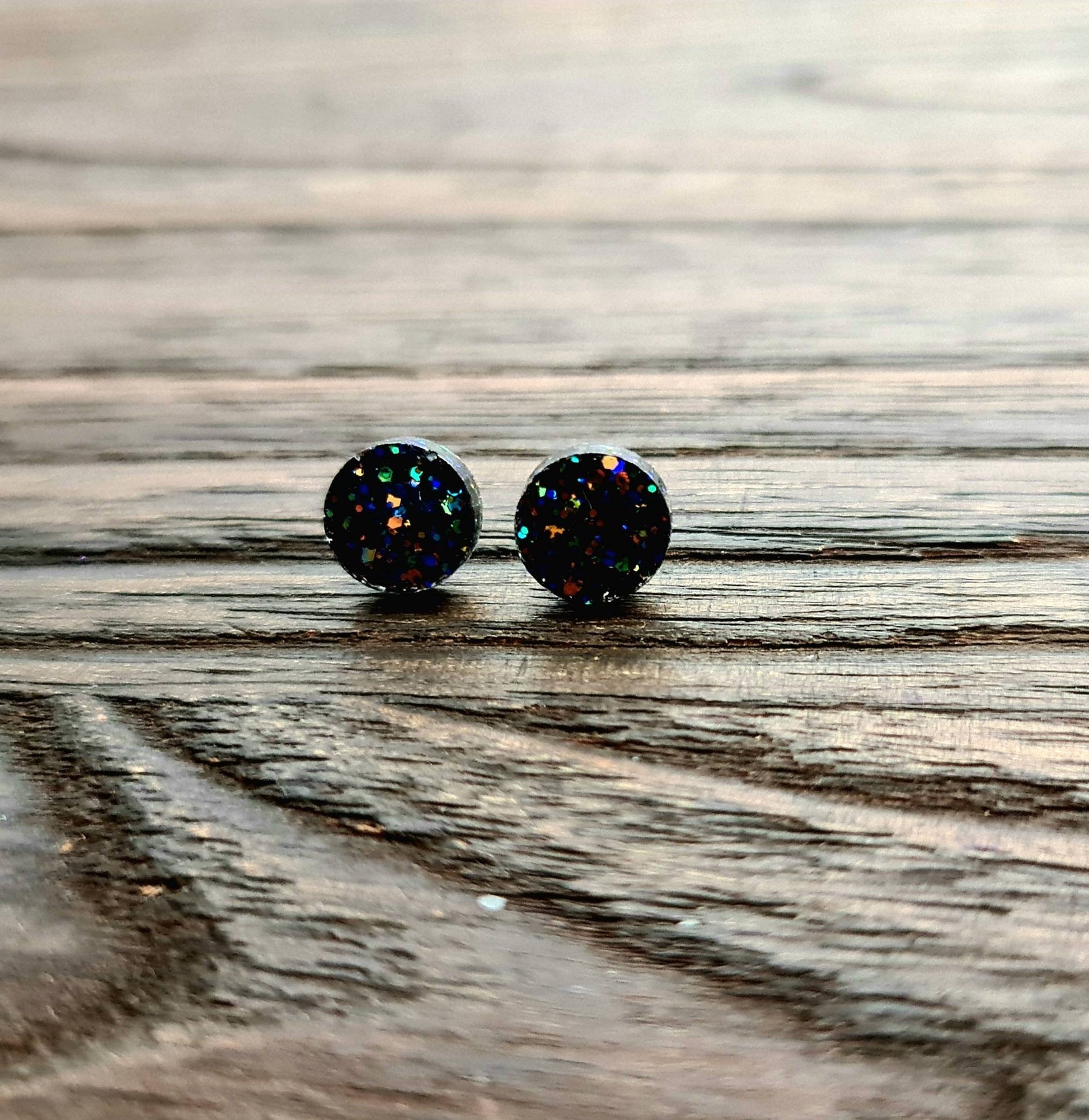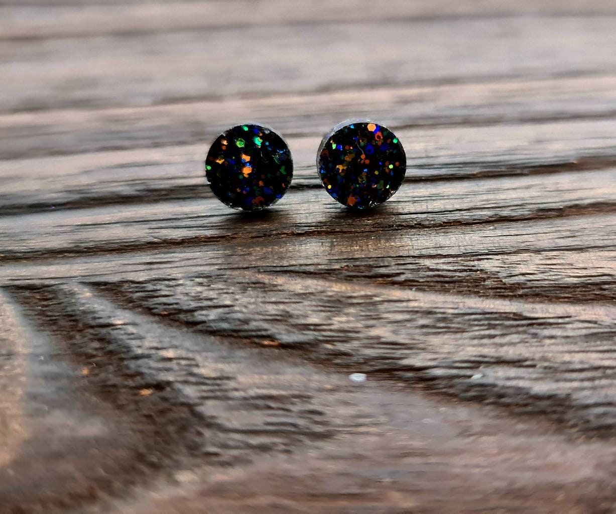 Stunning Circle Dot stud Earrings. Material: Stainless steel, poured resin, glitters and colours.Colour: black rainbow glitterSize: 10mm length X 10 mm wide,