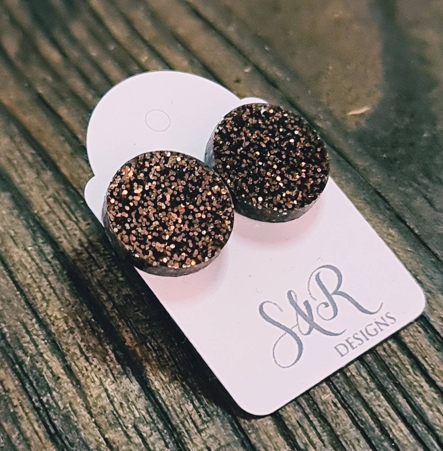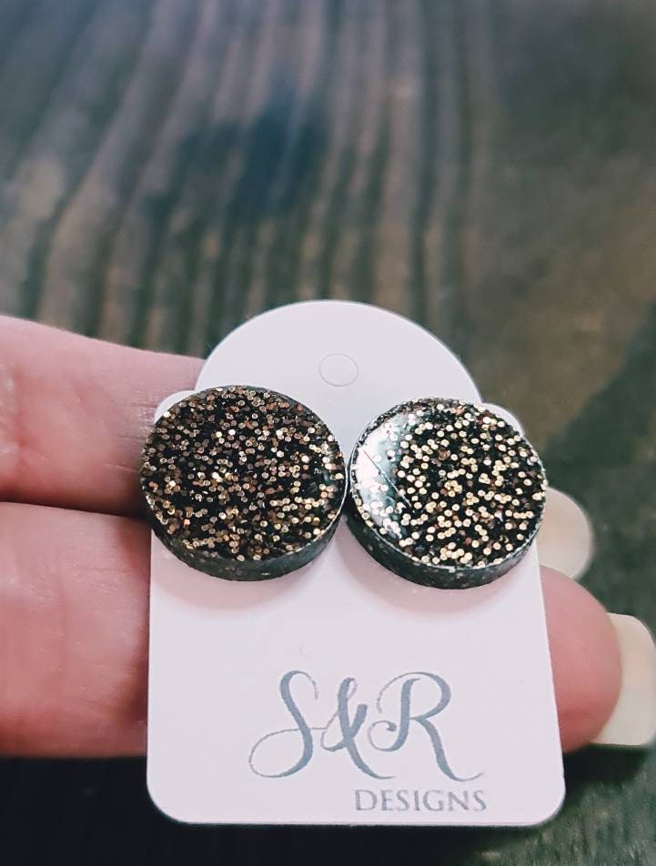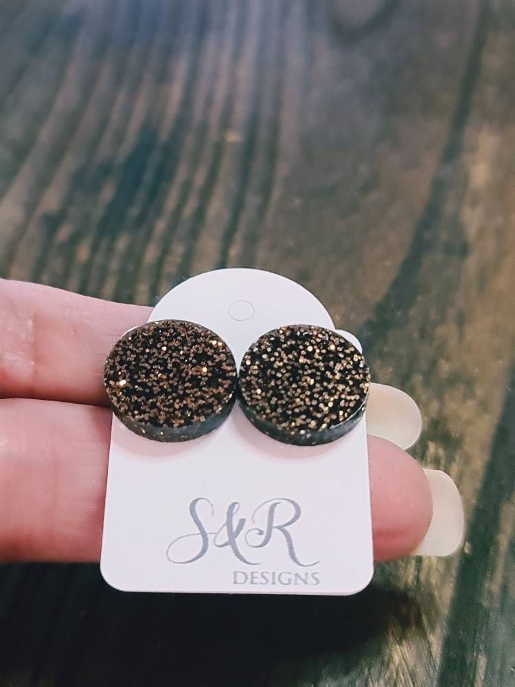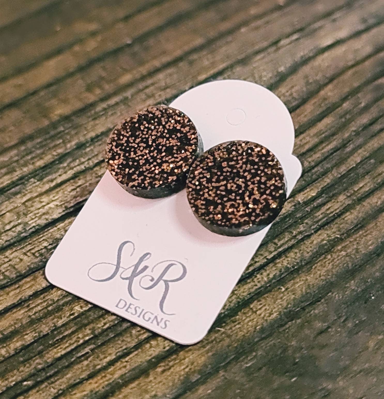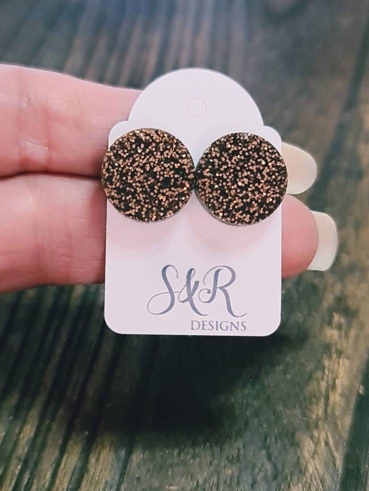 Black Copper Glitter Circle Stud Earrings, Acrylic Earrings, Stainless Steel Earrings. 15mm