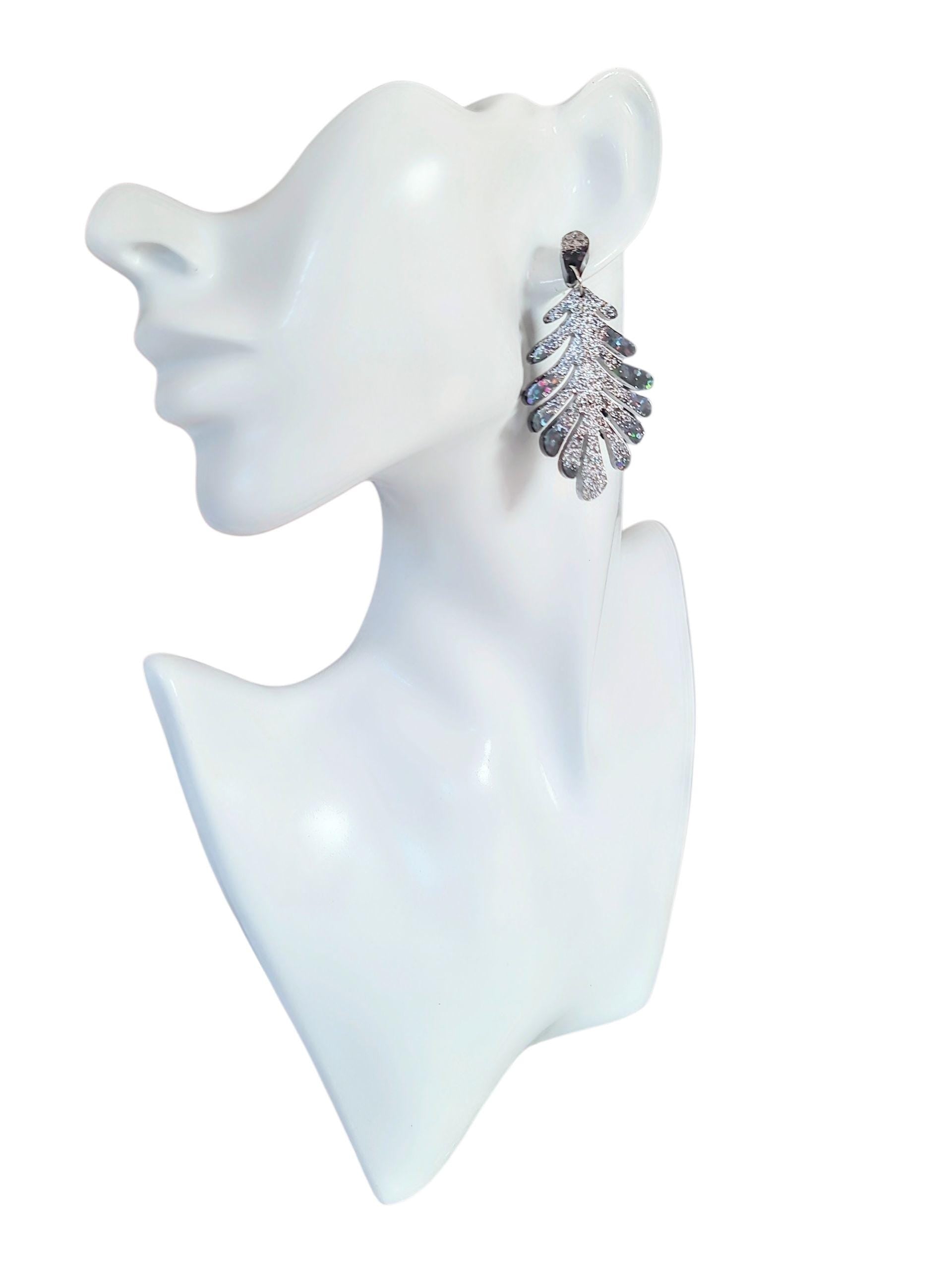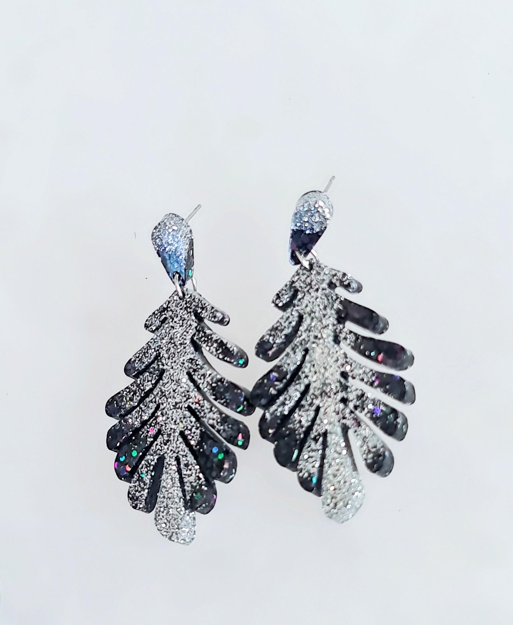 Statement Black & Silver leaves design earrings with stainless steel hypoallergenic.Add a bold touch of sparkle to your style with these handmade glitter resin leaf earrings. Featuring a unique, abstract leaf design with shimmering chunky Black Rainbow and a splash of fine silver Glitter, these earrings are lightweight and perfect for all-day wear. Their eye-catching design makes them a versatile accessory for dressing up or adding flair to casual outfits. Each pair is carefully handcrafted, ensuring you receive a one-of-a-kind piece that stands out. These earrings also make a thoughtful gift for anyone who loves unique, nature-inspired Jewellery.Key Features:Handmade with premium resinLightweight and comfortable to wearBold, abstract leaf design with vibrant glitter accentsPerfect for special occasions or everyday wearMakes a unique gift for jewellery loversMaterial: Stainless steel, resin, glitterColour: black rainbow and silverSize: 65mm length drop X 30mmIf you're looking for a different color option, simply send us a message. Elevate your accessory game with the unique design Earrings today!