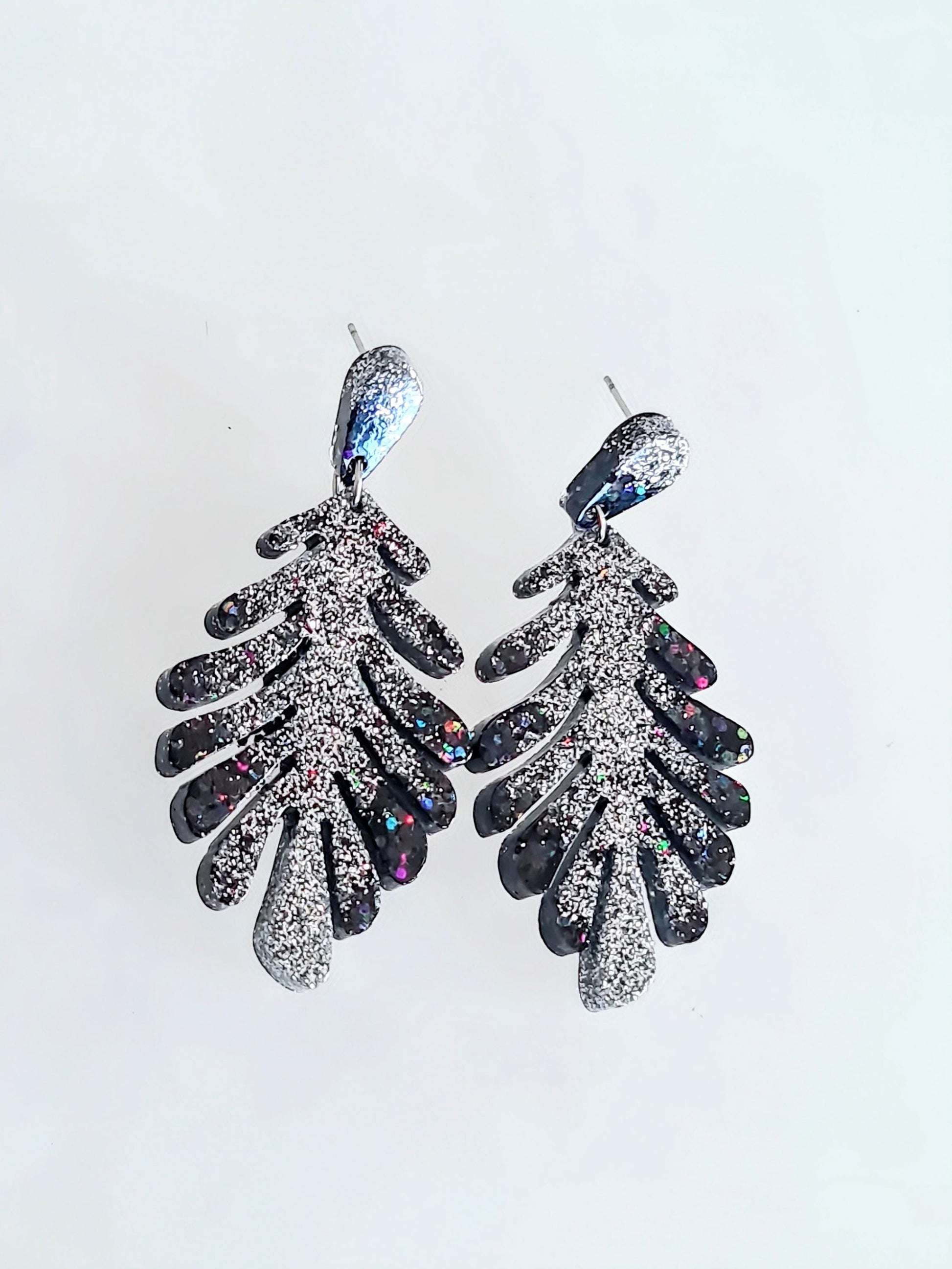 Black Leaves Dangle Drop Earrings, Black & Silver Glitter Resin Leaf Earrings, Bold Statement Jewellery, Gift for her, Hypoallergenic