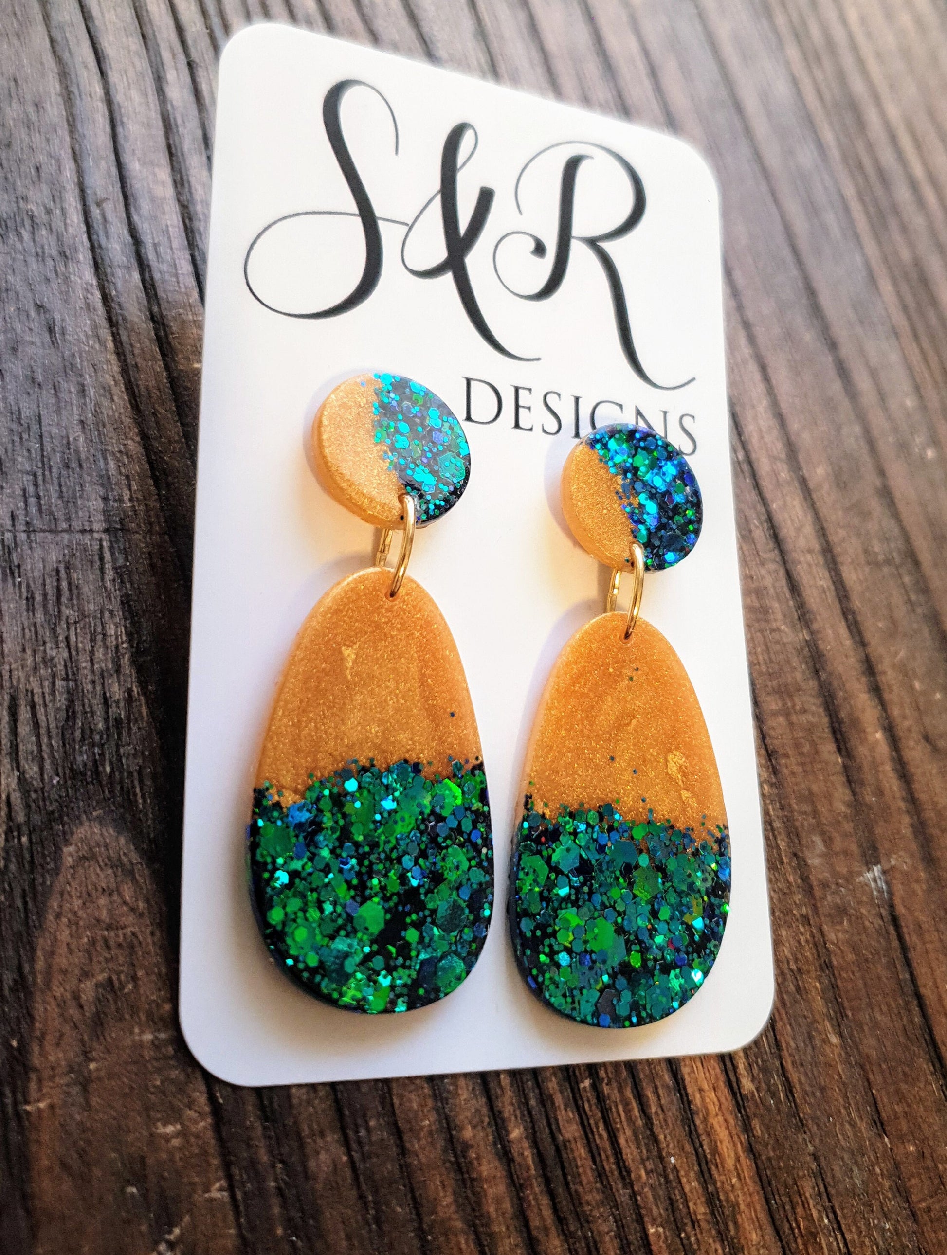 Changing Glitter from Green to blue with gold Oval Organic Shape Drop Dangle Earrings. So sparkly and light on your ears with stainless steel post and butterfly backing, perfect for sensitive ears. Material: Stainless steel, poured resin, glitters.Colour: Green blue and gold Size: 51mm length drop X 22 mm wide.All resin is mixed and poured, sanded and polished and made by me Angie. If you would like different colours please email me.