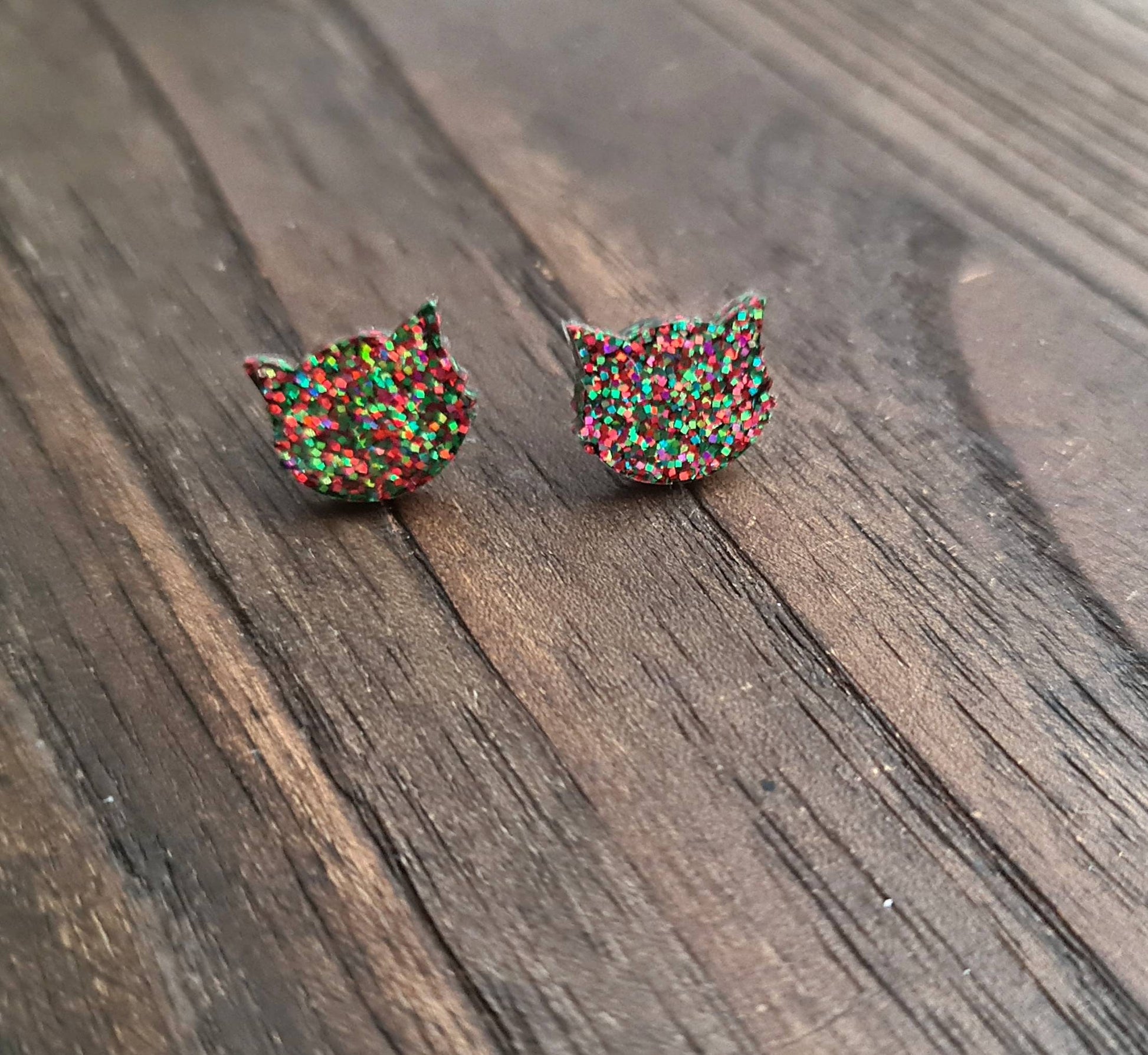 Christmas Cat Earrings, Cat Resin Stud Earrings, Green, Red Earrings, Cat Glitter Earrings made with Stainless Steel.