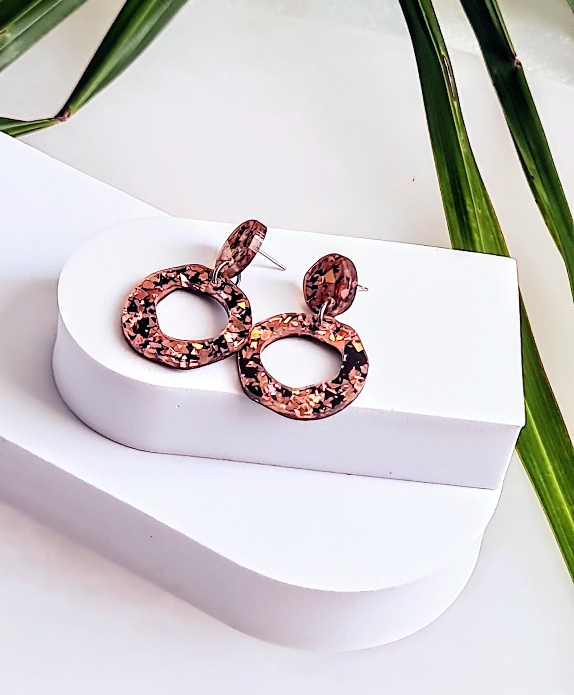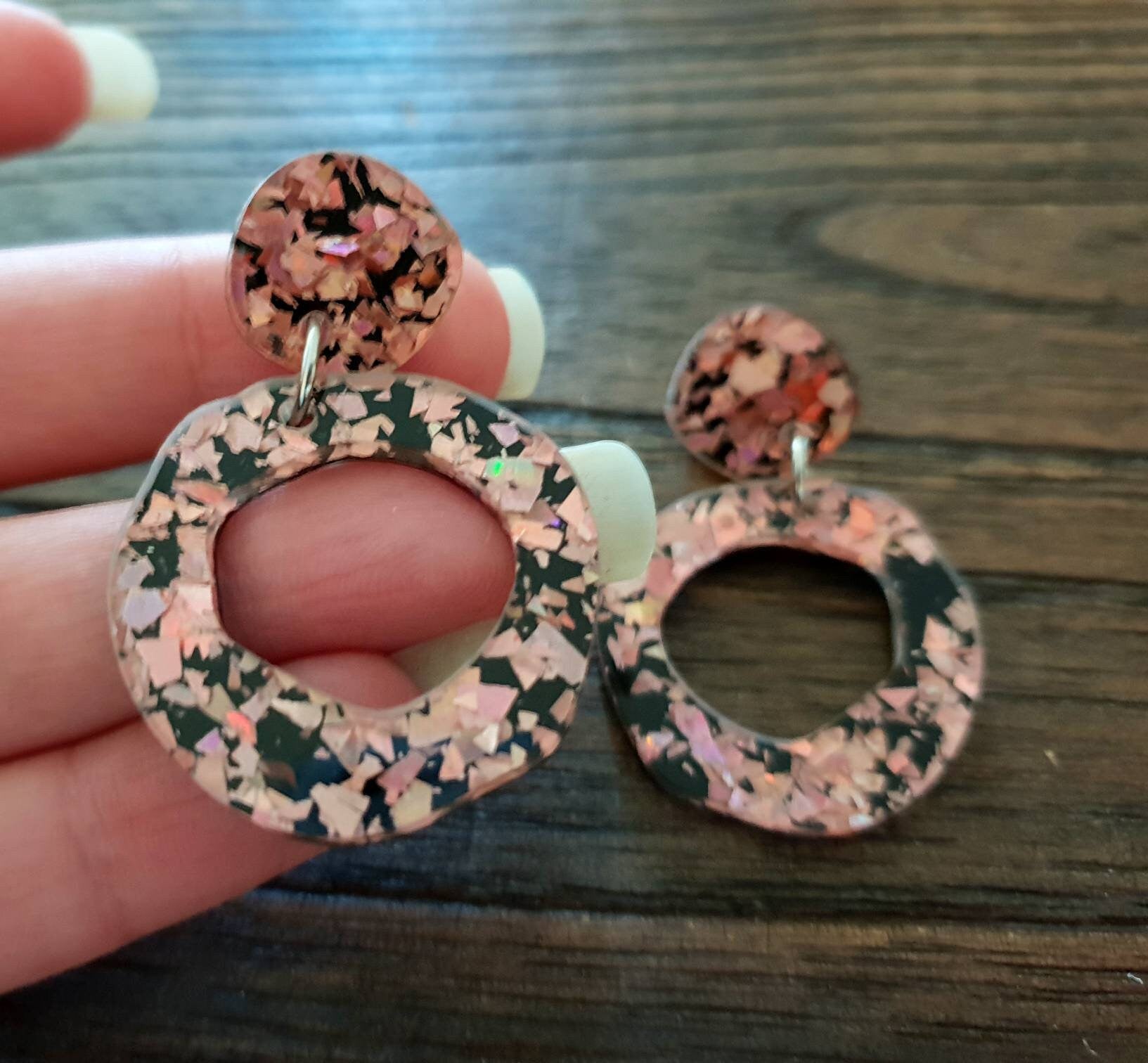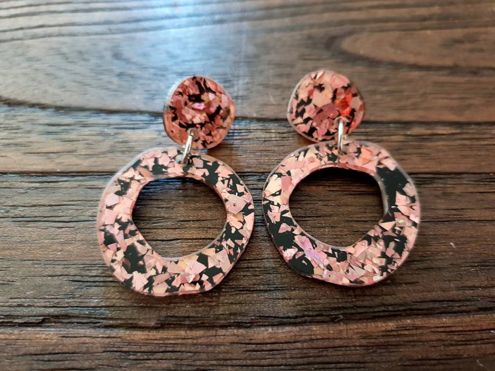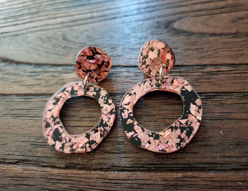 Statement Asymmetric Acrylic Earrings.Material: Stainless steel, acrylic laser cut glitters.Colour: Rose gold and blackSize: 47mm length drop X 30mm wideIf you like light weight comfortable earrings then these are for you. Sparkly you can wear everyday or a night out.All metals are made with stainless steel which is perfect for sensitive ears and never changes colour.