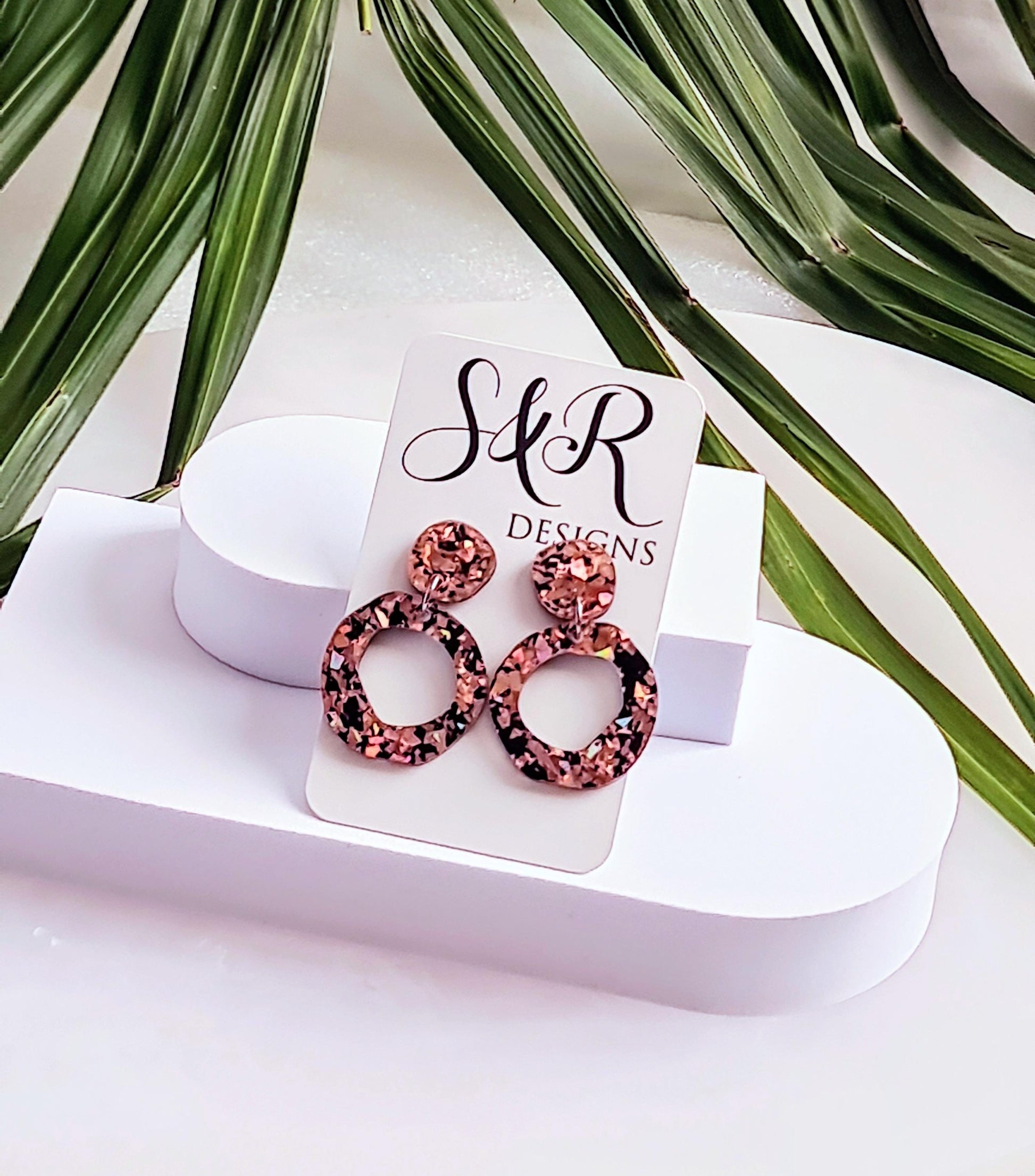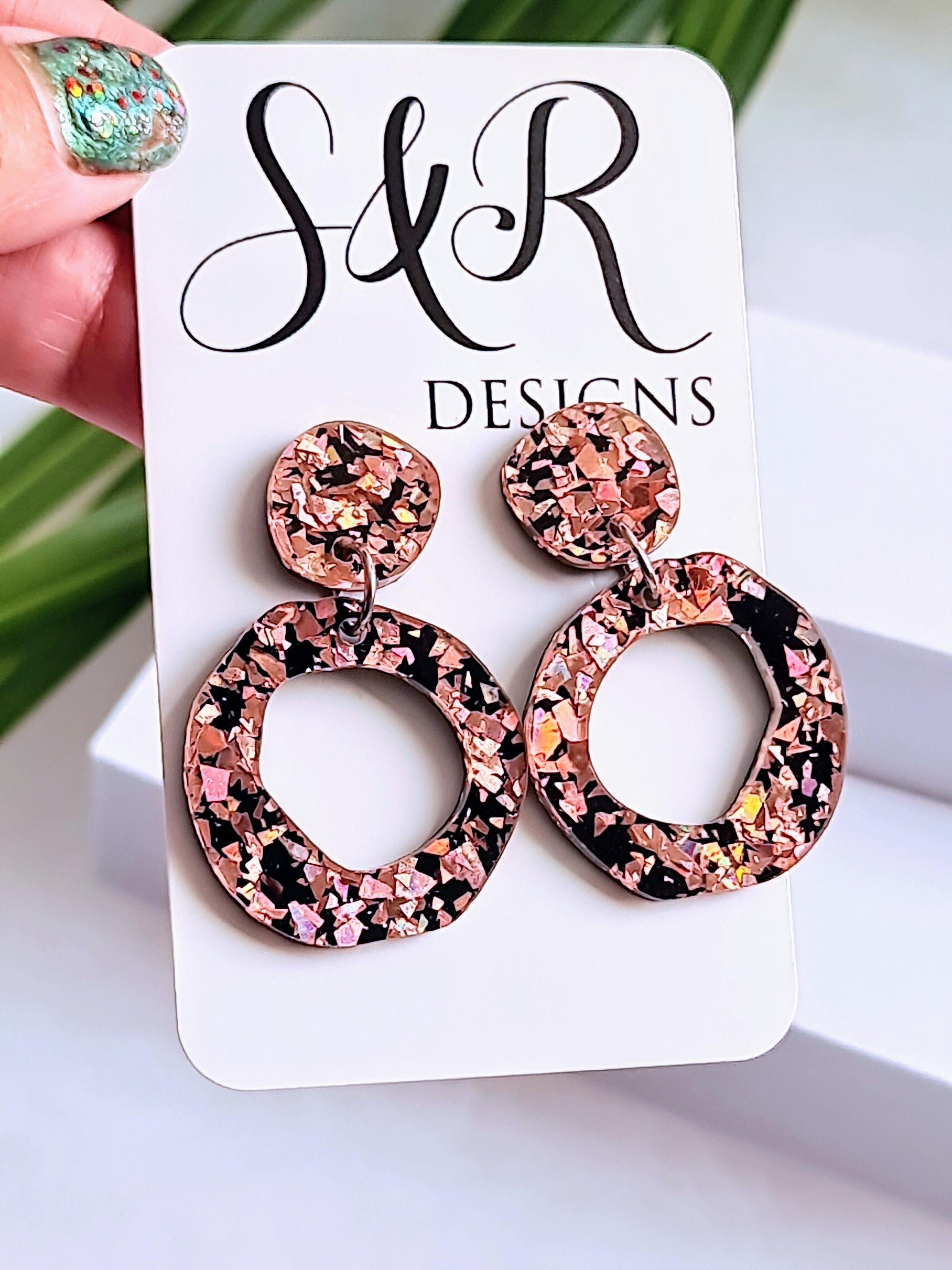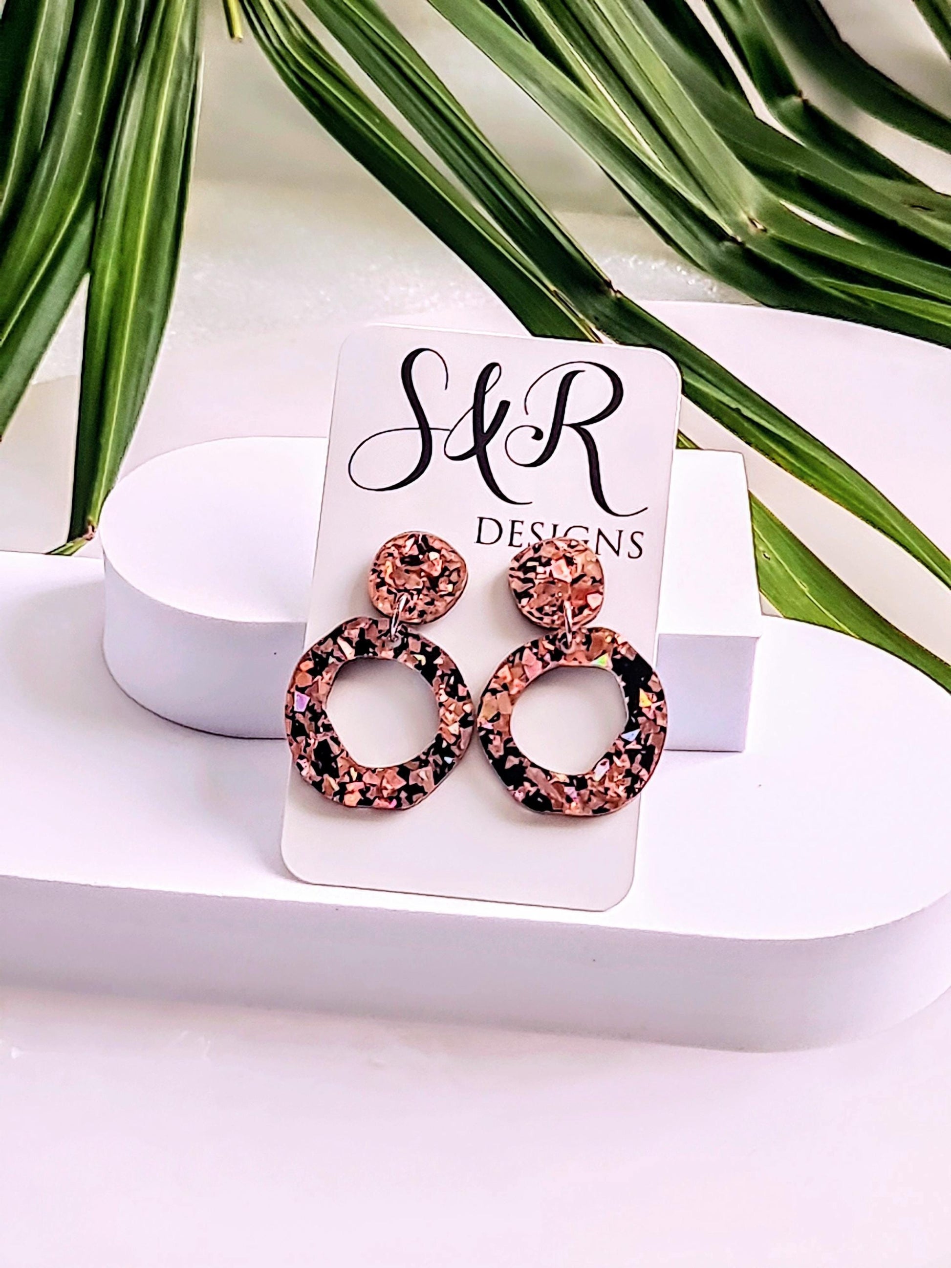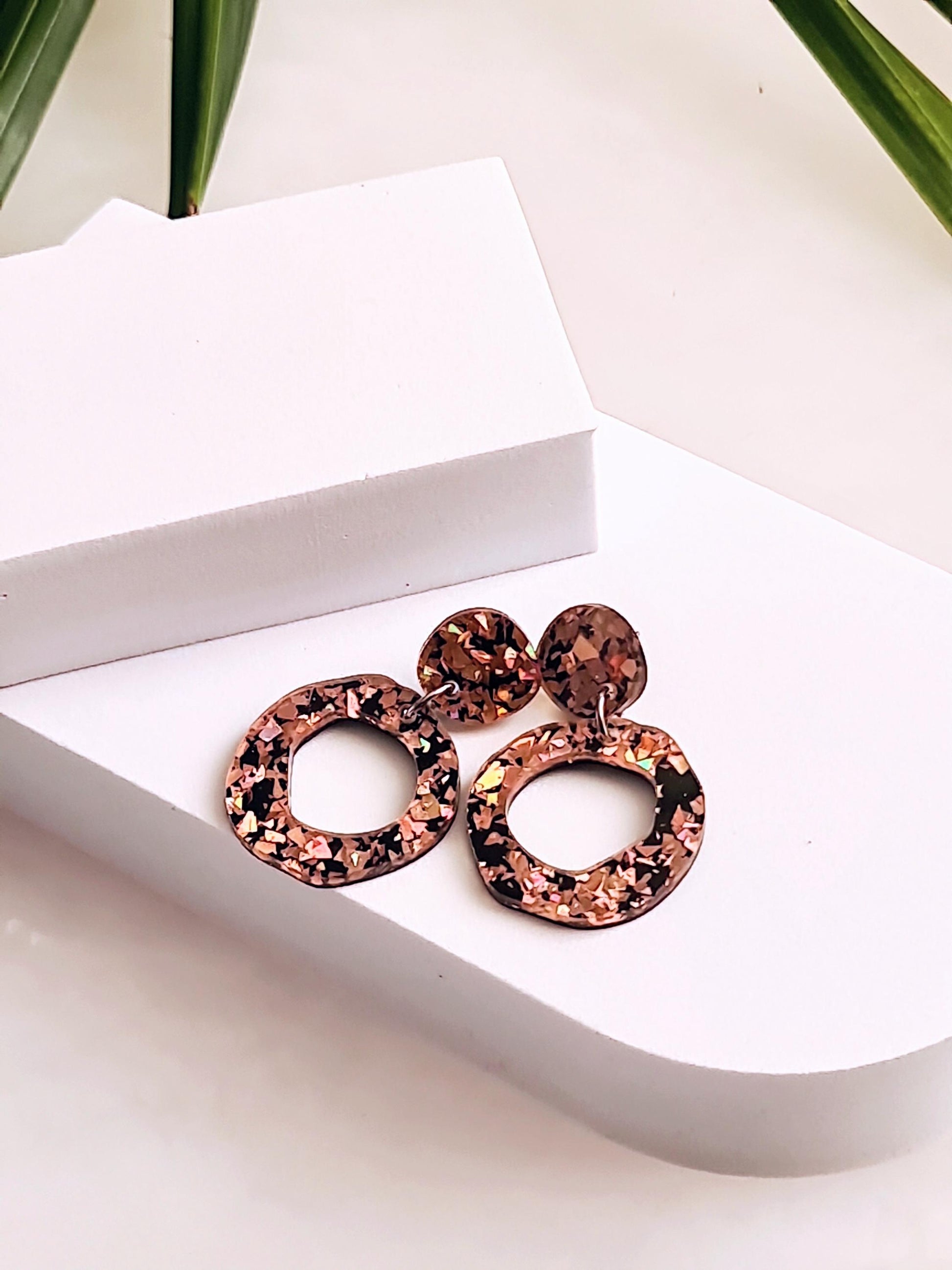 Statement Asymmetric Acrylic Earrings.Material: Stainless steel, acrylic laser cut glitters.Colour: Rose gold and blackSize: 47mm length drop X 30mm wideIf you like light weight comfortable earrings then these are for you. Sparkly you can wear everyday or a night out.All metals are made with stainless steel which is perfect for sensitive ears and never changes colour.