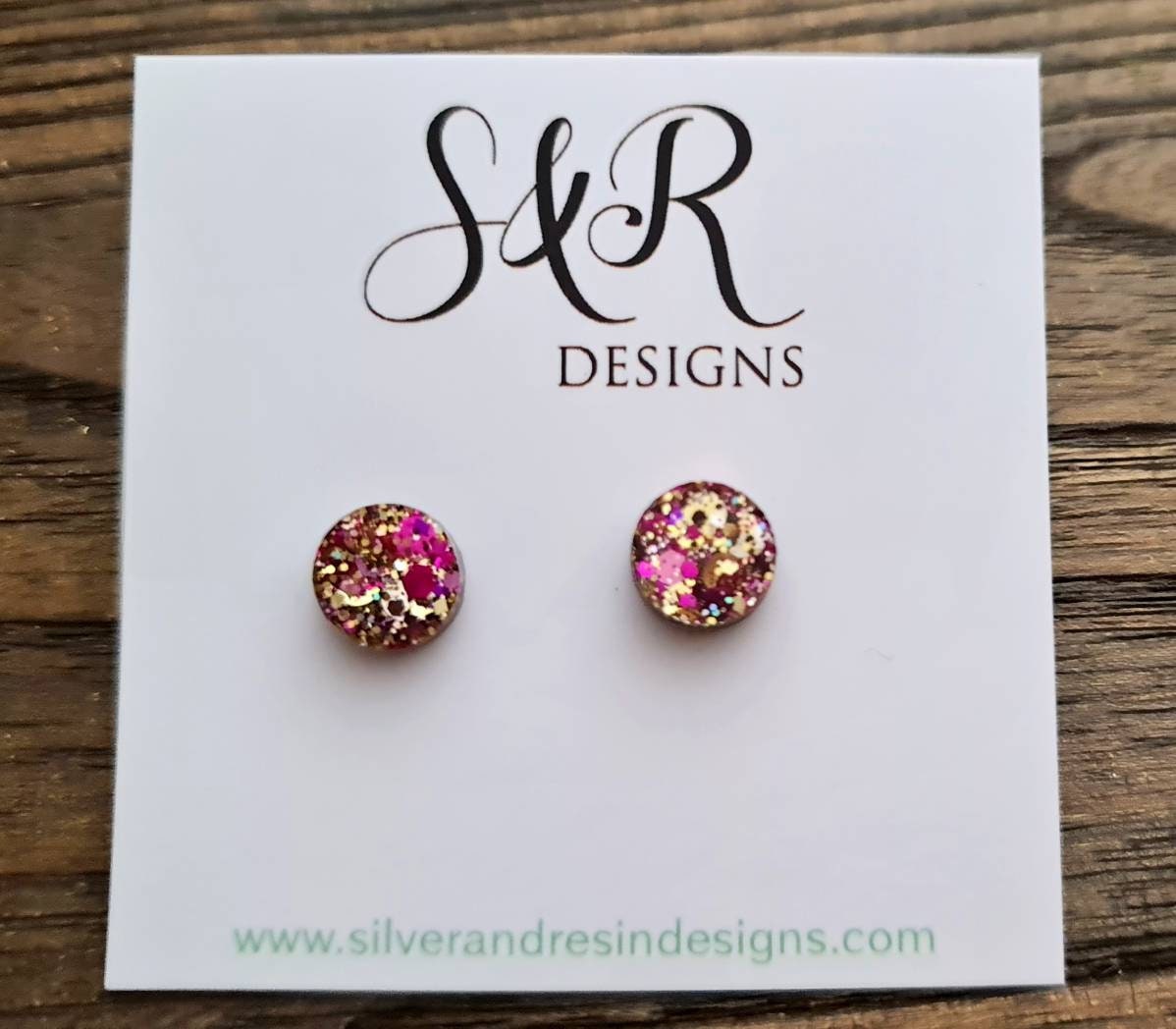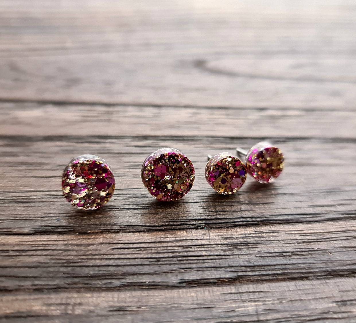 Circle Dot Resin Stud Earrings, Pink Gold Glitter Earrings. Stainless Steel Stud Earrings. 12mm, 10mm or 8mm