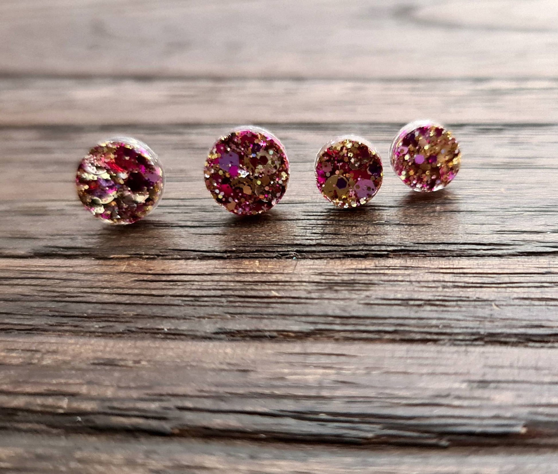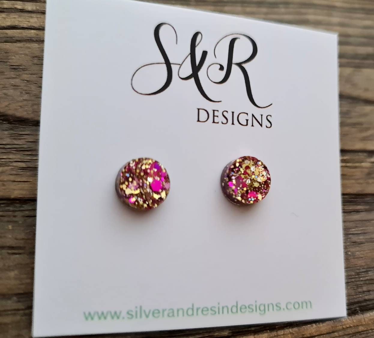 Stunning Circle Dot stud Earrings. Material: Stainless steel, poured resin, glitters and colours.Colour: pink, gold glitterSize: 10mm length X 10 mm wide, 12mm x 12mm or 8mm X 8mmAll resin is mixed and poured, sanded and polished and made by me Angie. If you would like different colours please email me.
