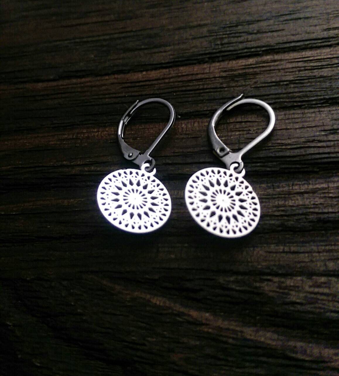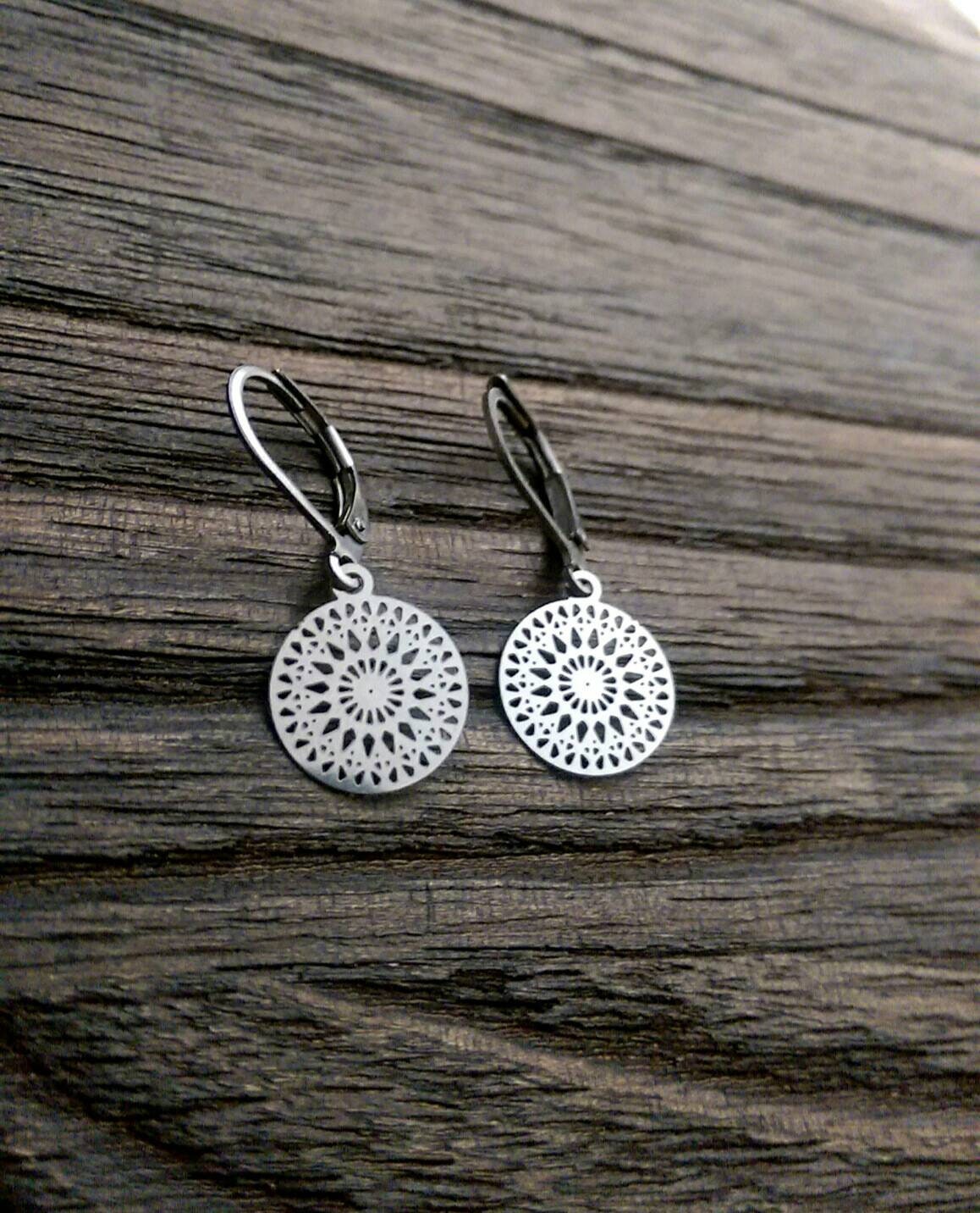 Circle Filigree Silver Earrings, Stainless Steel Dangle Leverback Earrings.