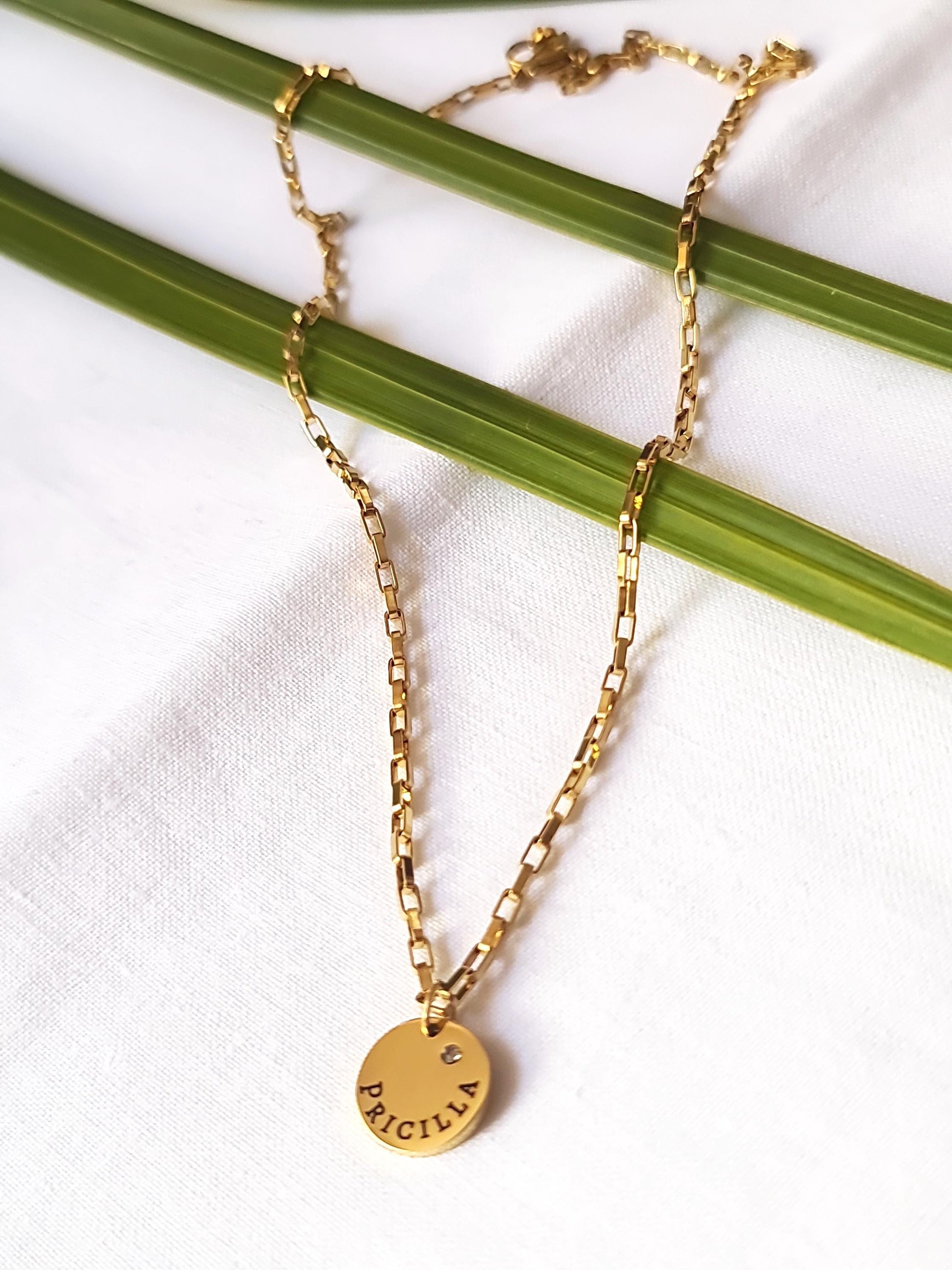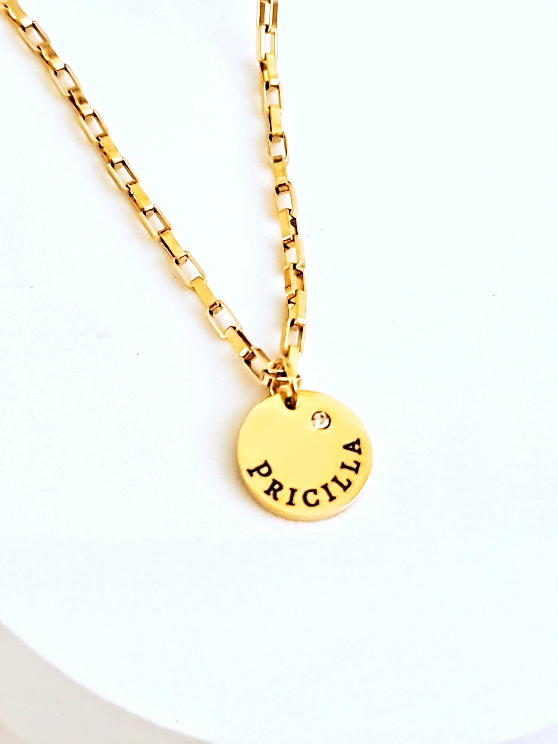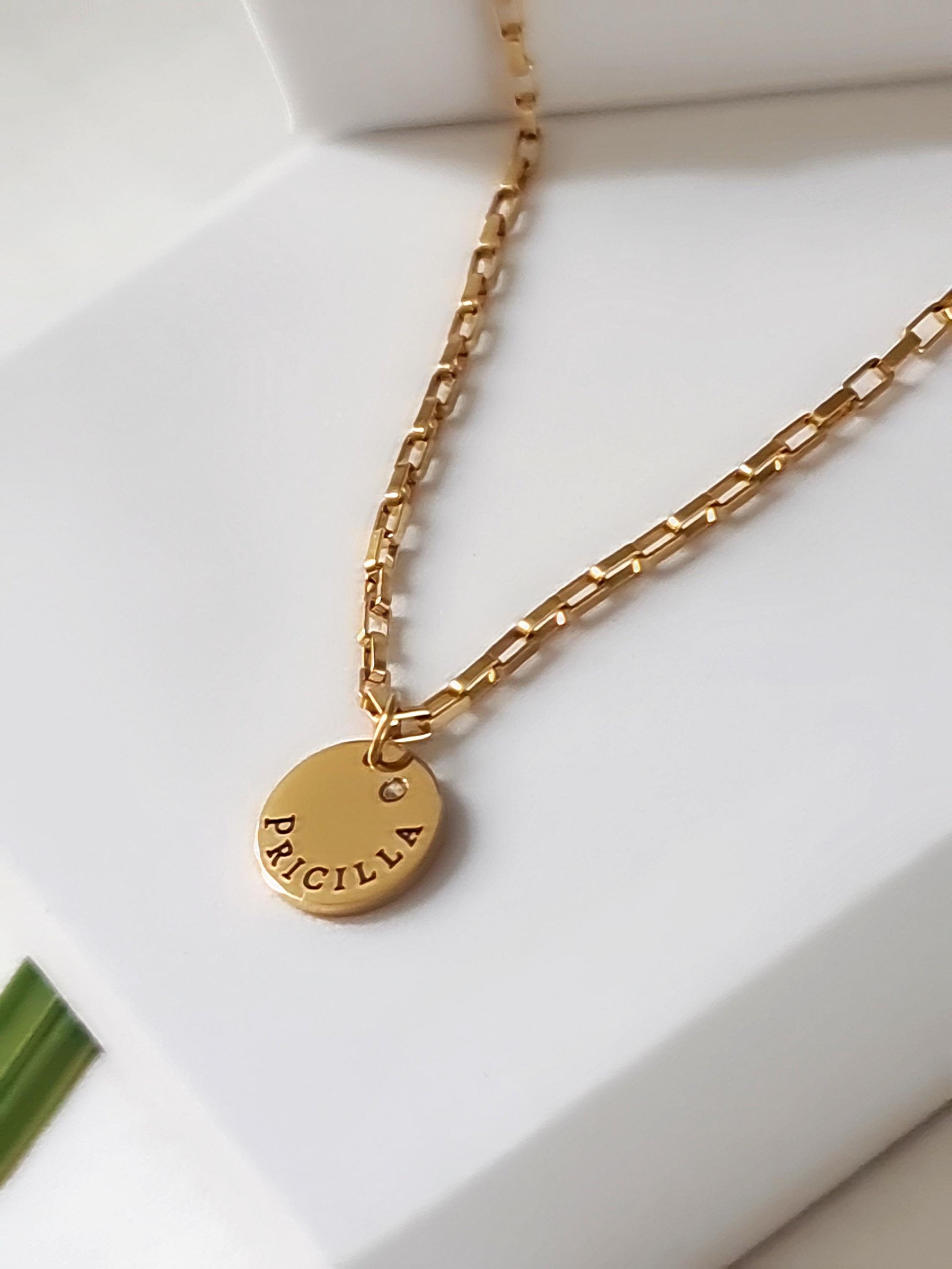 Elongated box chain with a beautiful personalised circle disc with name , initial, word or dateStainless Steel Hand Stamped Personalised Disc Necklace Design Necklace 12mmSize: 12mm Height x 12mm Width 2mm ThickMade from high quality 316L Stainless Steel, with a shiny mirror finish.Colours: Stainless steel 316 or 18ct Yellow Gold with clear Cubic Zirconia This design can be laser engraved with name, numbers or initials.Chain Length: 18" 46cm, 20" 51cm, 24" 61cmYour necklace will be made and posted out 1-3 days, will email you straight away if there is any delay. If you have any questions please do not hesitate to contact me. Stainless Steel is hypo allergenic, it doesn’t rust, change colour or tarnish. The process used to colour the Yellow Gold and Rose Gold pieces is called IP Plating (Ion Plating). The centre of the circle is stainless steel and the outside has a layer of titanium oxide, which can be used as a pigment (yellow gold and rose gold) and has the same non allergenic properties as stainless steel. The process turns the titanium oxide into electric ions which becomes harder and more durable coating with a higher brightness than that produced through traditional plating methods.