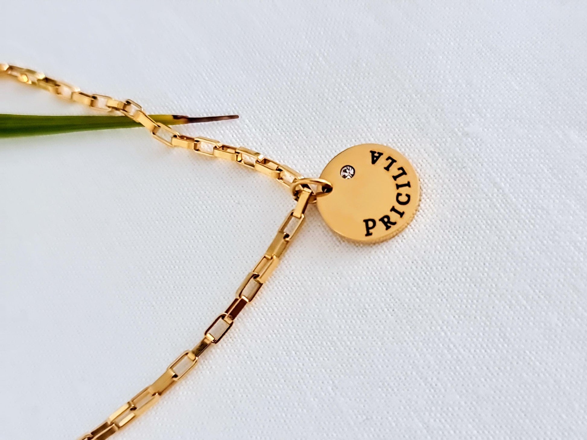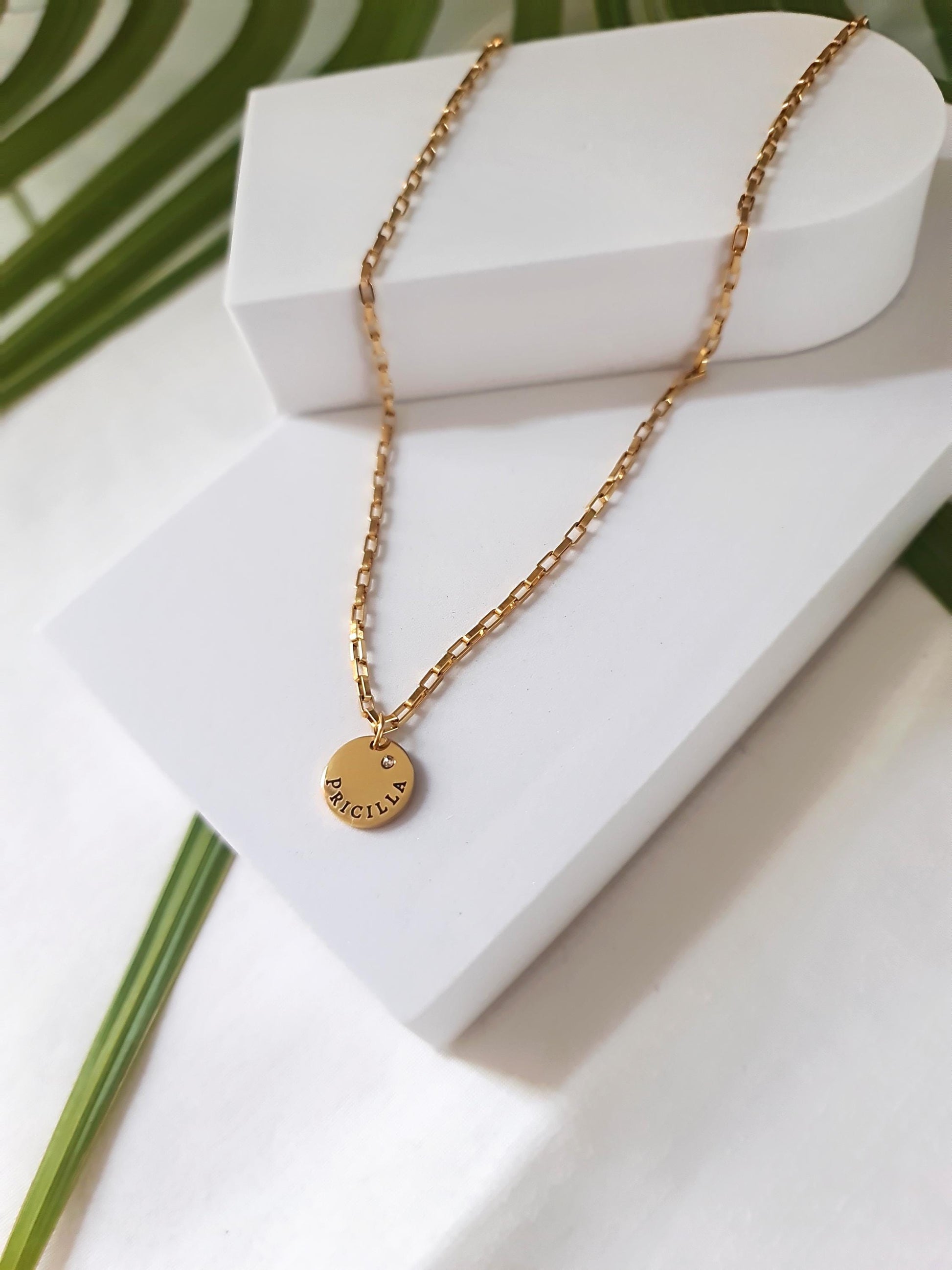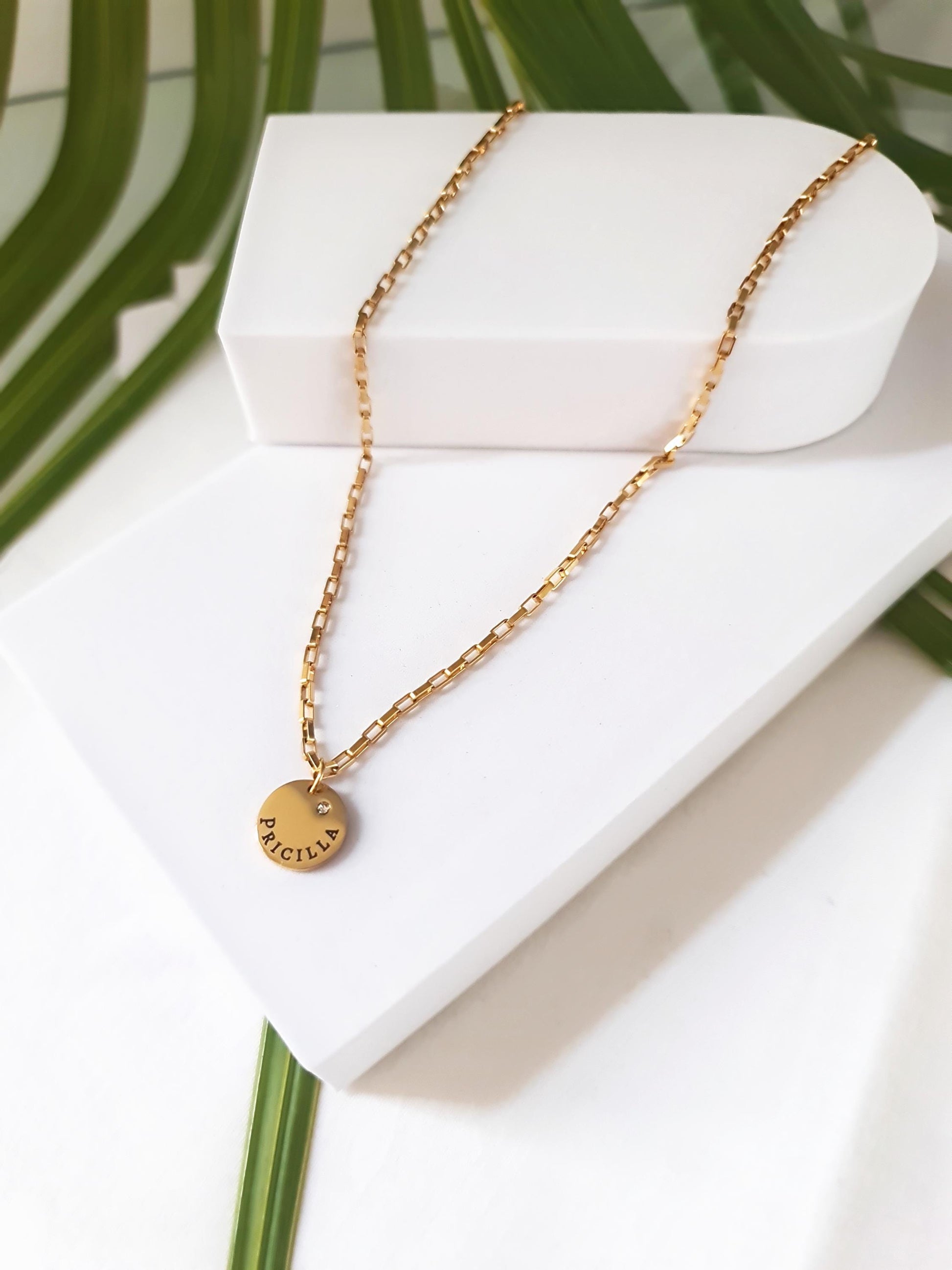 Elongated box chain with a beautiful personalised circle disc with name , initial, word or dateStainless Steel Hand Stamped Personalised Disc Necklace Design Necklace 12mmSize: 12mm Height x 12mm Width 2mm ThickMade from high quality 316L Stainless Steel, with a shiny mirror finish.Colours: Stainless steel 316 or 18ct Yellow Gold with clear Cubic Zirconia This design can be laser engraved with name, numbers or initials.Chain Length: 18" 46cm, 20" 51cm, 24" 61cmYour necklace will be made and posted out 1-3 days, will email you straight away if there is any delay. If you have any questions please do not hesitate to contact me. Stainless Steel is hypo allergenic, it doesn’t rust, change colour or tarnish. The process used to colour the Yellow Gold and Rose Gold pieces is called IP Plating (Ion Plating). The centre of the circle is stainless steel and the outside has a layer of titanium oxide, which can be used as a pigment (yellow gold and rose gold) and has the same non allergenic properties as stainless steel. The process turns the titanium oxide into electric ions which becomes harder and more durable coating with a higher brightness than that produced through traditional plating methods.