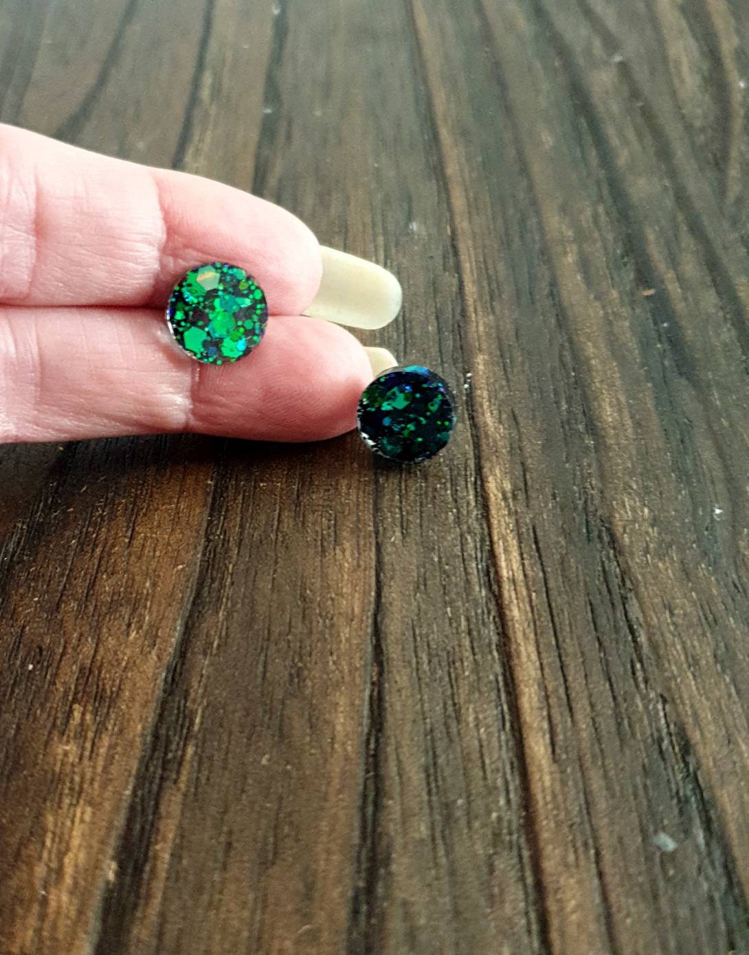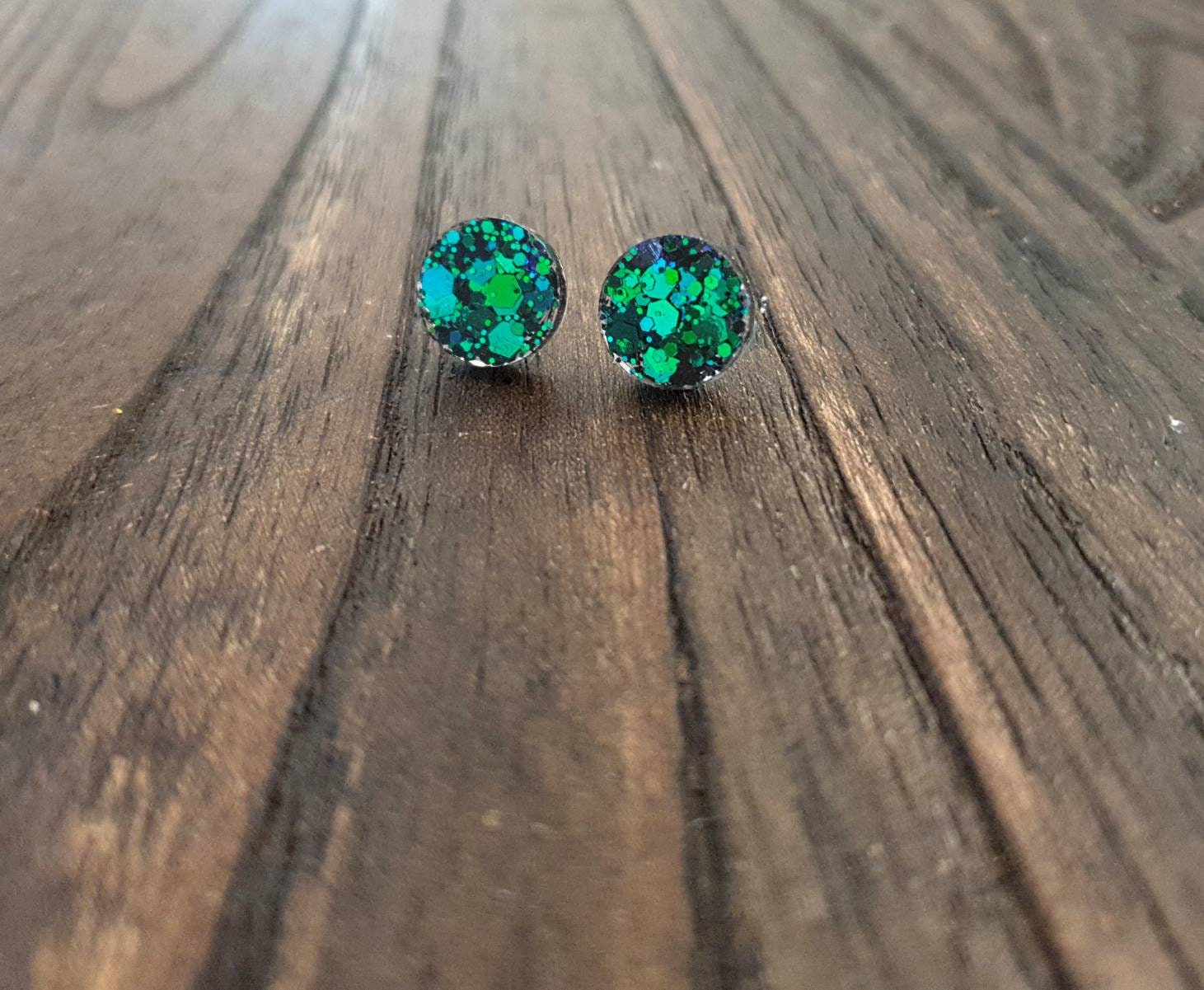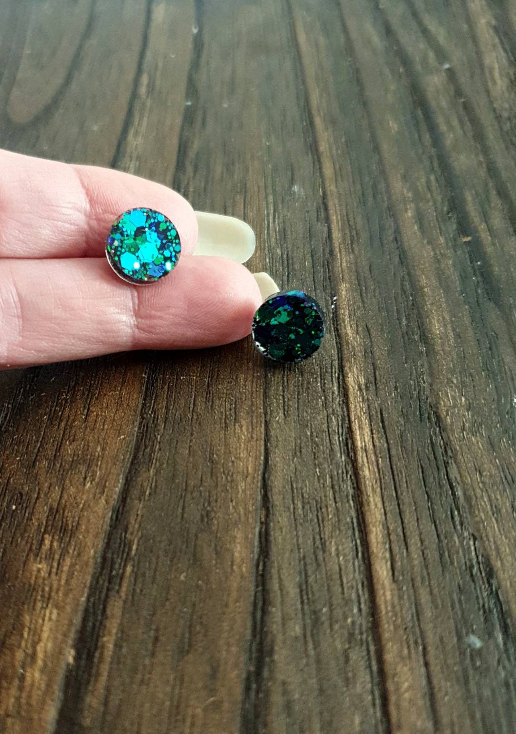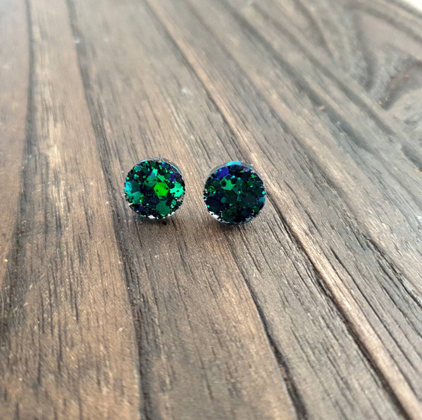 Emerald Green Blue Chameleon Circle Dot stud Earrings. Material: Stainless steel, poured resin, glitters and colours.Colour: Emerald green Blue mix glitterSize: 10mm length X 10 mm wide,