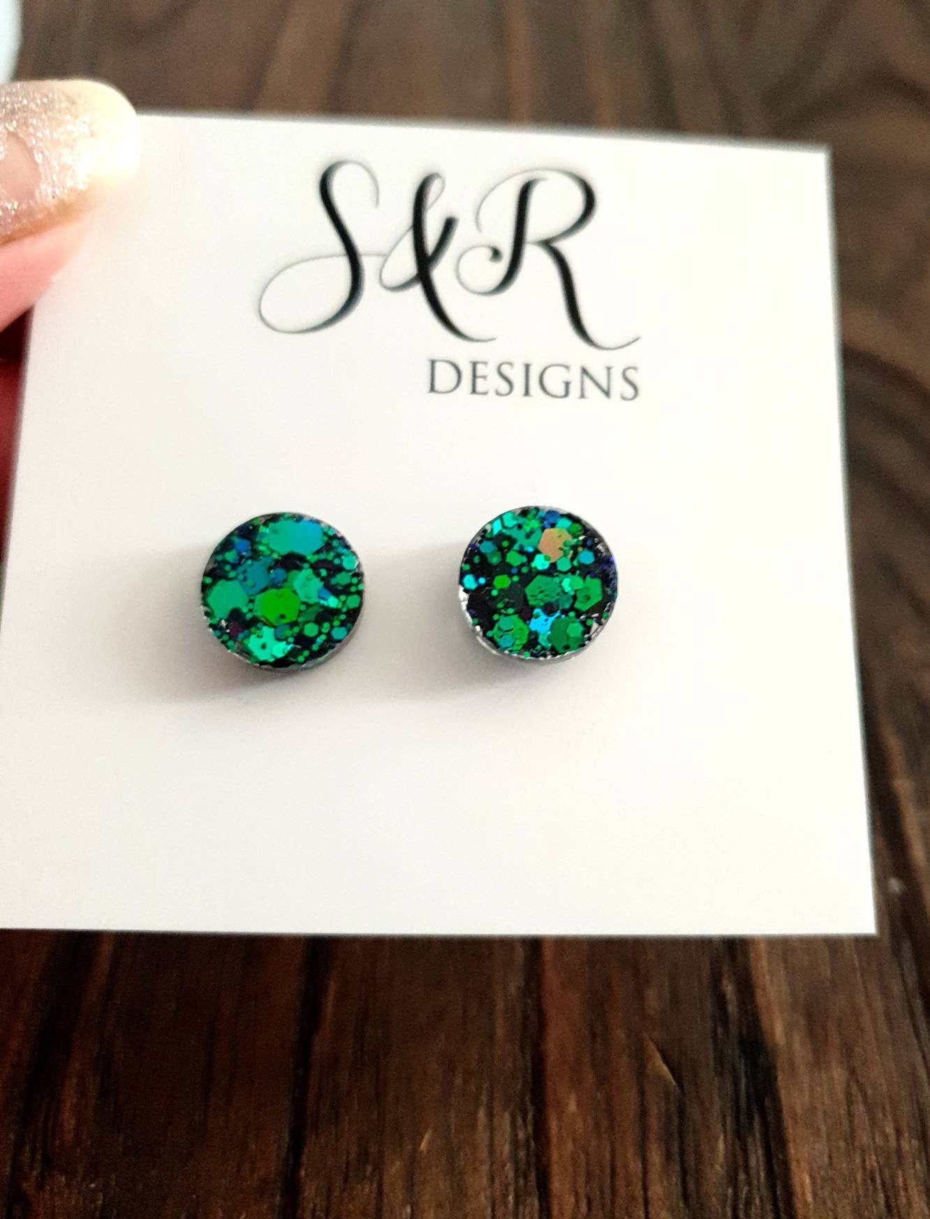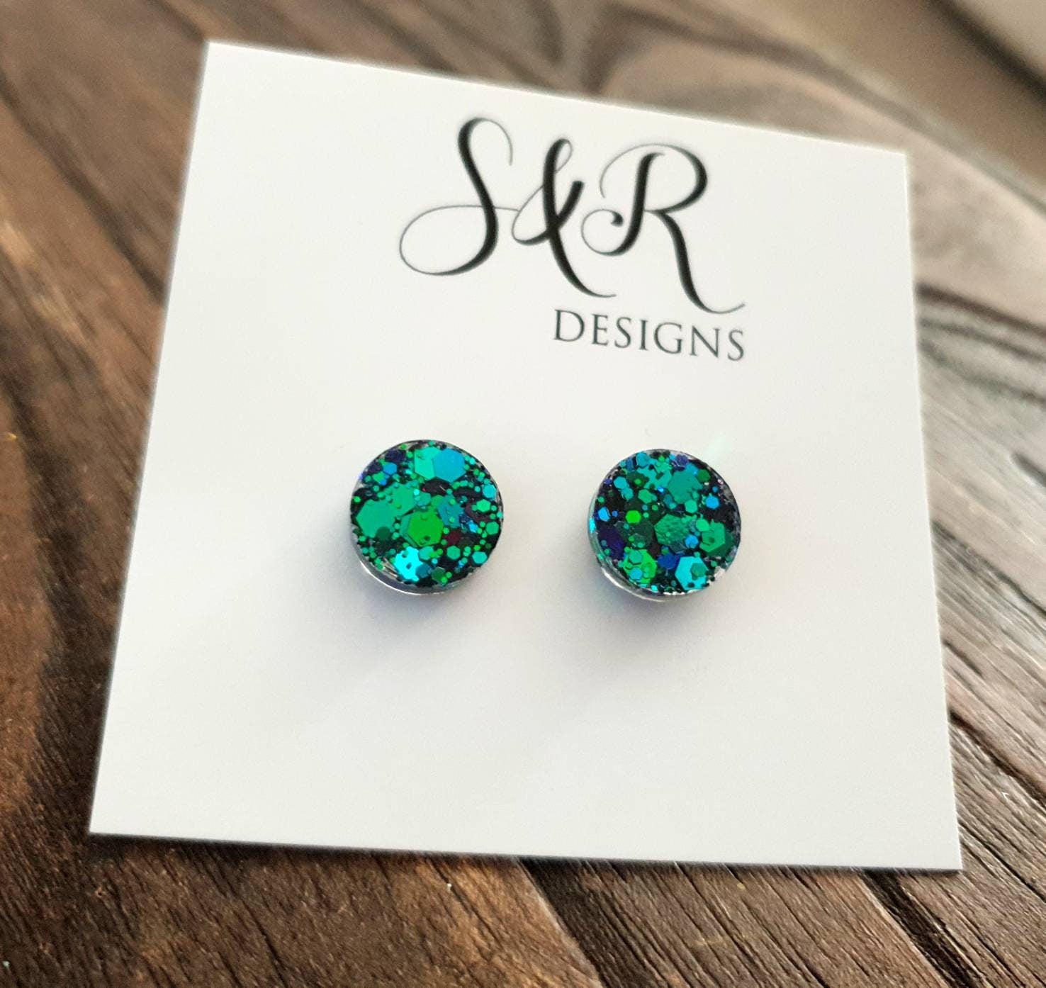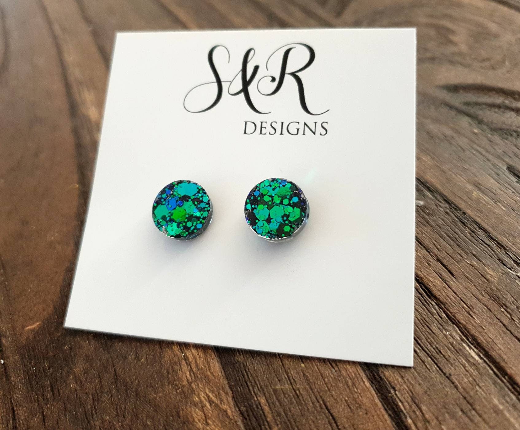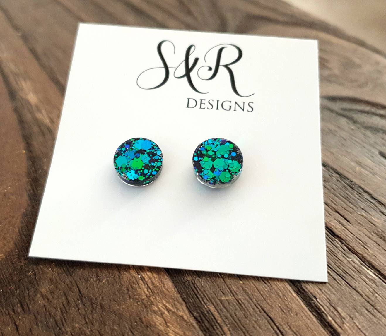 Emerald Green Blue Chameleon Circle Dot stud Earrings. Material: Stainless steel, poured resin, glitters and colours.Colour: Emerald green Blue mix glitterSize: 10mm length X 10 mm wide,