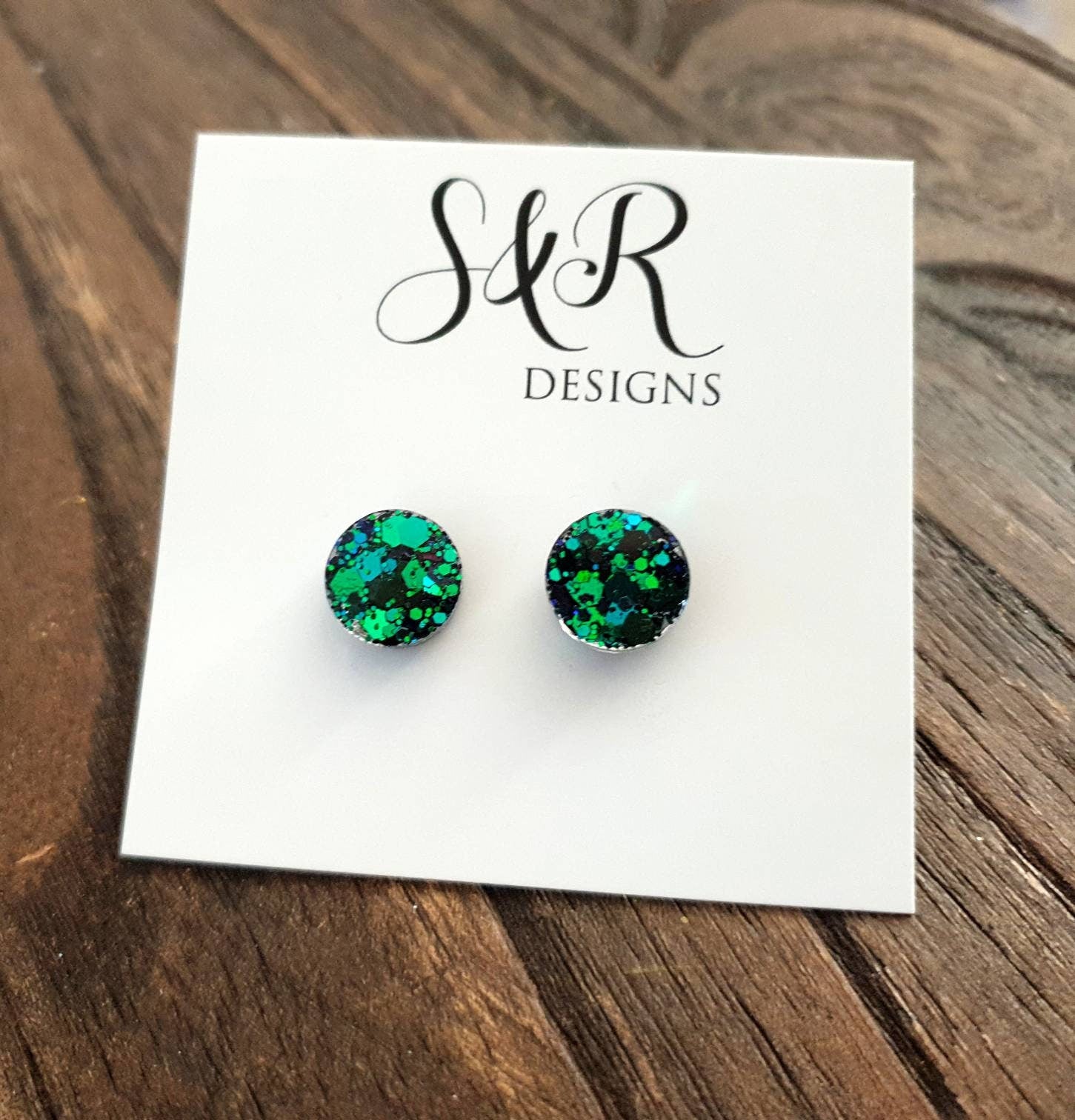 Emerald Green Blue Circle Dot Resin Stud Earrings, Chameleon Glitter Earrings. Stainless Steel Minimalist Studs. 15mm, 12mm, 10mm or 8mm