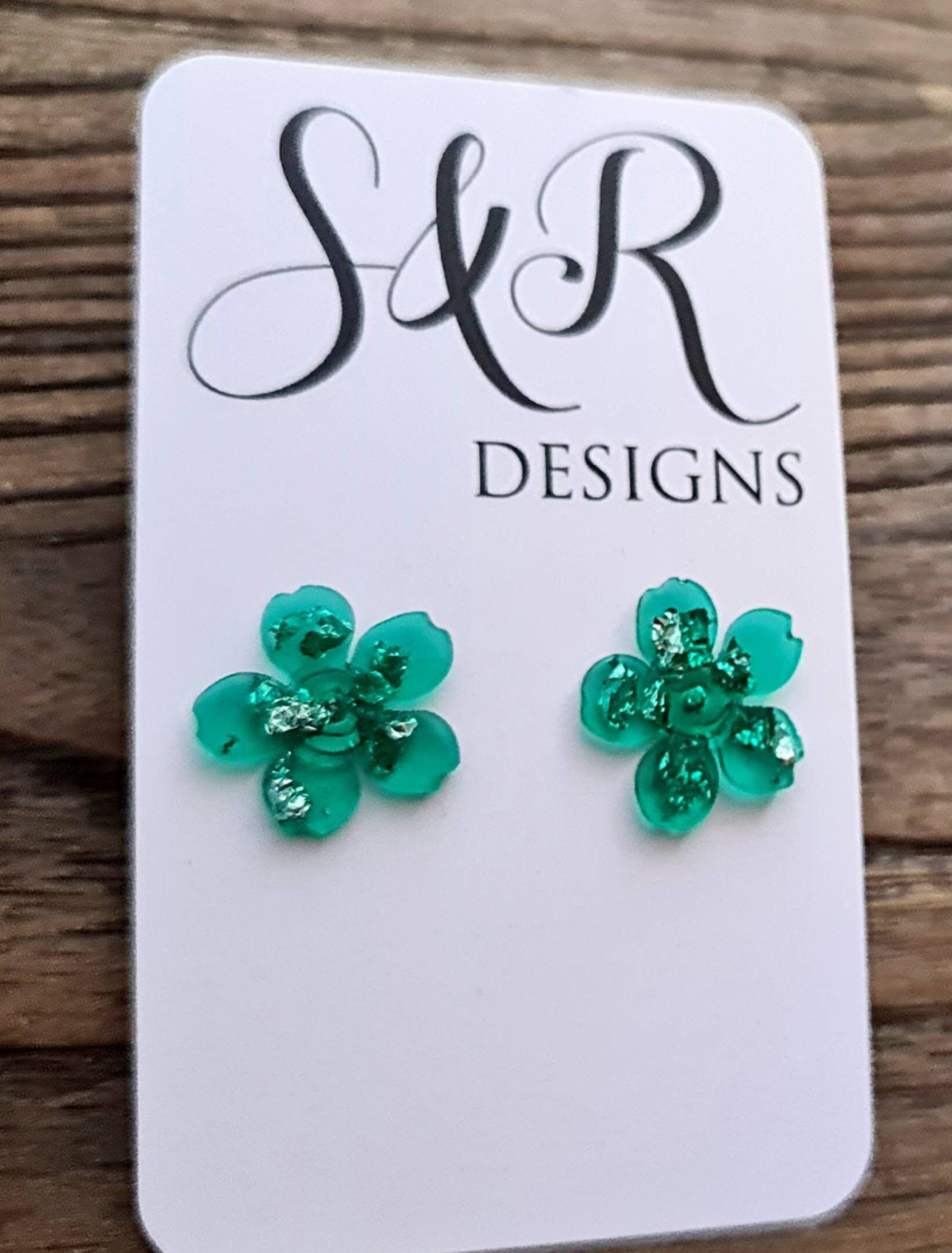 Beautiful Flower Resin Sparkly Glitter Earrings.Material: stainless steel or titanium & poured resin, glitter mixColour: green and silver leaf Size: 20mm X 18mmComes with stainless steel post and butterfly backing.