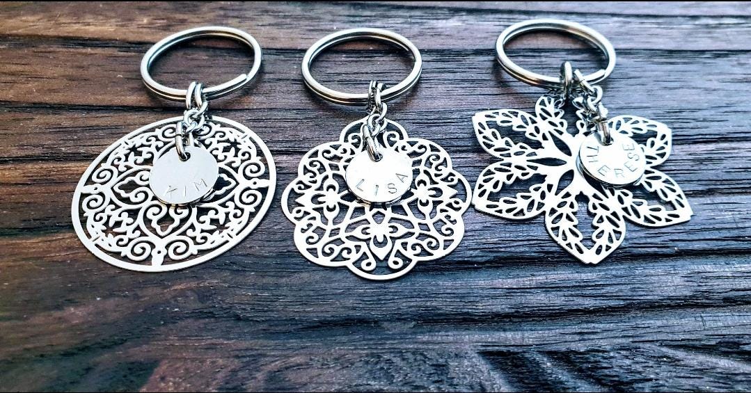 Flower Keyring, Filigree Personalised Hand Stamped Key Ring Stainless Steel, Gift
