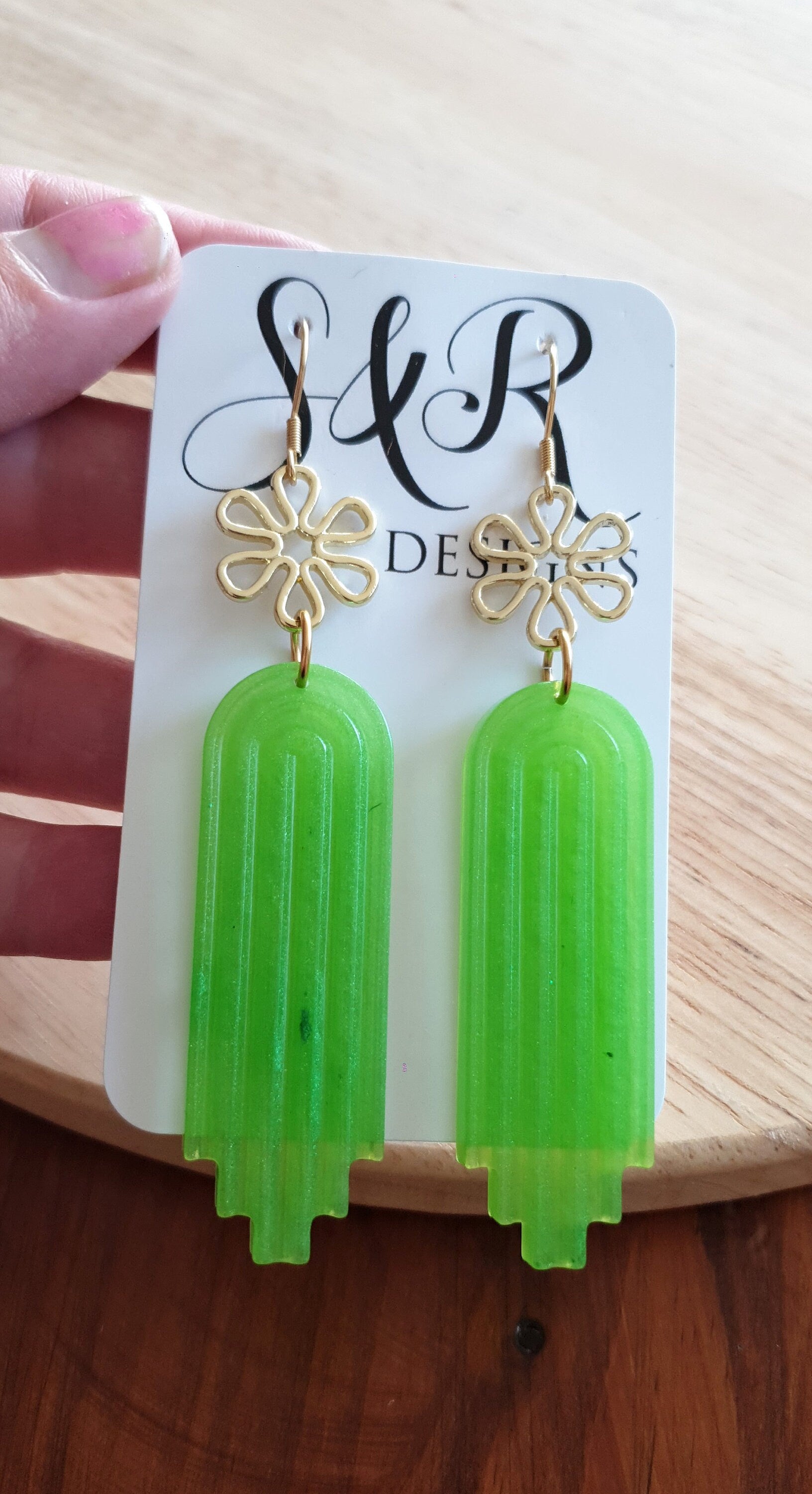 Gold Daisy Flower and Lime Green Dangle Drop Hook Earrings, Statement Handmade Resin Stainless Steel Earwire Dangles.