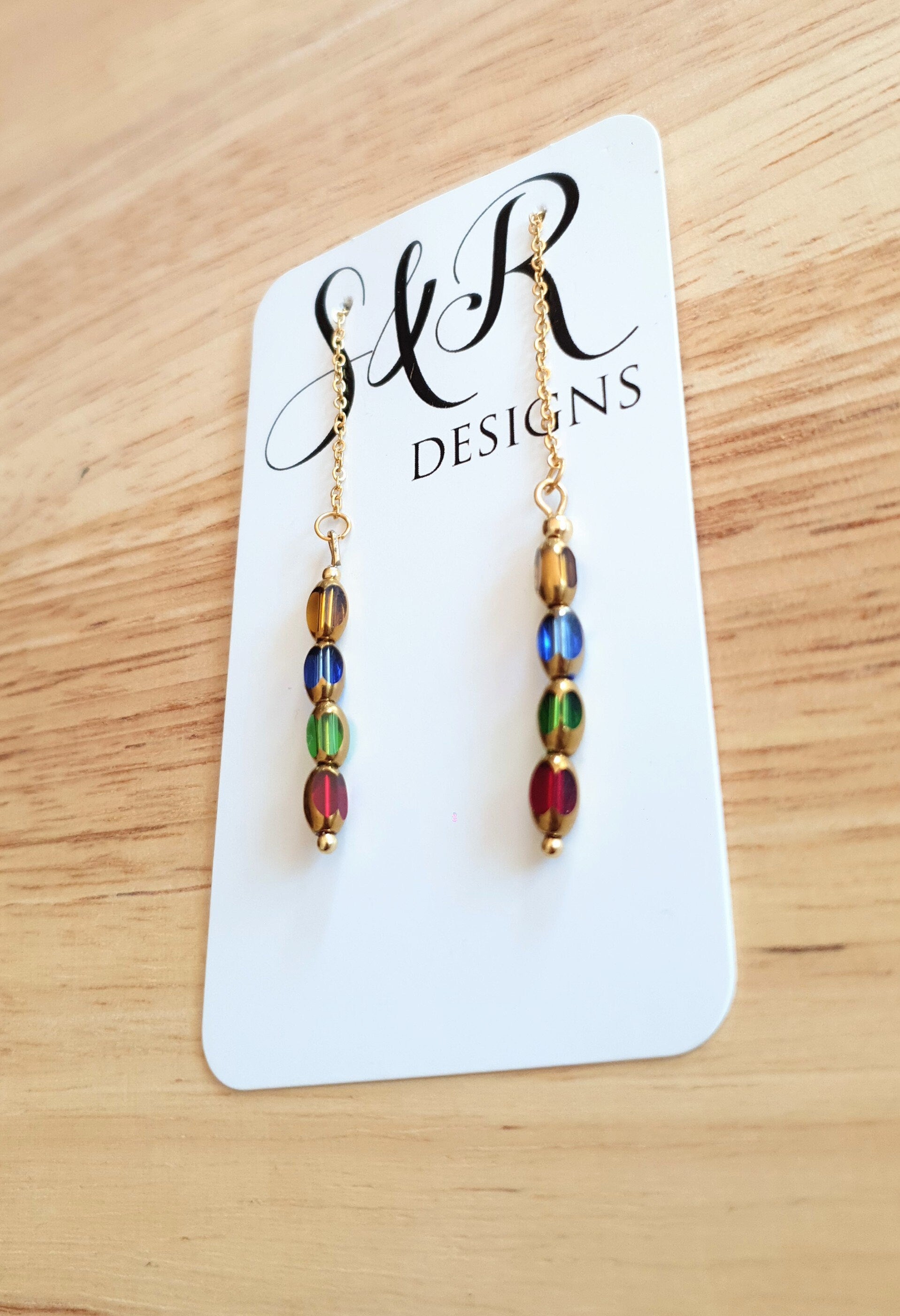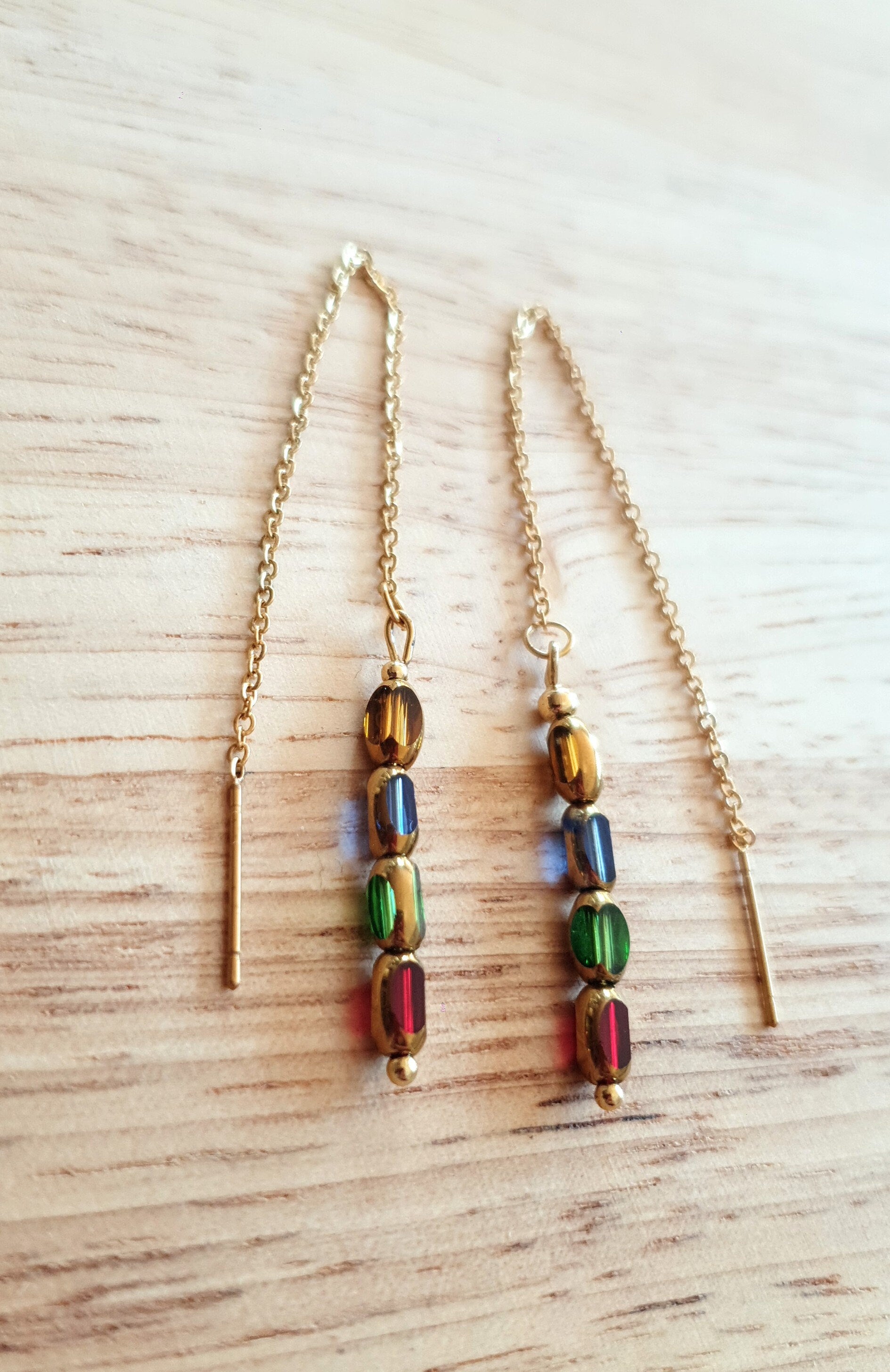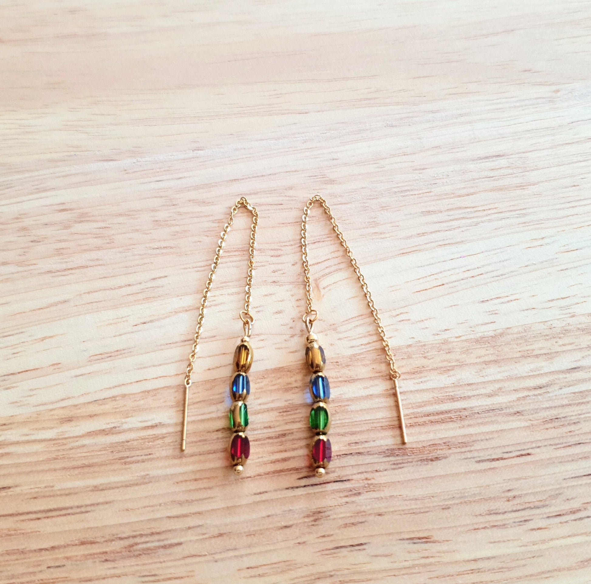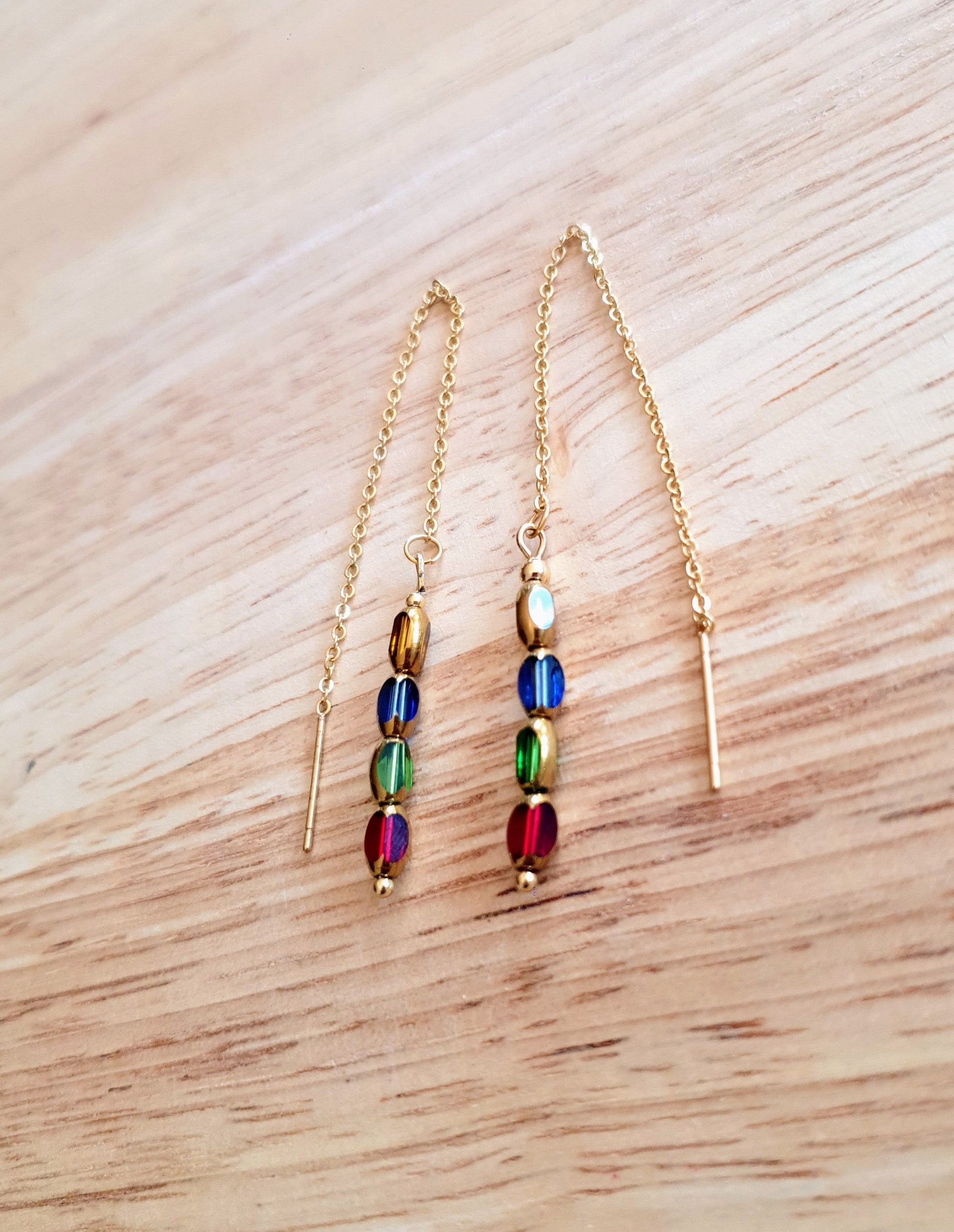 Gold Threaders, Multicoloured Glass Beaded Threaders Drop Earrings, Stainless Steel with Red Green, Blue and Yellow Gold Glass Beads