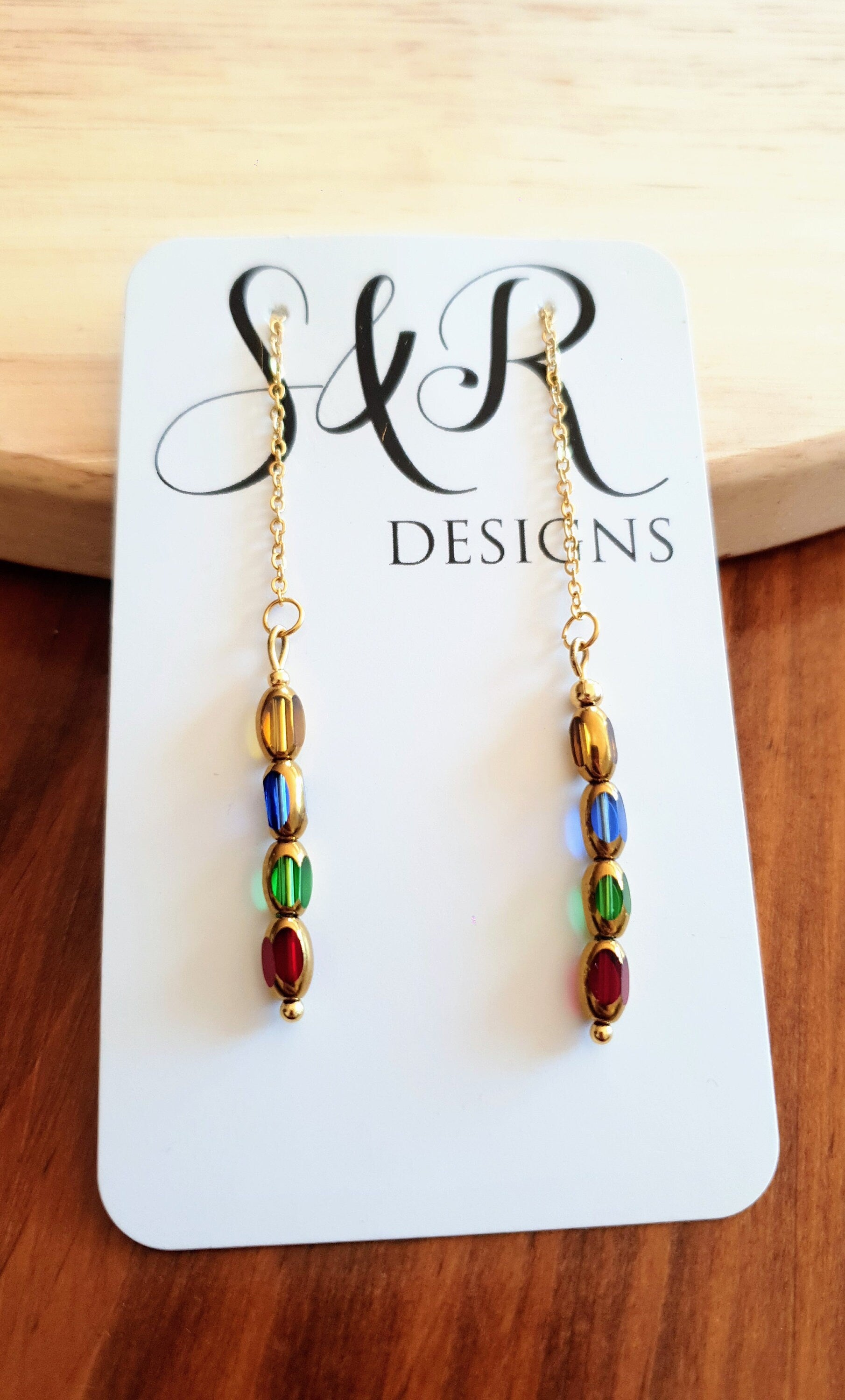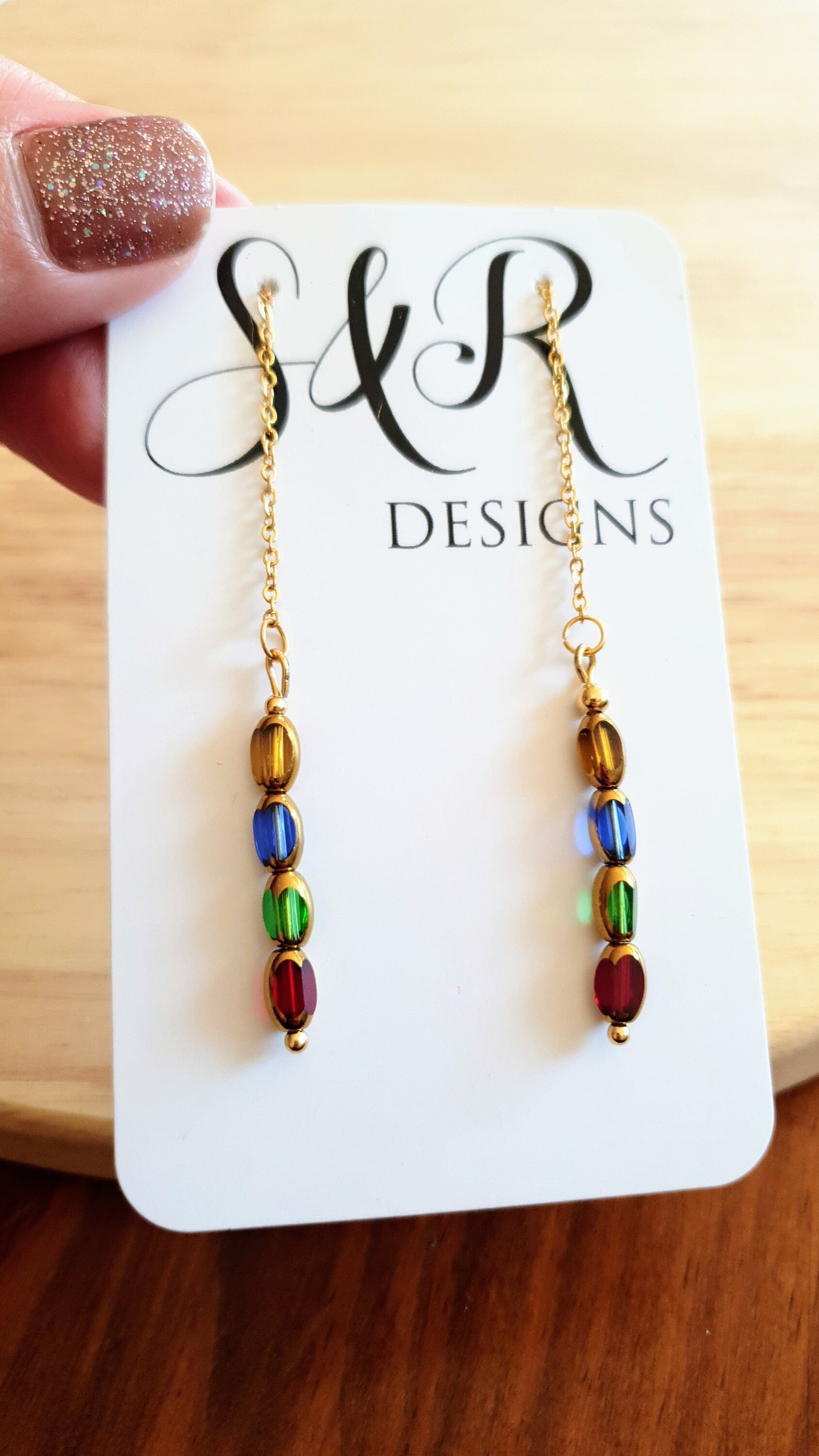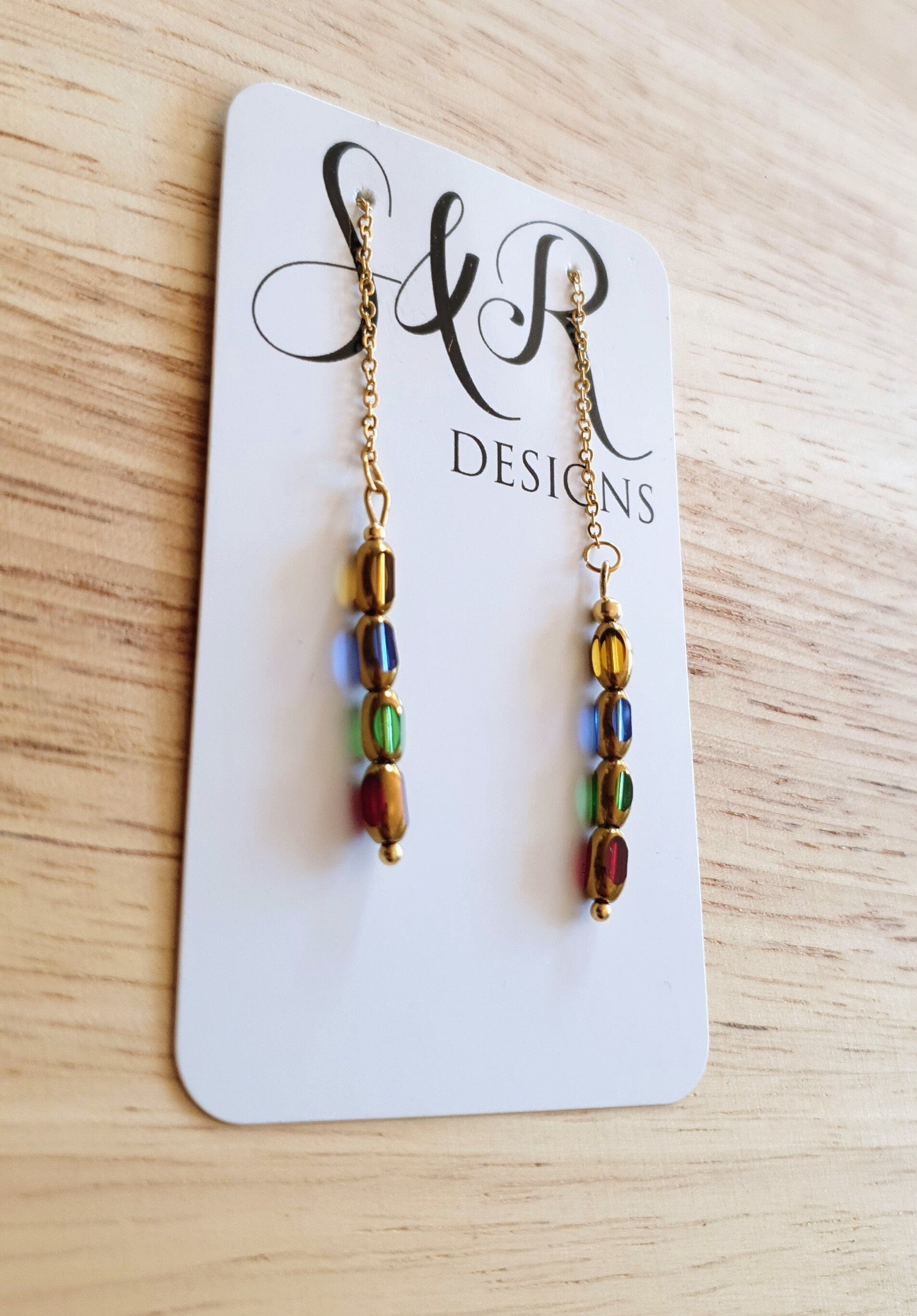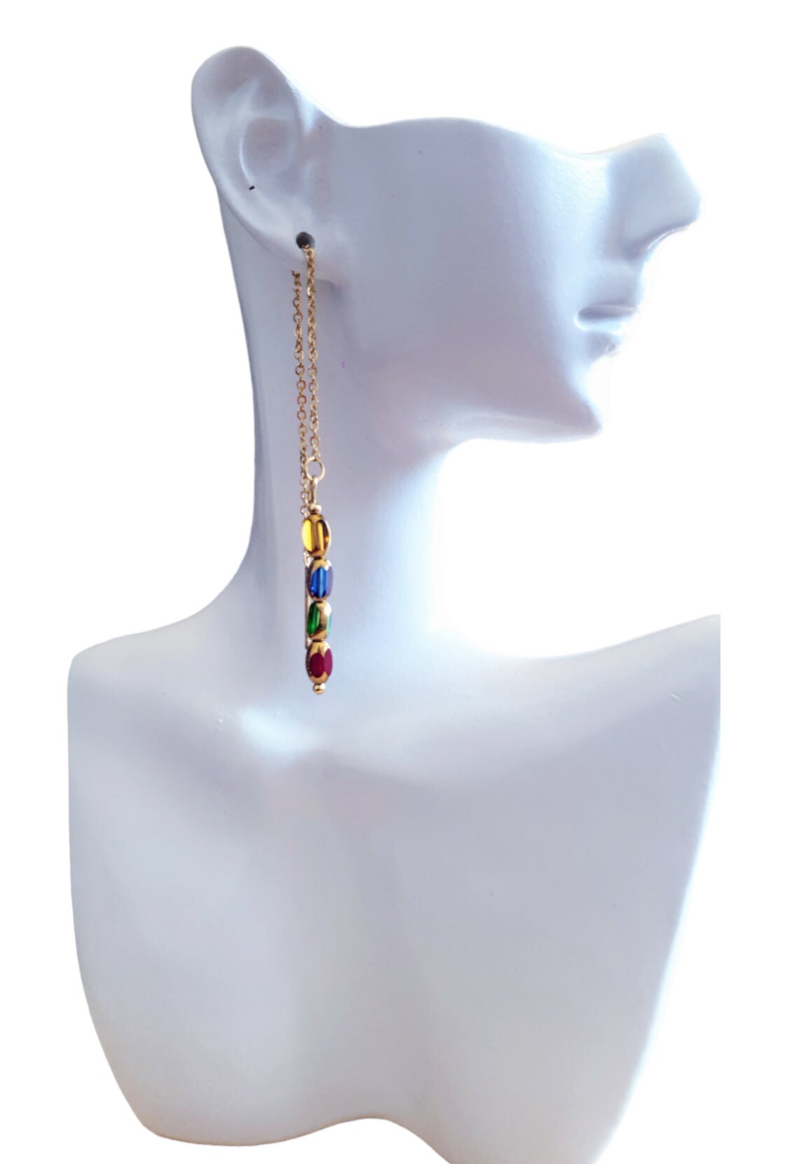 Gold Threaders, Multicoloured Glass Beaded Threaders Drop Earrings, Stainless Steel with Red Green, Blue and Yellow Gold Glass Beads
