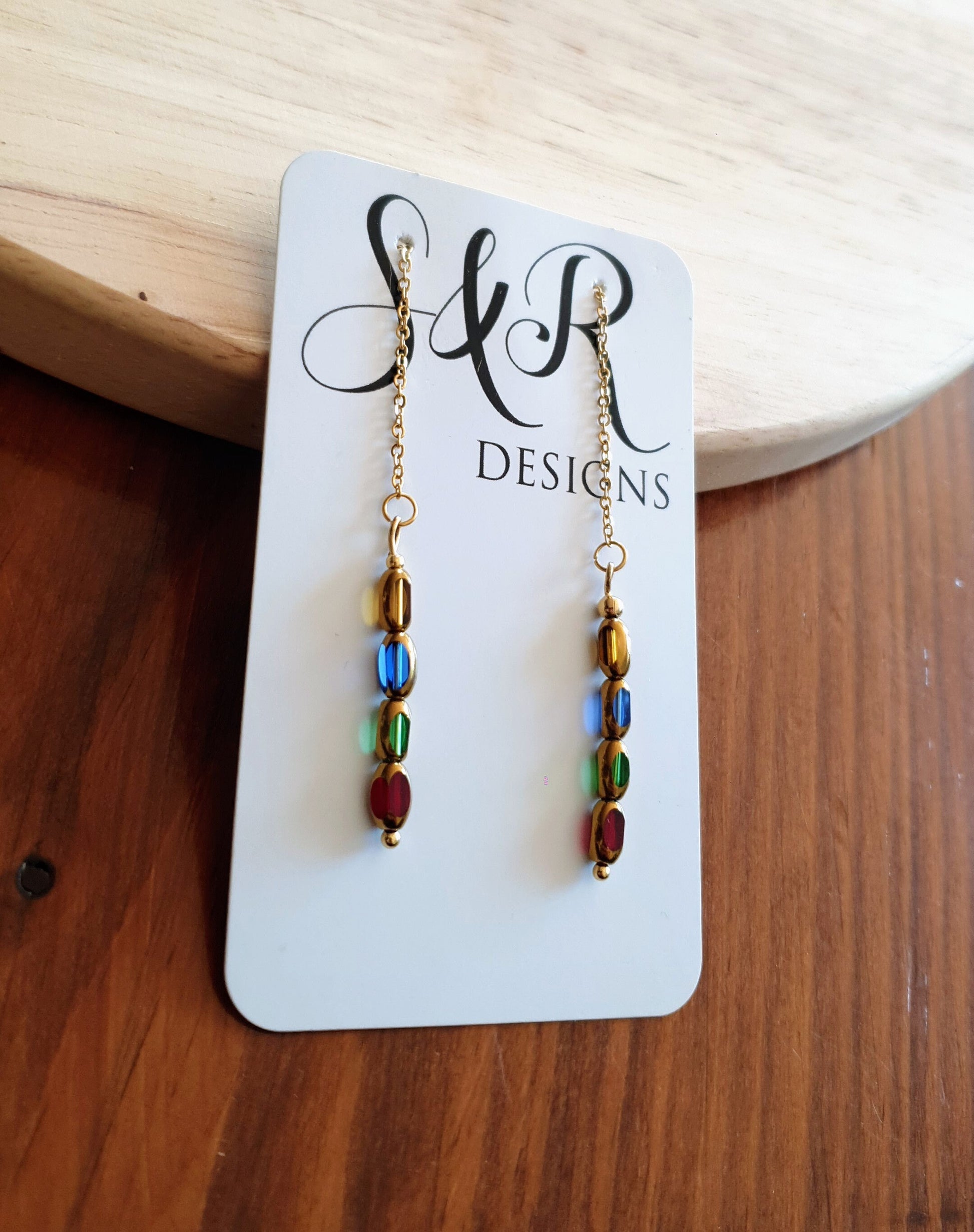 Statement Multicoloured Glass beads in gold attached to gold Stainless steel. Light weight and beautiful glimmer to wear everyday or for special occasions.Materials: Stainless Steel, great for sensitive ears and glass beadsColour: gold, blue, red, green