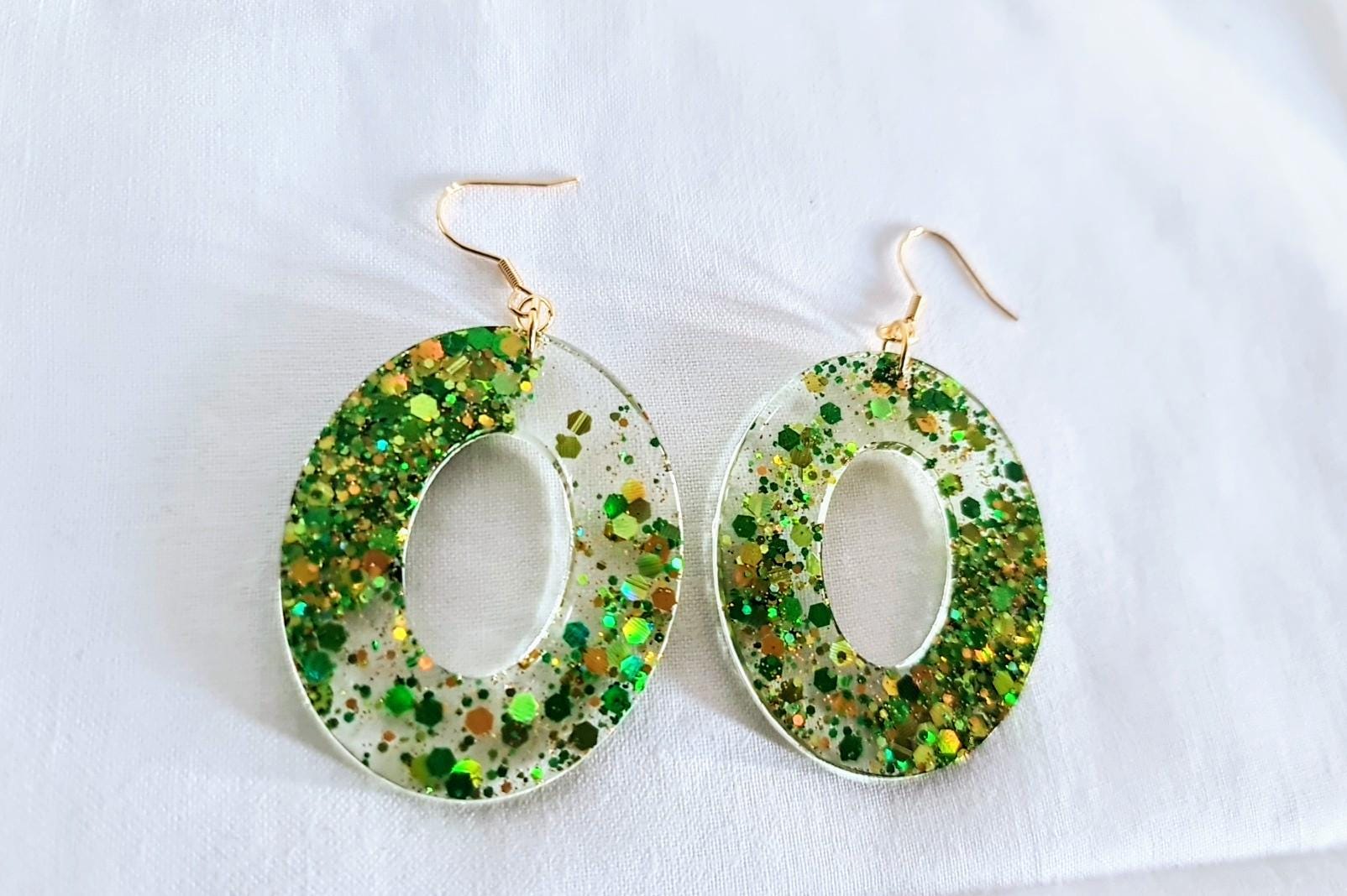 Statement Big Oval Dangle Earrings.Material: Stainless steel, resin, glitter Colour: Green, gold, clearSize: 70mm length drop X 41mm wideIf you like light weight comfortable earrings then these are for you. Sparkly you can wear everyday or a night out.All metals are made with stainless steel which is perfect for sensitive ears and never changes colour. Want it in a different colour, shorter or even longer, send me a message and we will design them together.