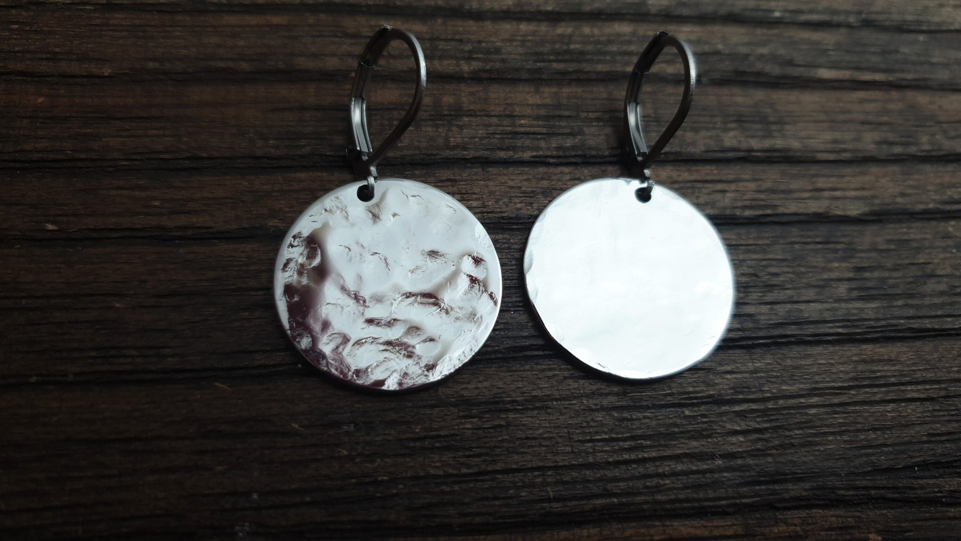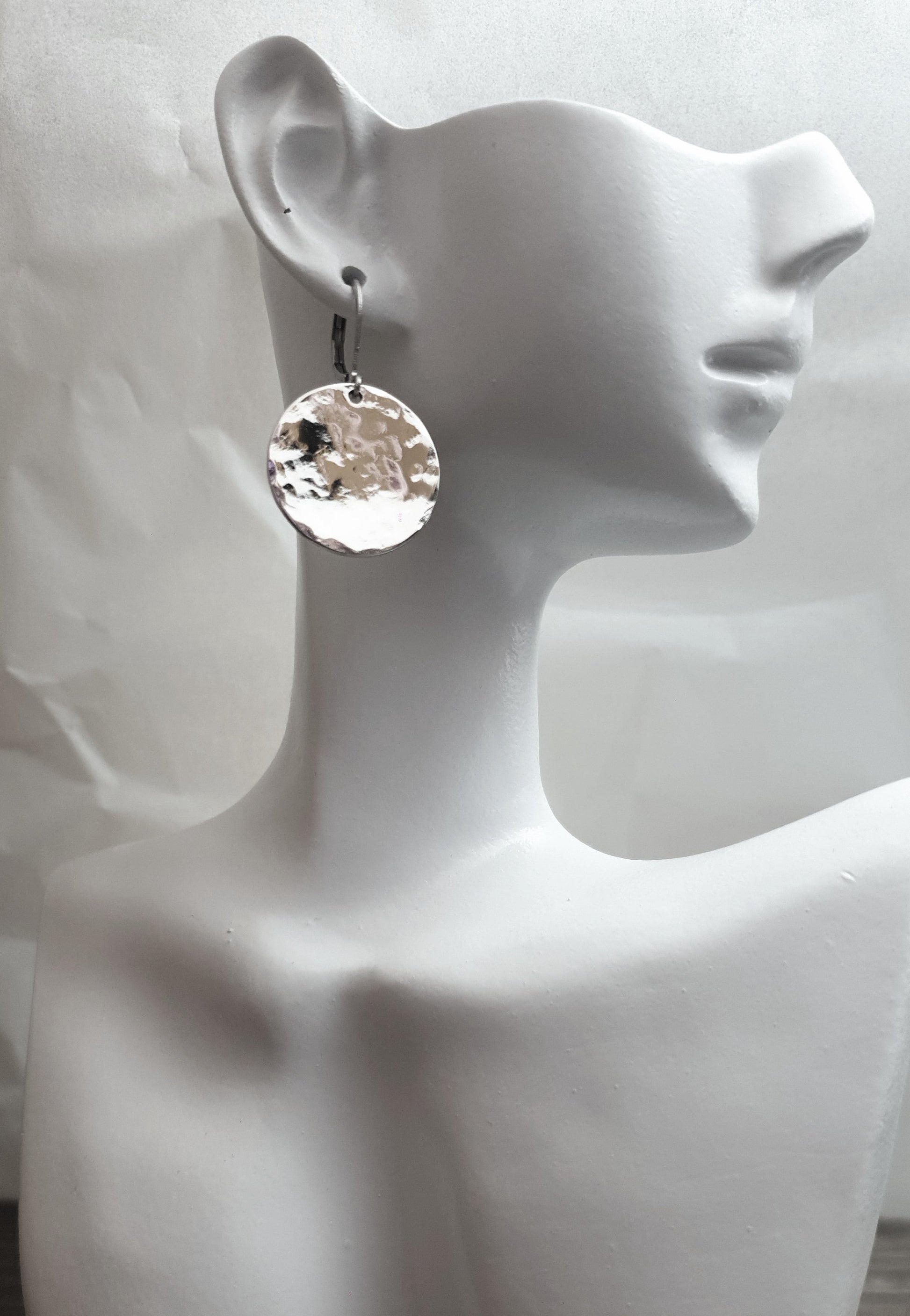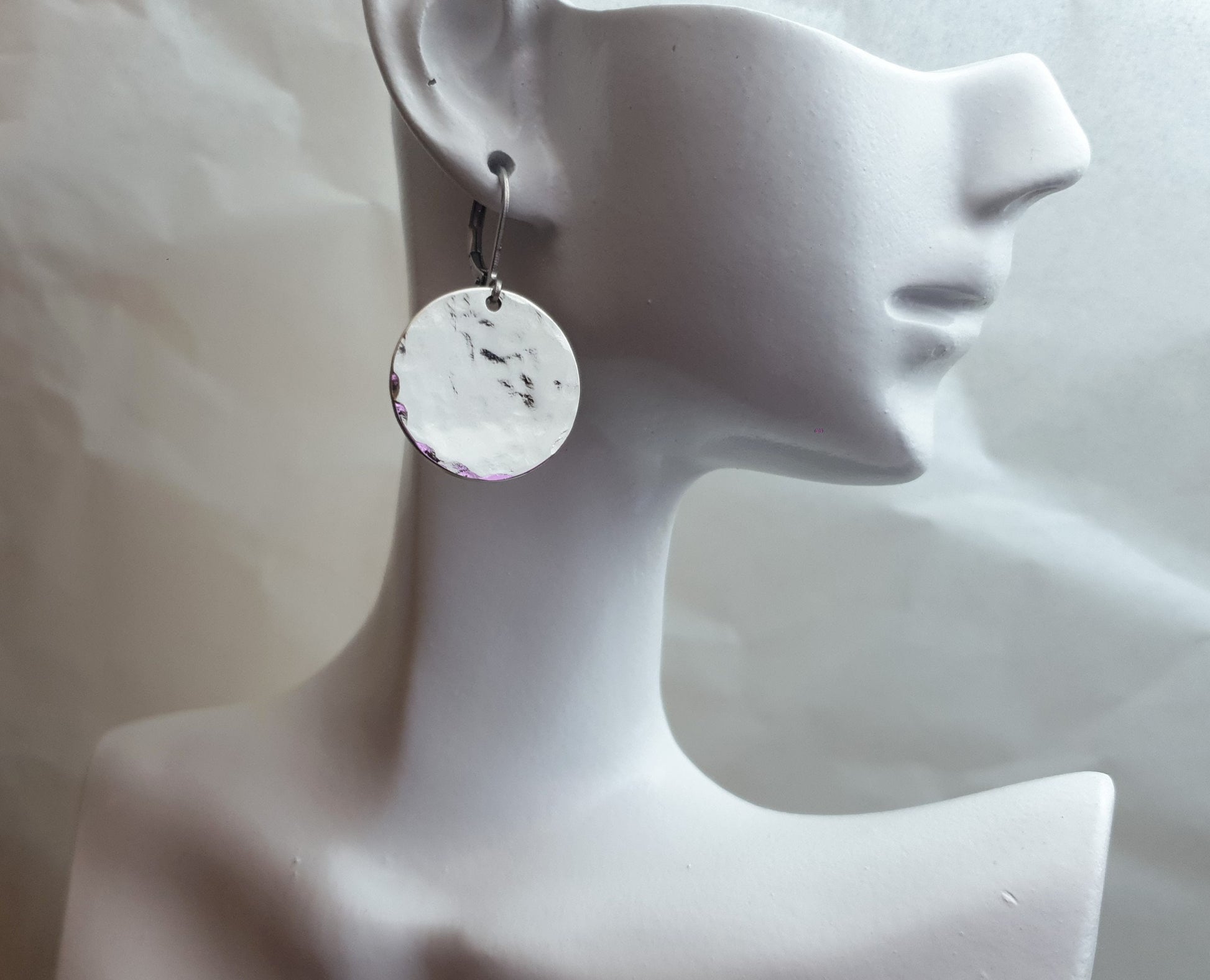 Hammered or plain circle 20mm disc Leverback dangle earrings. Can wear everyday or for special occasions.Materials: Stainless Steel, great for sensitive ears and are waterproof Colour: silver
