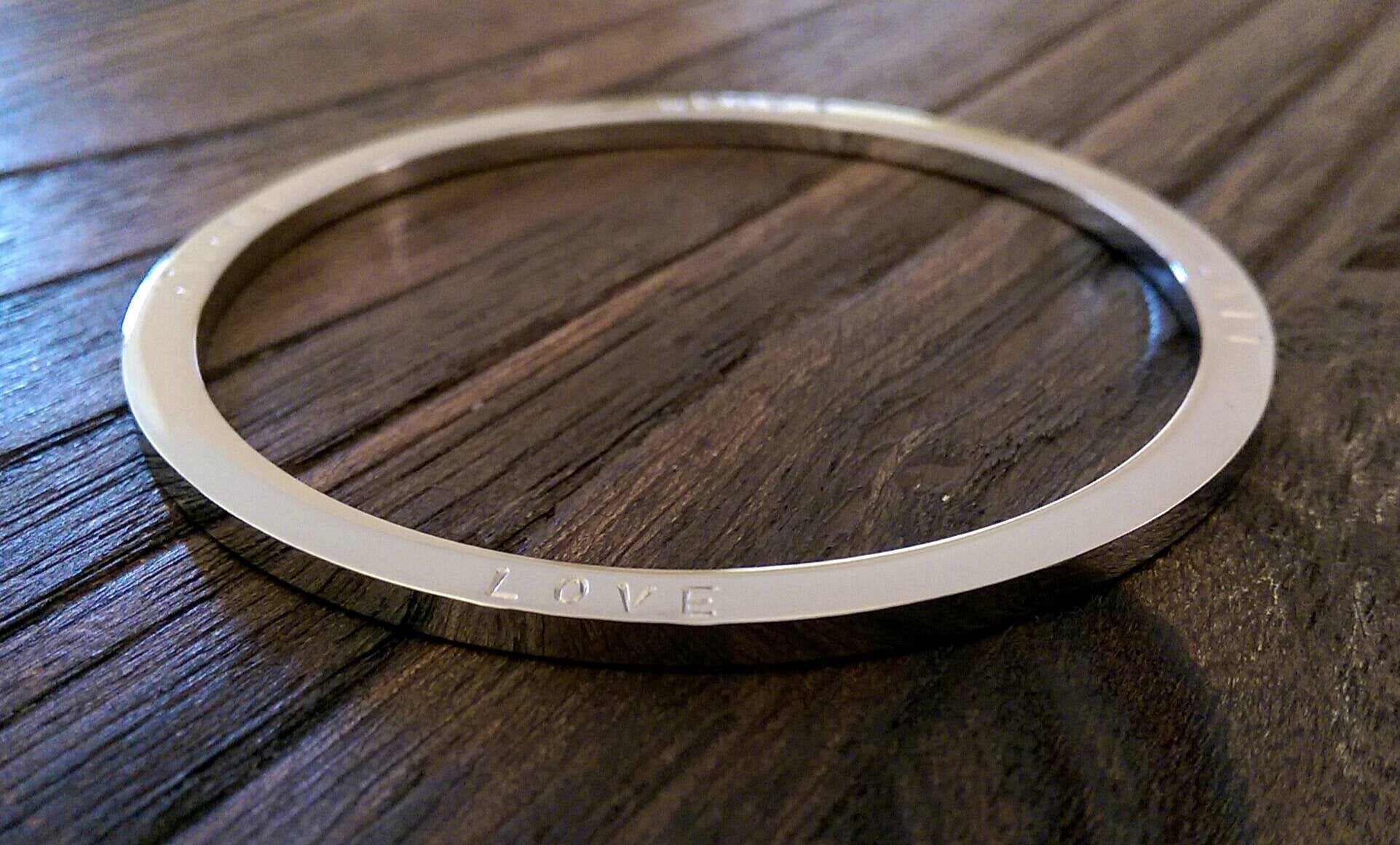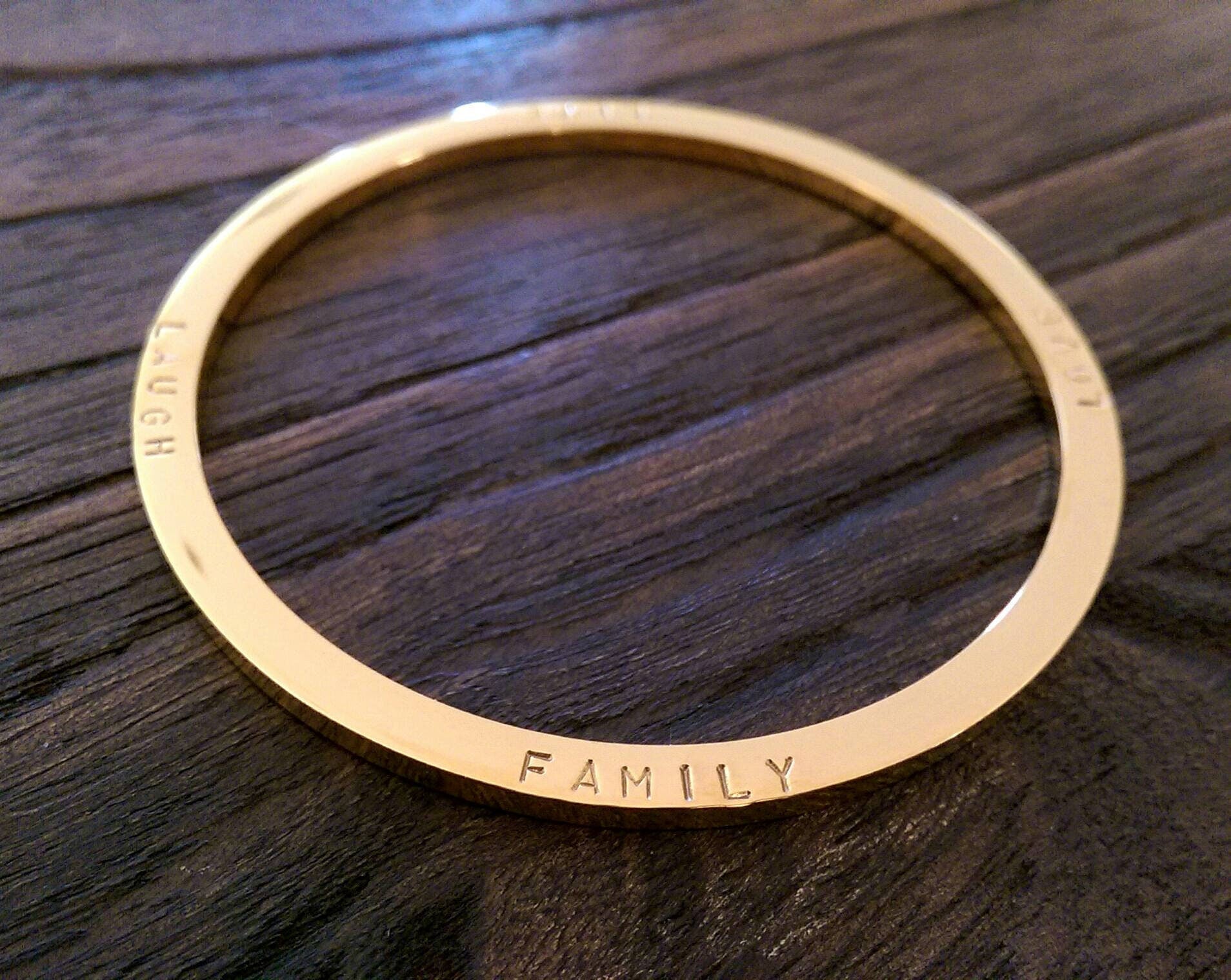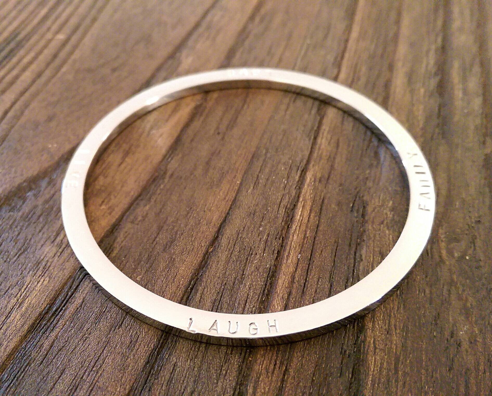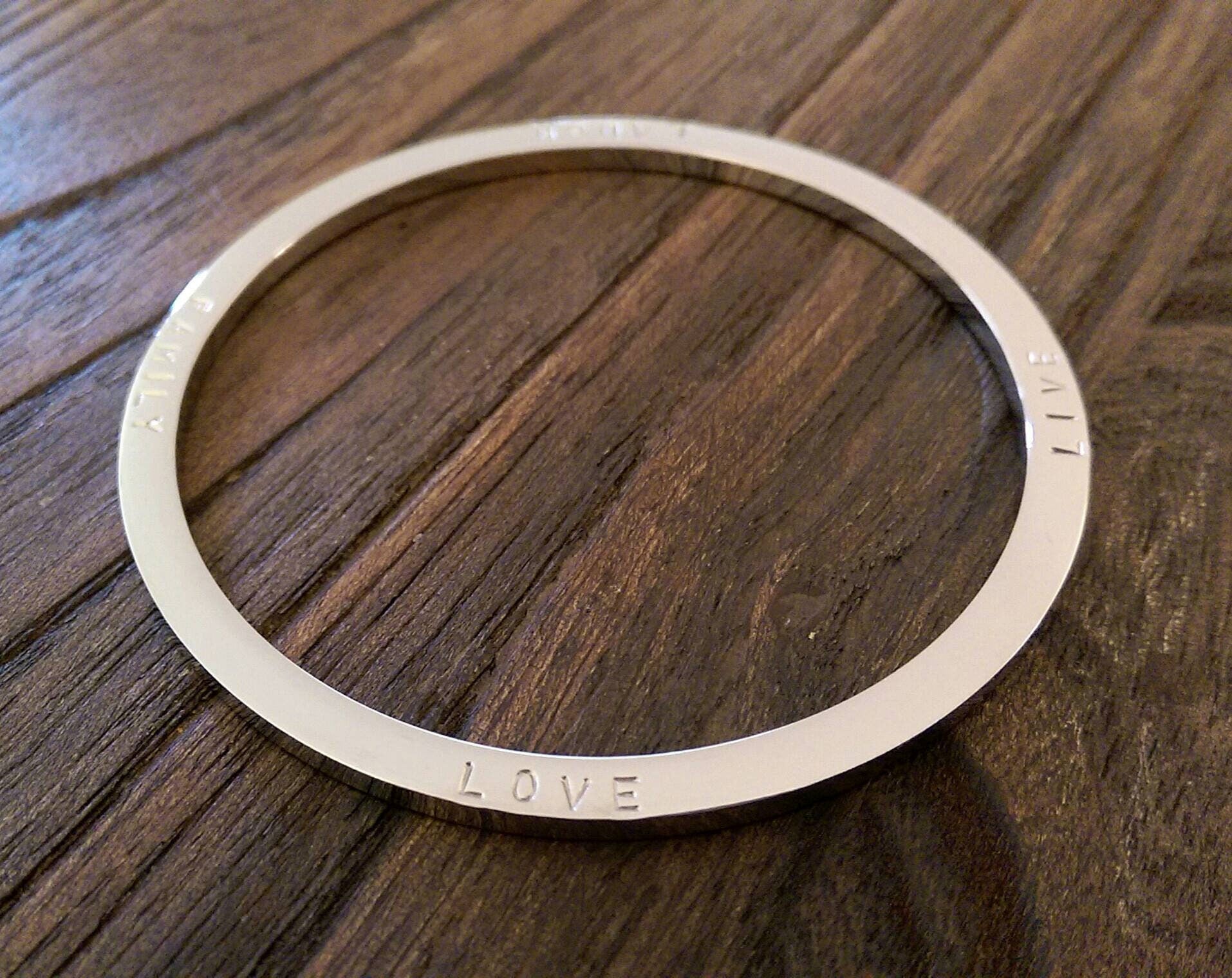Stainless Steel Personalised Hand Stamped Thick Bangle.Stainless Steel Large size bangle has been hand stamped with the words: Family Love Laugh Live.Ready to post as soon as you purchase.Lovely Wedding present, Mothers Day Present, Valentines, Birthday Present keepsake, engagement.A beautiful personalised bangle that can be worn on its own or mixed together. Custom Bangle: personalised with your own words or names.The Personalised Bangle is created using high quality jewellery grade stainless steel, making it hypoallergenic and suitable for all skin types, to give you the peace of mind you deserve.Bangles come in 3 sizes; SML (62mm inner diameter), MED (65mm inner diameter) & LRG (68mm inner diameter). The MED size is the standard size you find in most Jewellers.Thickness: 3mmAvailable in three finishes; Silver, Gold & Rose Gold This bangle is quite thick can be hand stamped on both sides. Please be aware that there are limits as to what I can hand stamp. Bangles can fit approximately 80 characters depending on bangle size {spaces are counted as a character}Ideas: You can can your personal message and names of loved ones.