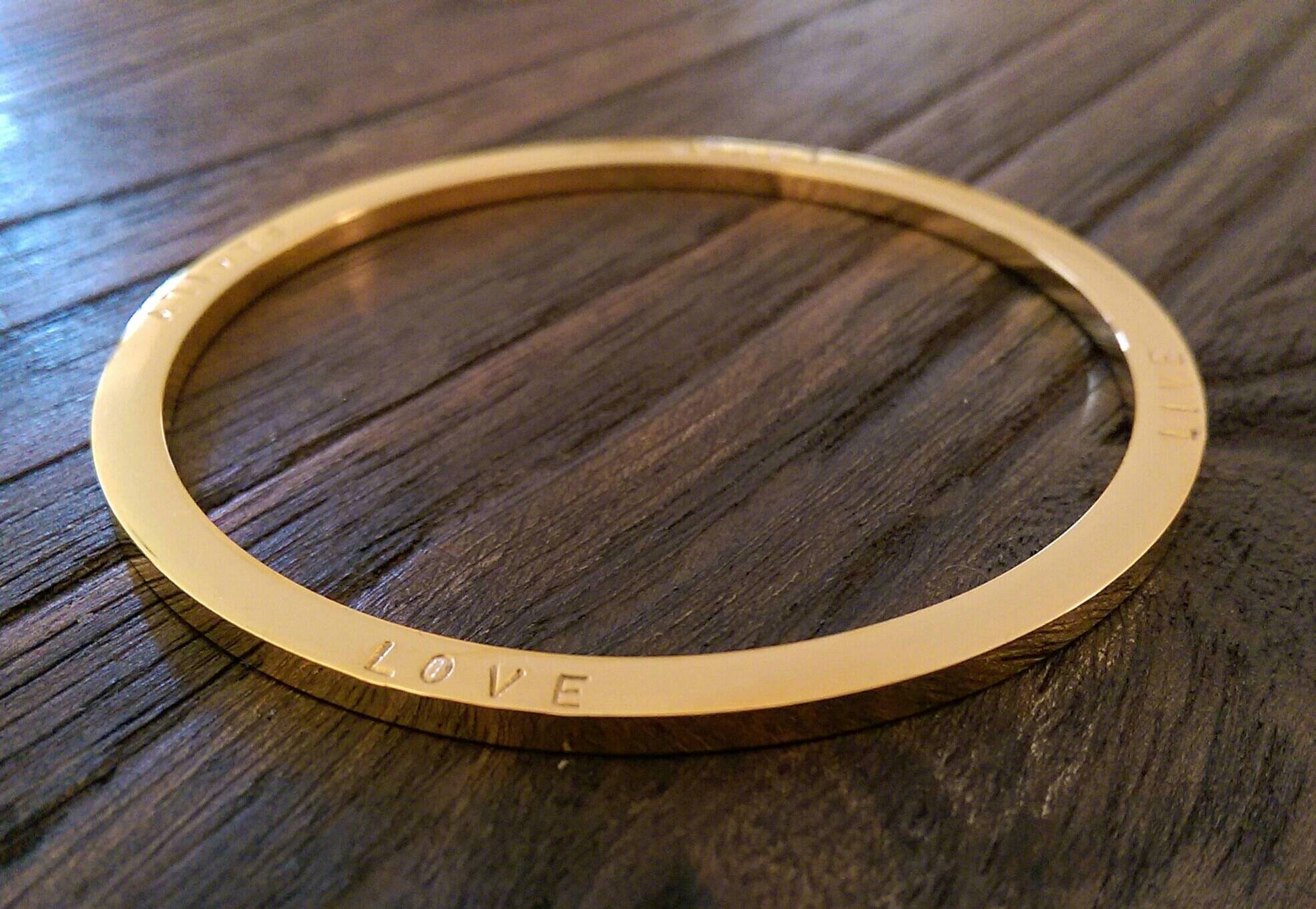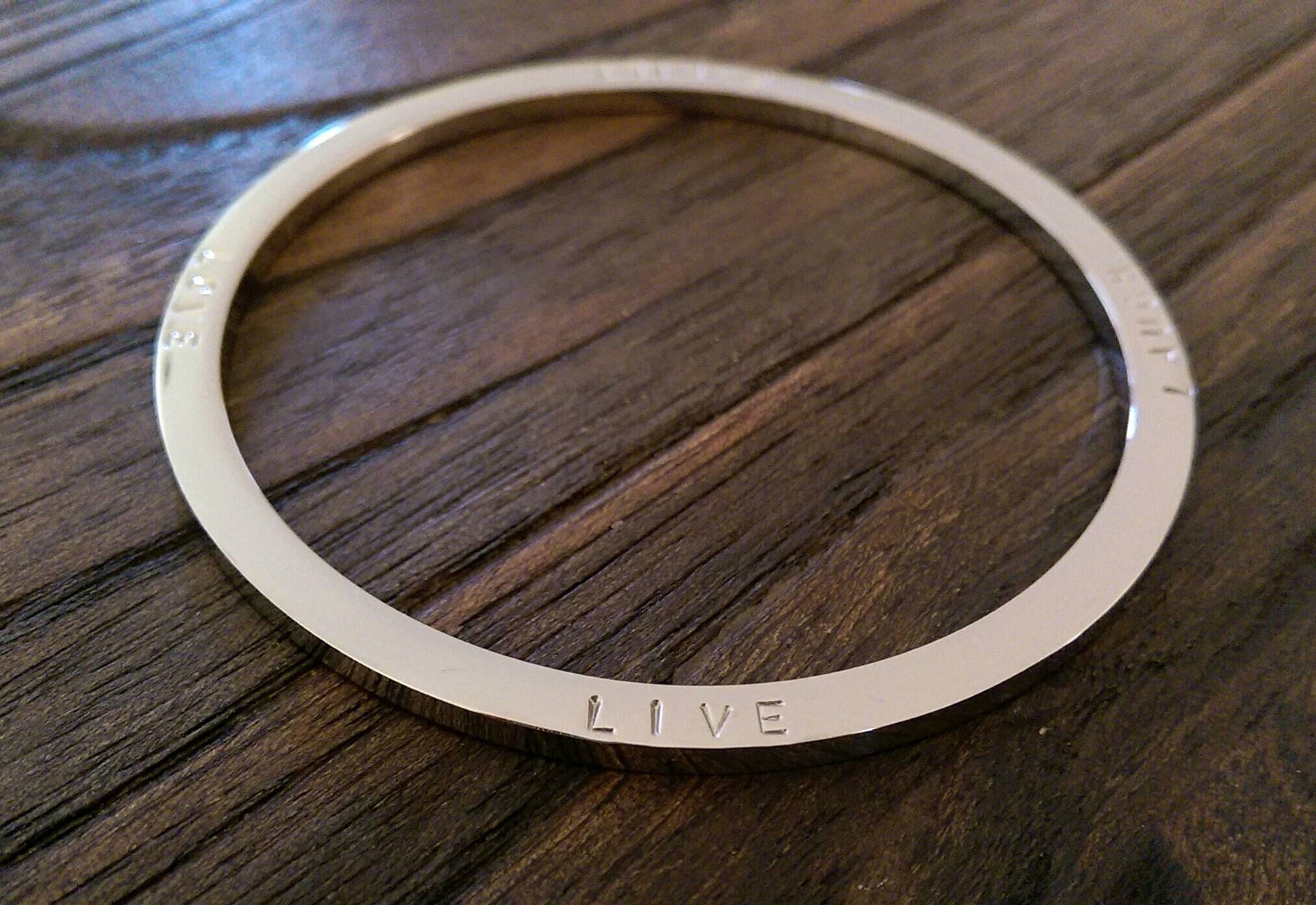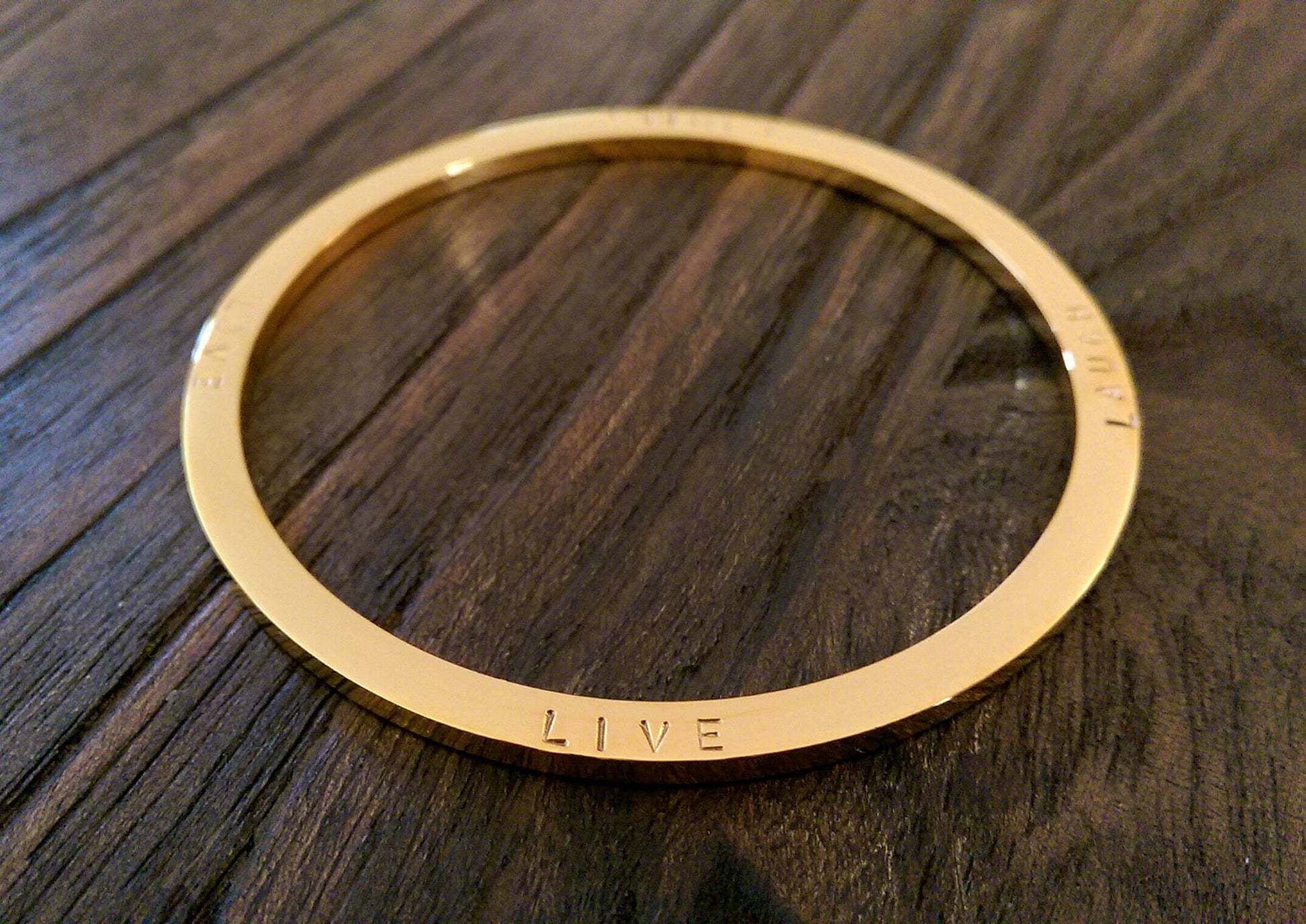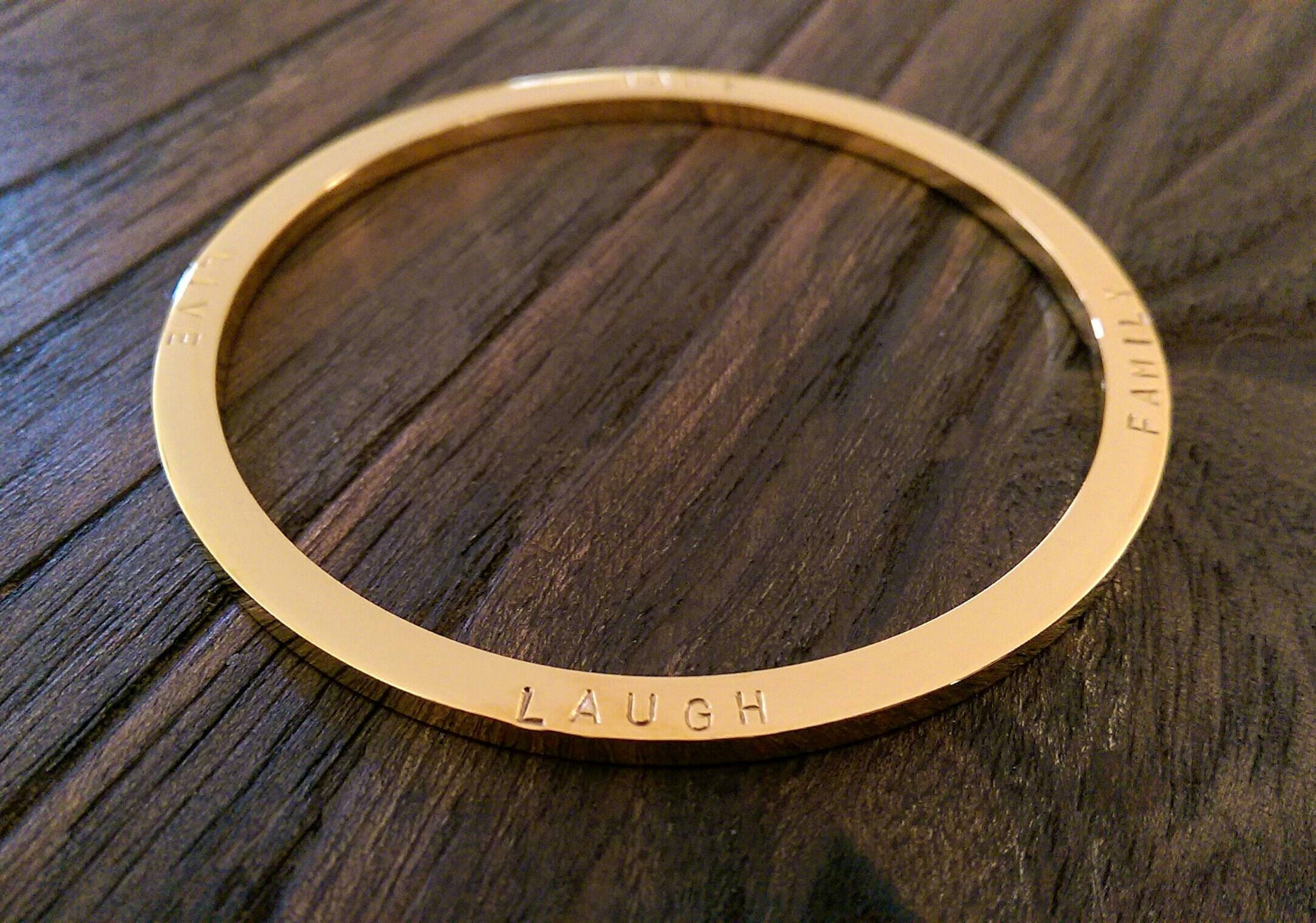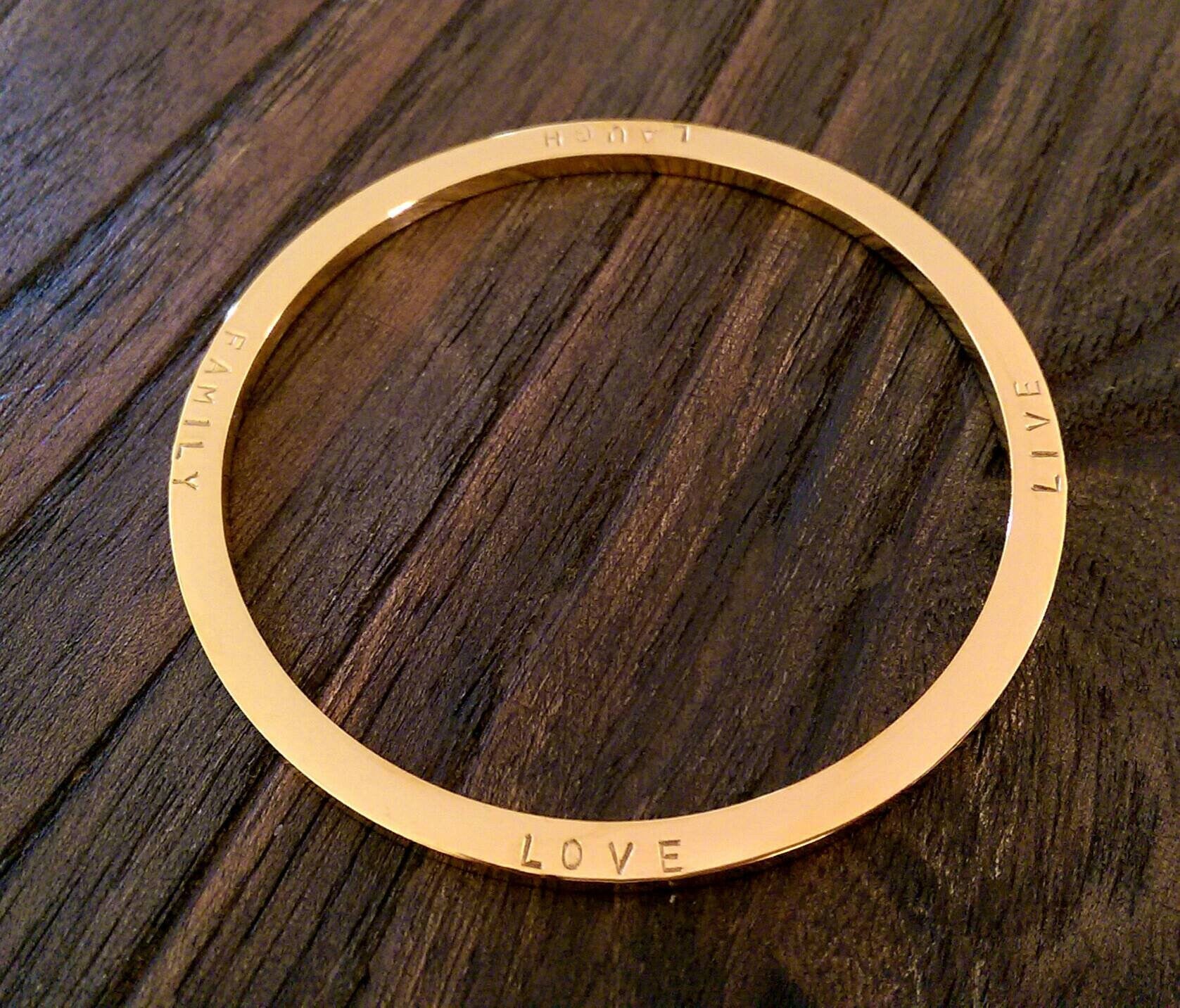 Stainless Steel Personalised Hand Stamped Thick Bangle.Stainless Steel Large size bangle has been hand stamped with the words: Family Love Laugh Live.Ready to post as soon as you purchase.Lovely Wedding present, Mothers Day Present, Valentines, Birthday Present keepsake, engagement.A beautiful personalised bangle that can be worn on its own or mixed together. Custom Bangle: personalised with your own words or names.The Personalised Bangle is created using high quality jewellery grade stainless steel, making it hypoallergenic and suitable for all skin types, to give you the peace of mind you deserve.Bangles come in 3 sizes; SML (62mm inner diameter), MED (65mm inner diameter) & LRG (68mm inner diameter). The MED size is the standard size you find in most Jewellers.Thickness: 3mmAvailable in three finishes; Silver, Gold & Rose Gold This bangle is quite thick can be hand stamped on both sides. Please be aware that there are limits as to what I can hand stamp. Bangles can fit approximately 80 characters depending on bangle size {spaces are counted as a character}Ideas: You can can your personal message and names of loved ones.