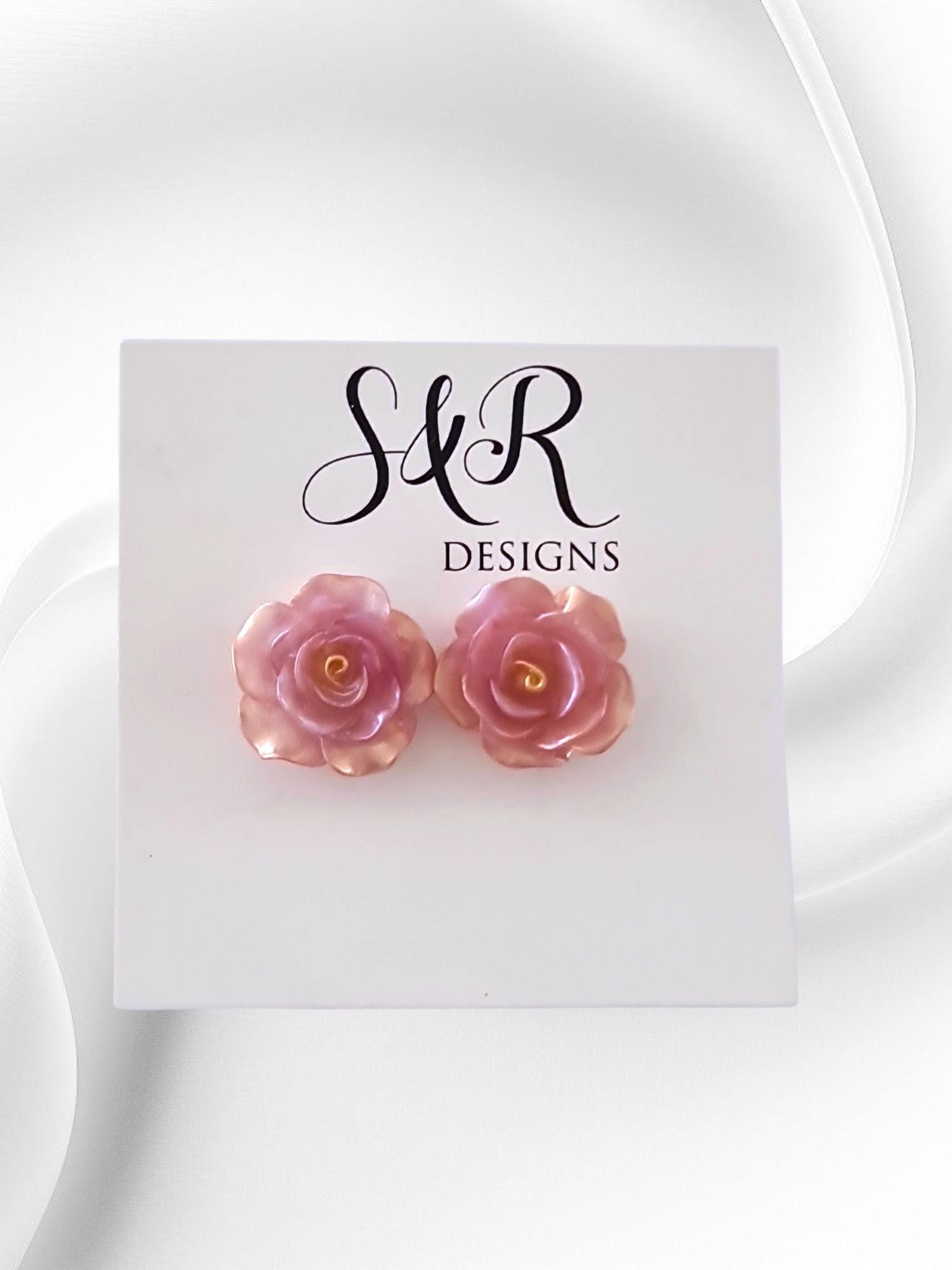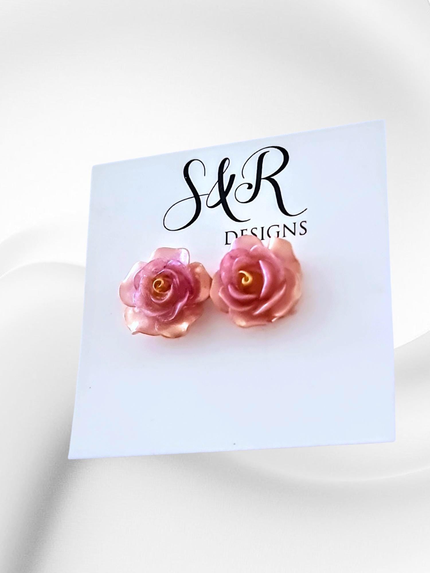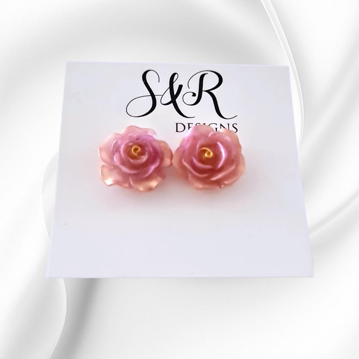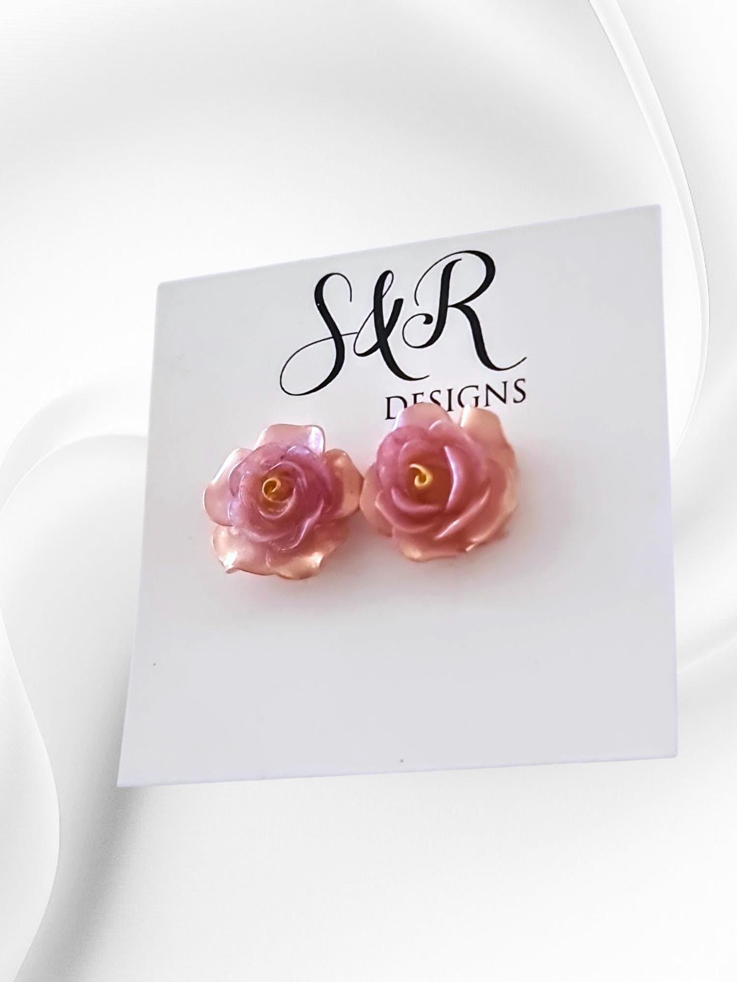 Elevate your style with these stunning handmade pink resin rose stud earrings! Crafted with intricate detail, these floral earrings capture the beauty of real roses with a luminous, pearlescent finish. Lightweight and comfortable for all-day wear, they make the perfect gift for flower lovers, bridesmaids, or anyone who adores feminine and elegant jewelry.20mm X 20mmHandmade with high-quality resinSoft pink with gold center for a luxurious touchLightweight and comfortable for everyday wearPerfect for weddings, gifts, or a romantic accessoryHypoallergenic stainless steel posts (great for sensitive ears!)Whether you’re dressing up for a special occasion or adding a floral touch to your everyday look, these earrings are sure to turn heads!All resin is mixed and poured, sanded and polished and made by me Angie. If you would like different colours please email me.
