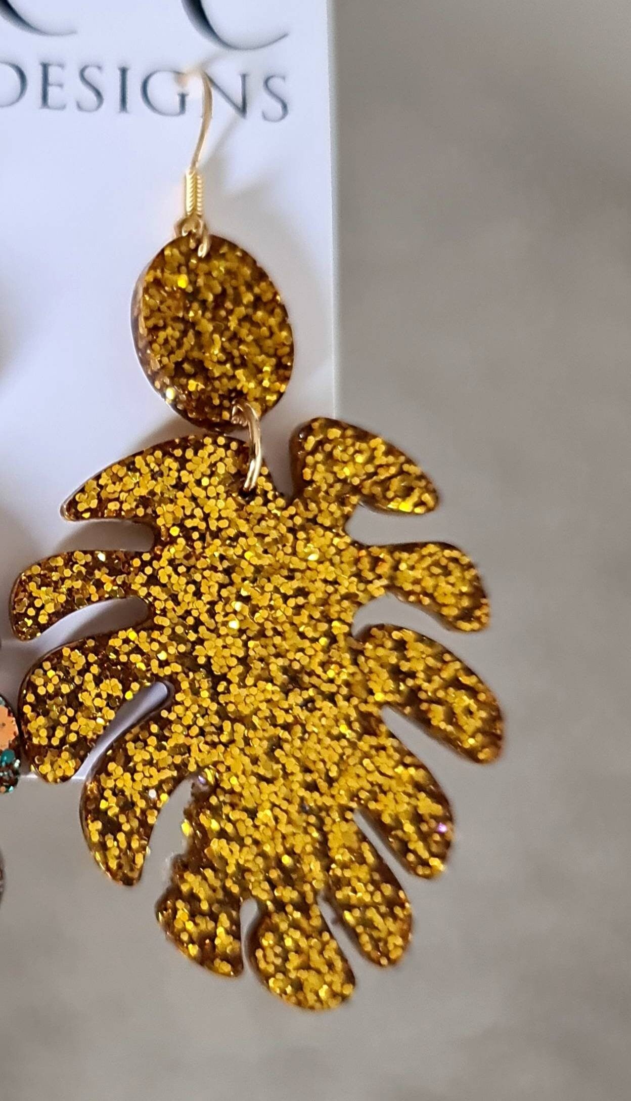 Large Monstera Leaf Long Dangle Earrings, Gold Glitter Resin Dangle Statement Earrings, Choose Silver or Gold Hooks