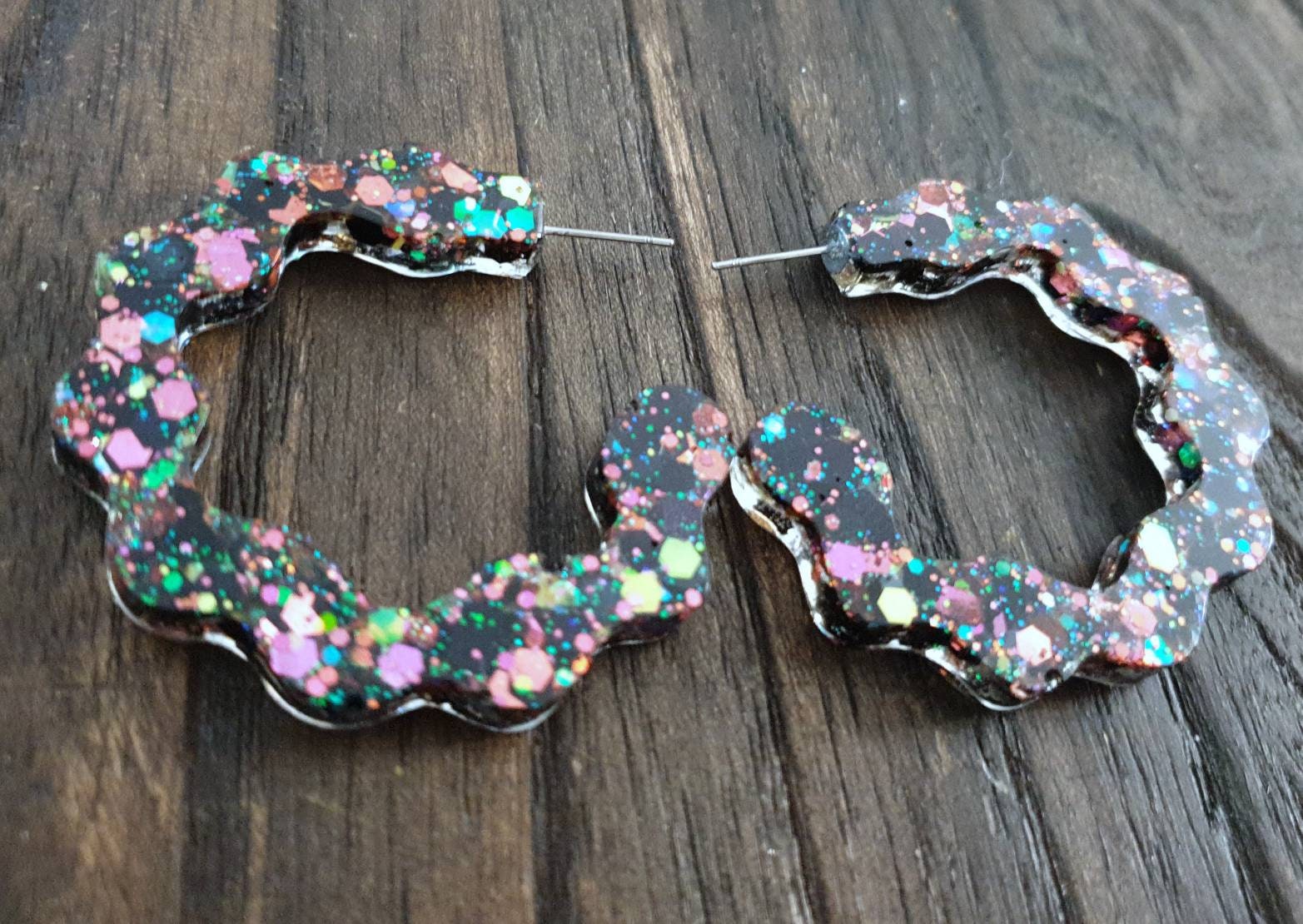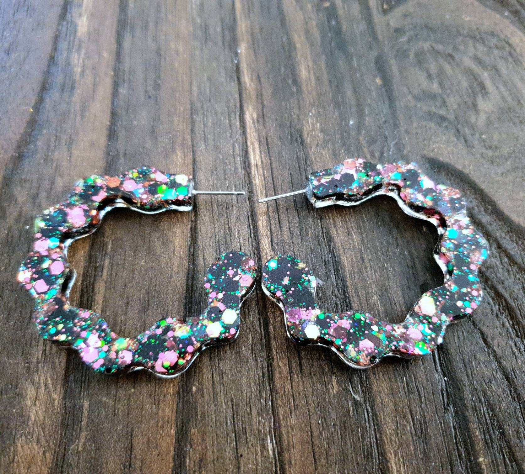 Large Wave Hoop Earrings, Black, Pink, Teal, Blue, Green Glitter, Resin Dangle Statement Earrings, Unique Design, Modern, Lightweight