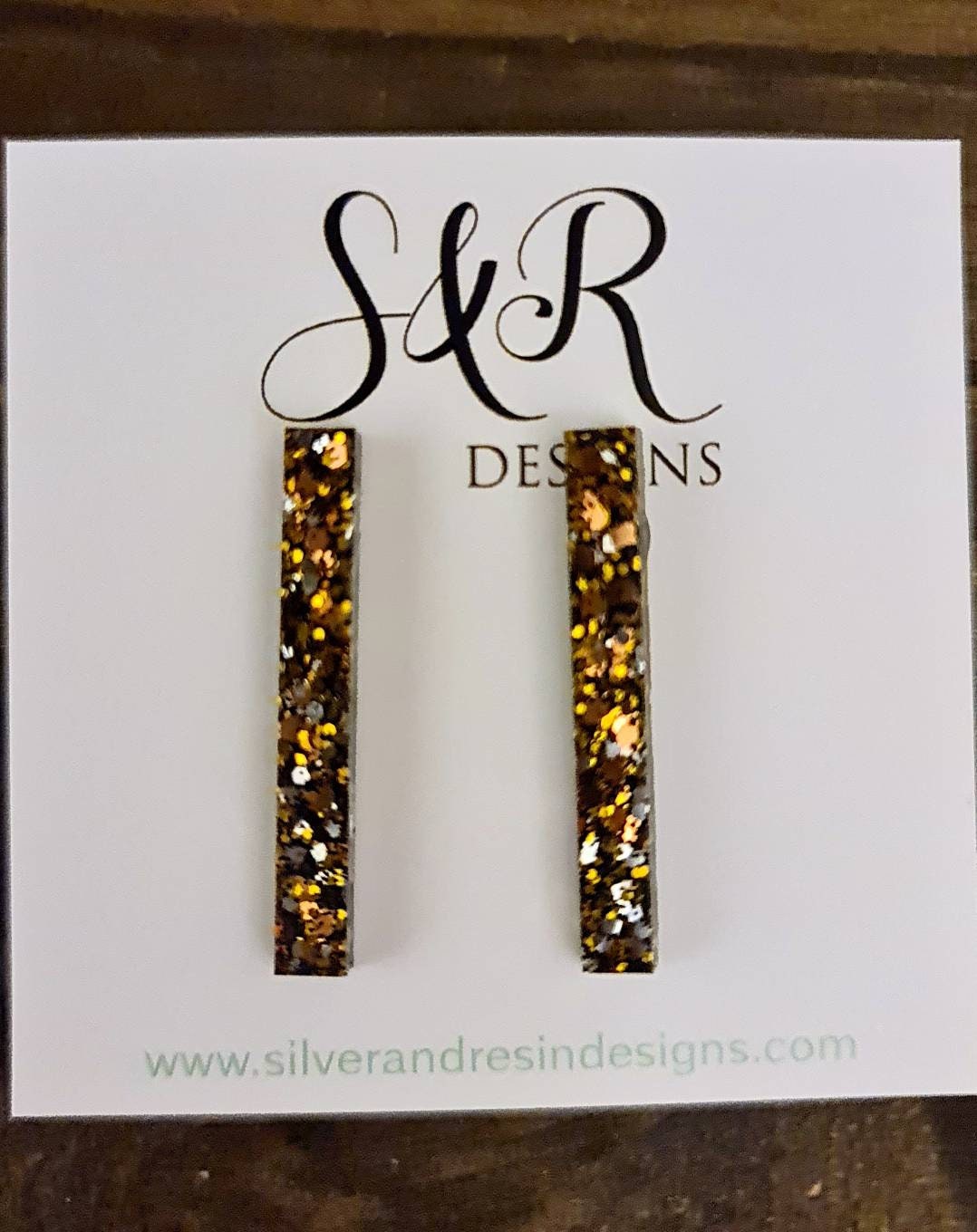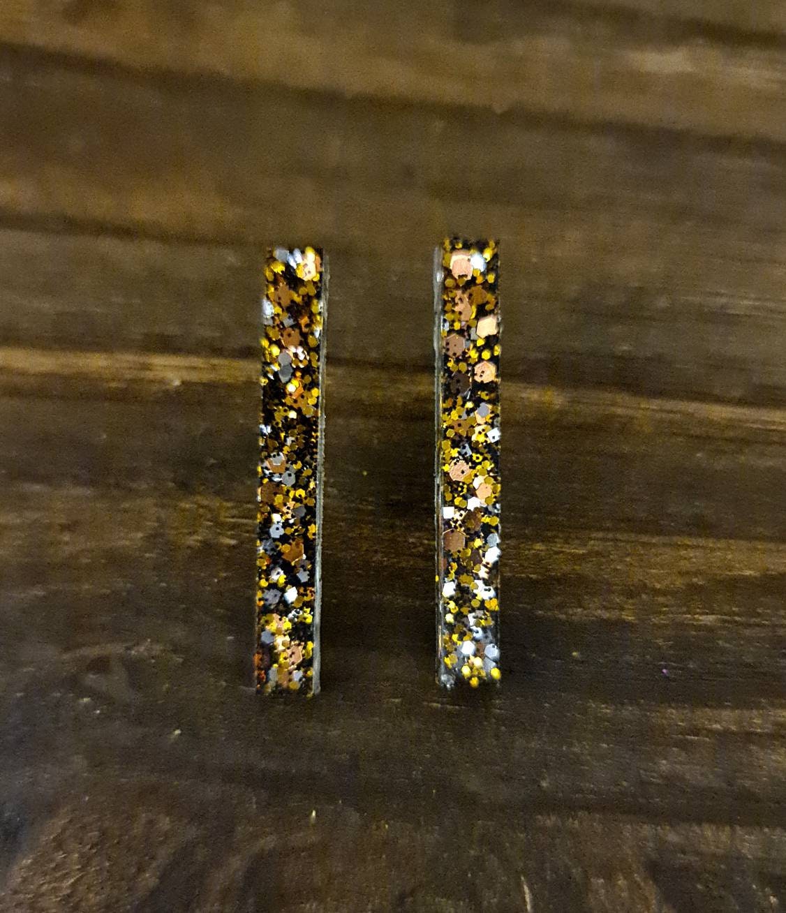 Bar Long Earrings.Material: Stainless steel, poured resin, glitters.Colour: rosegold, gold, silver and black glitter mixSize: 35mm length drop X 5mm wideAll resin is mixed and poured, sanded and polished and made by me Angie. If you would like different colours please email me.