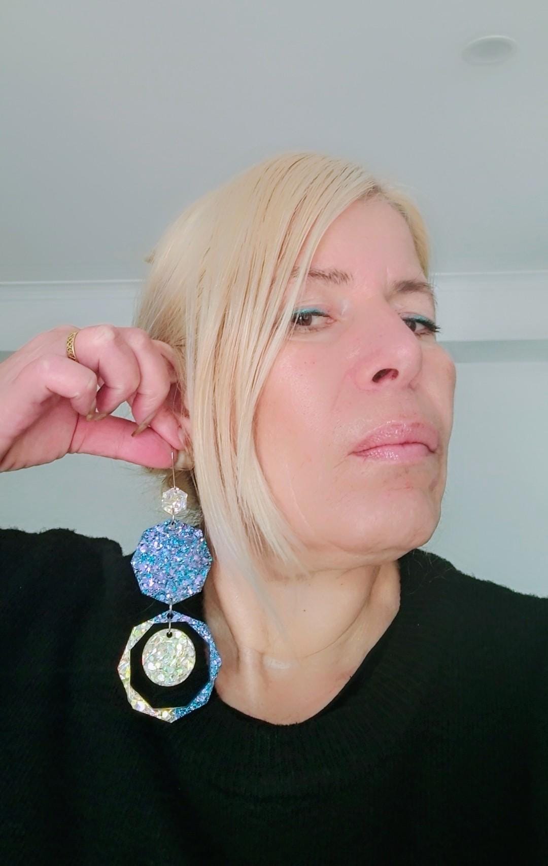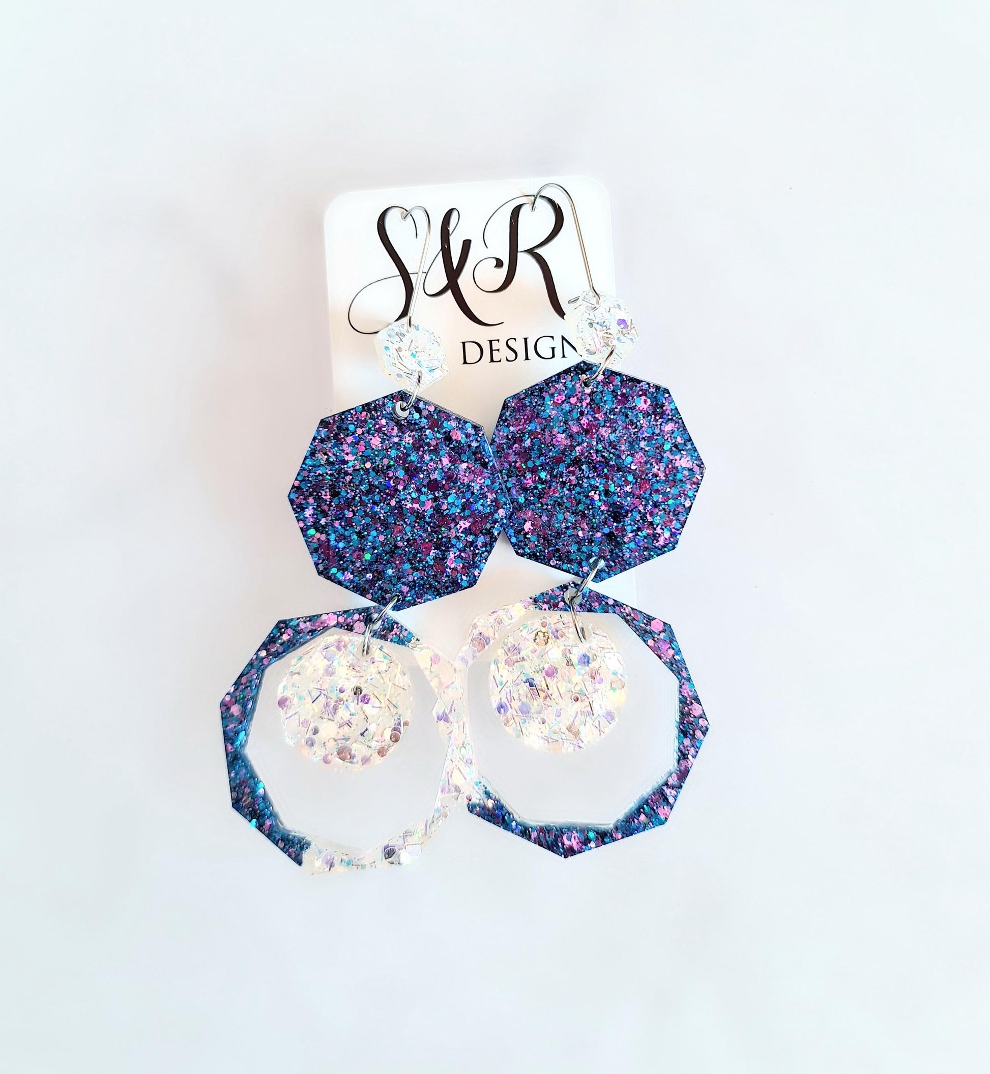 ✨ Designed to Dazzle. Crafted to Last. ✨Elevate your accessory game with these show-stopping, handcrafted resin earrings—where luxury meets artistry. Featuring a dramatic triple-drop silhouette in luminous blue, purple, and holographic glitter, each geometric shape is meticulously layered for a sculptural effect that catches the light with every movement.The open octagon base adds an architectural flair, while hypoallergenic stainless steel ear wire hooks ensure comfort for sensitive ears—offering both statement and sophistication in one lightweight design.Details: