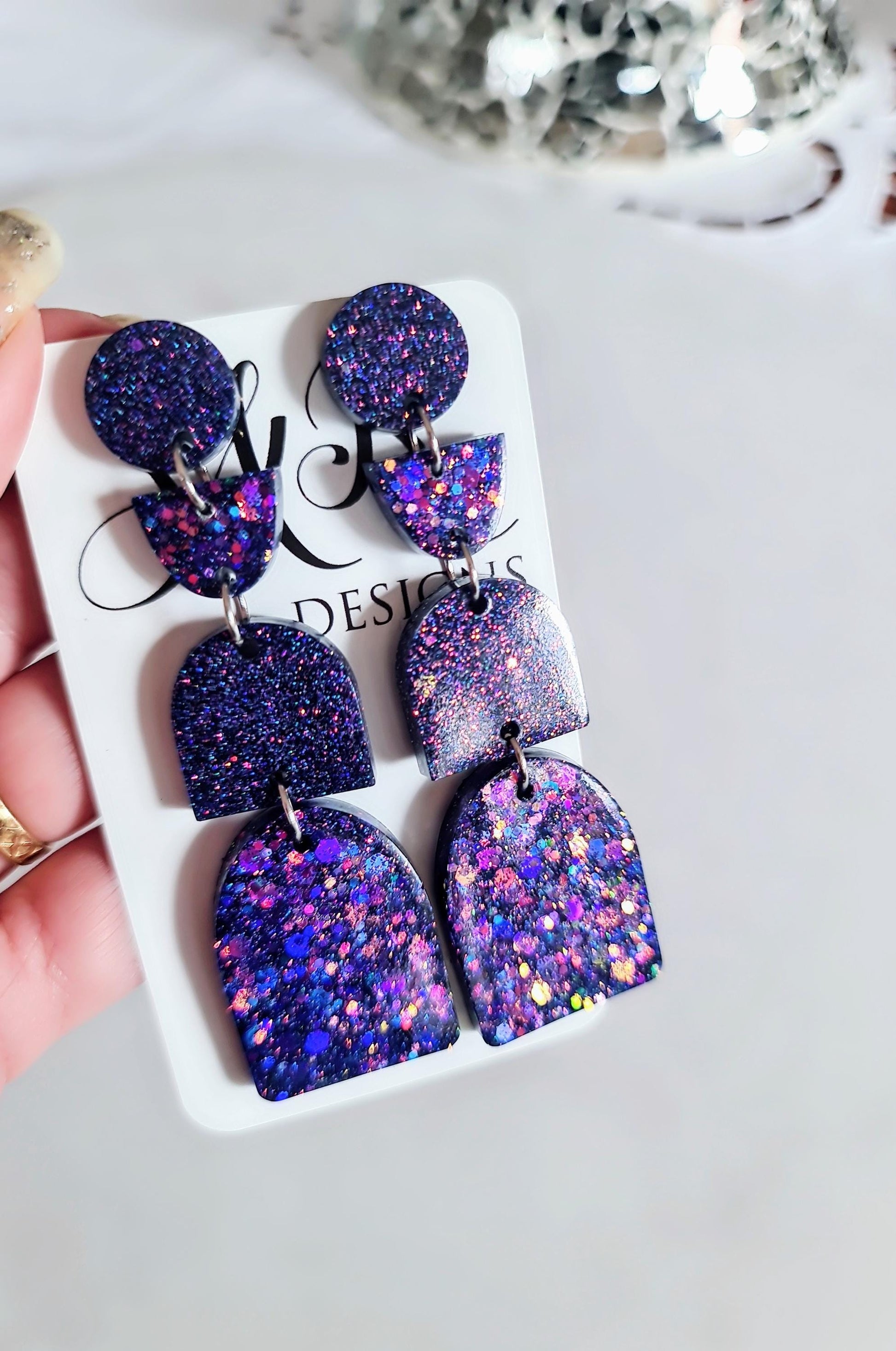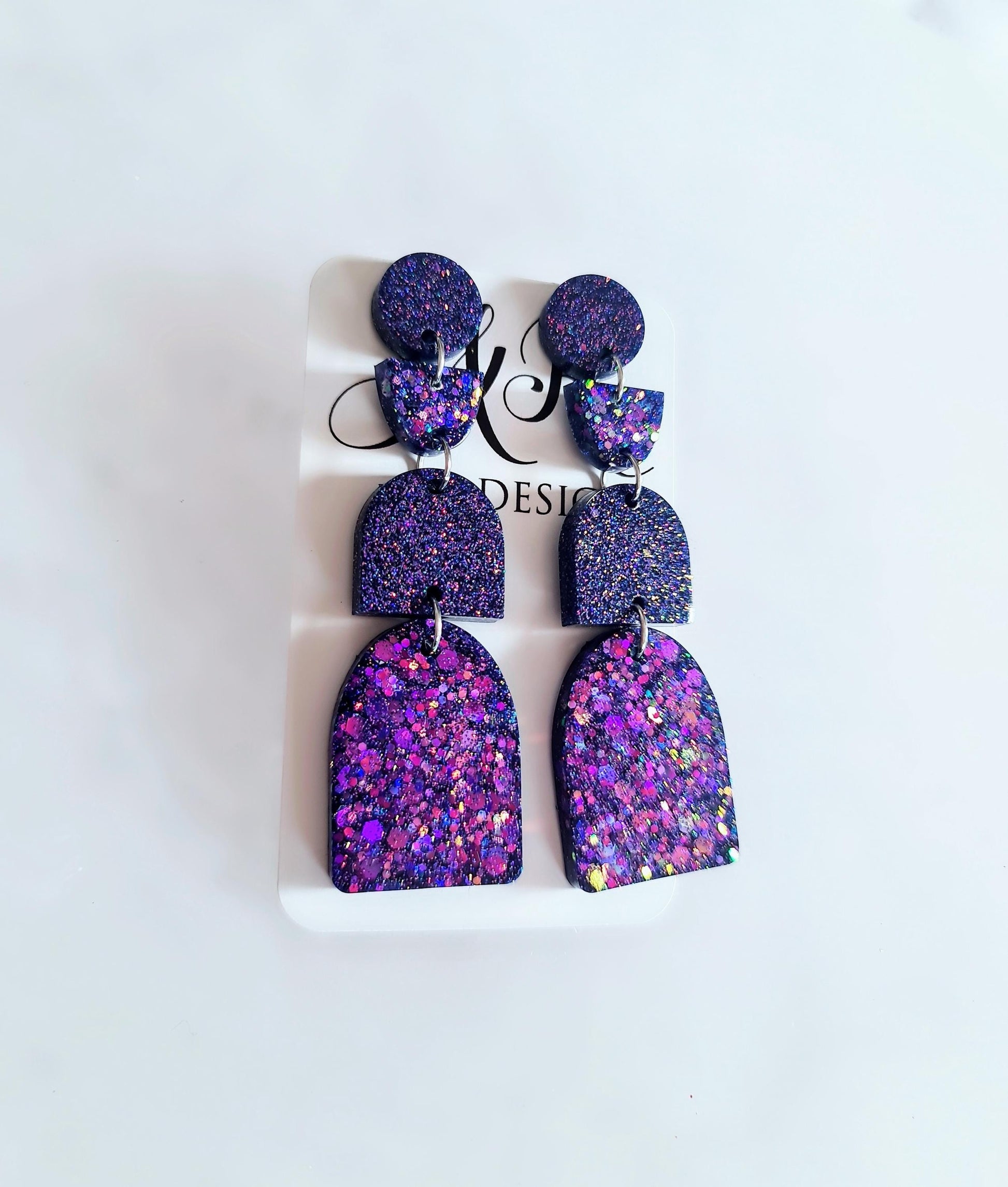 Multi Deep Purple Arch Dangle Earrings, Statement Earrings, Purple Glitter Dangle Stud Earrings