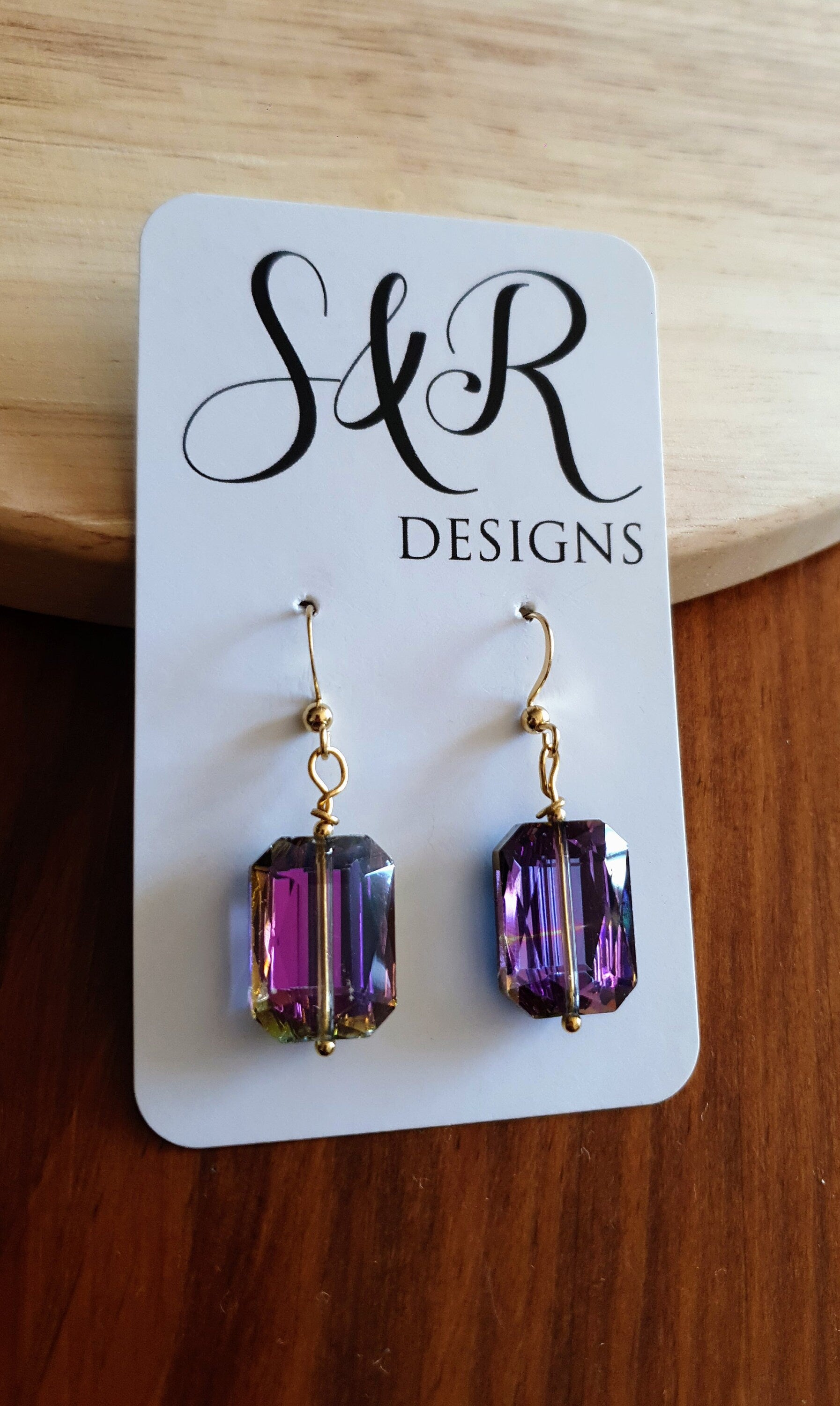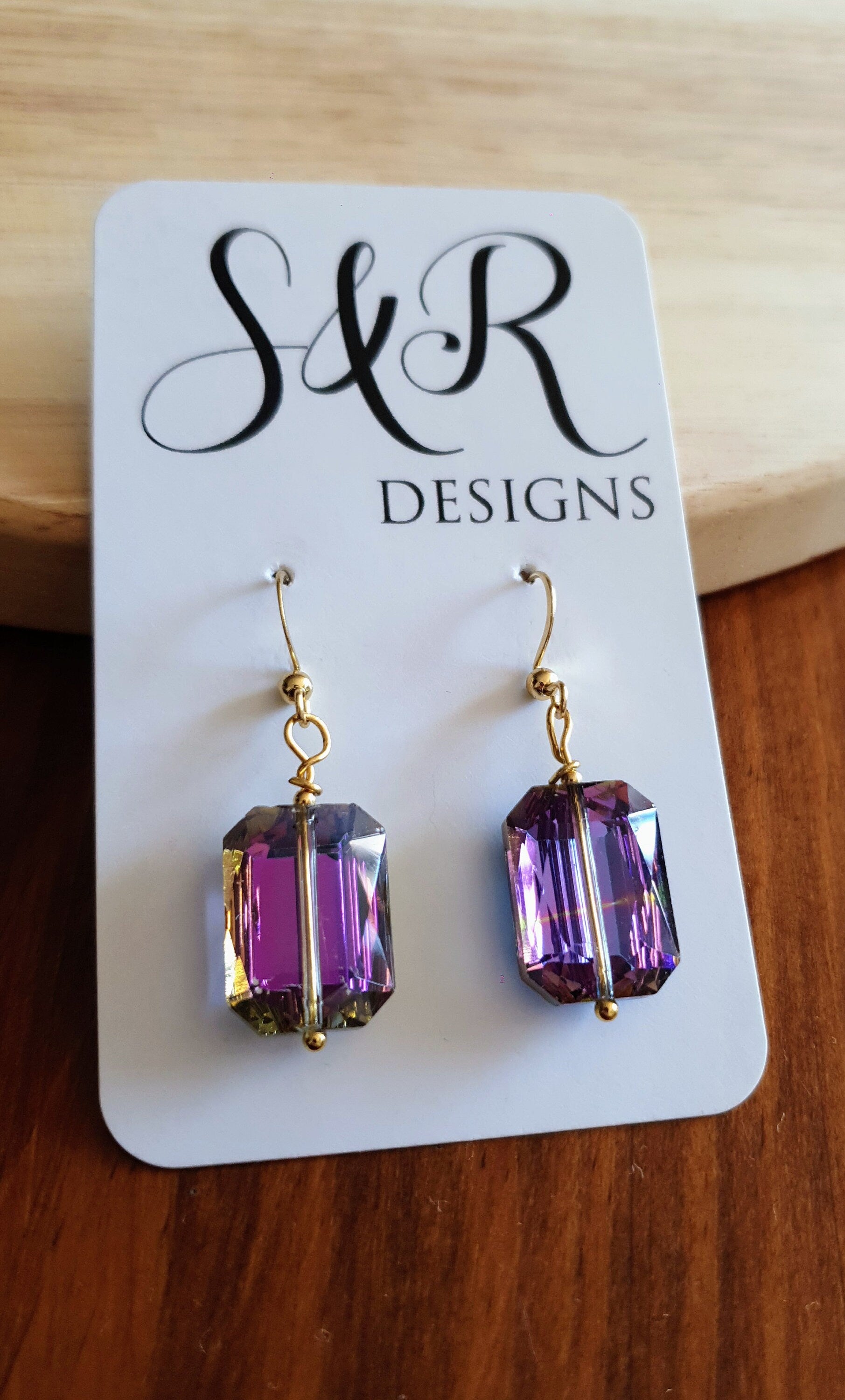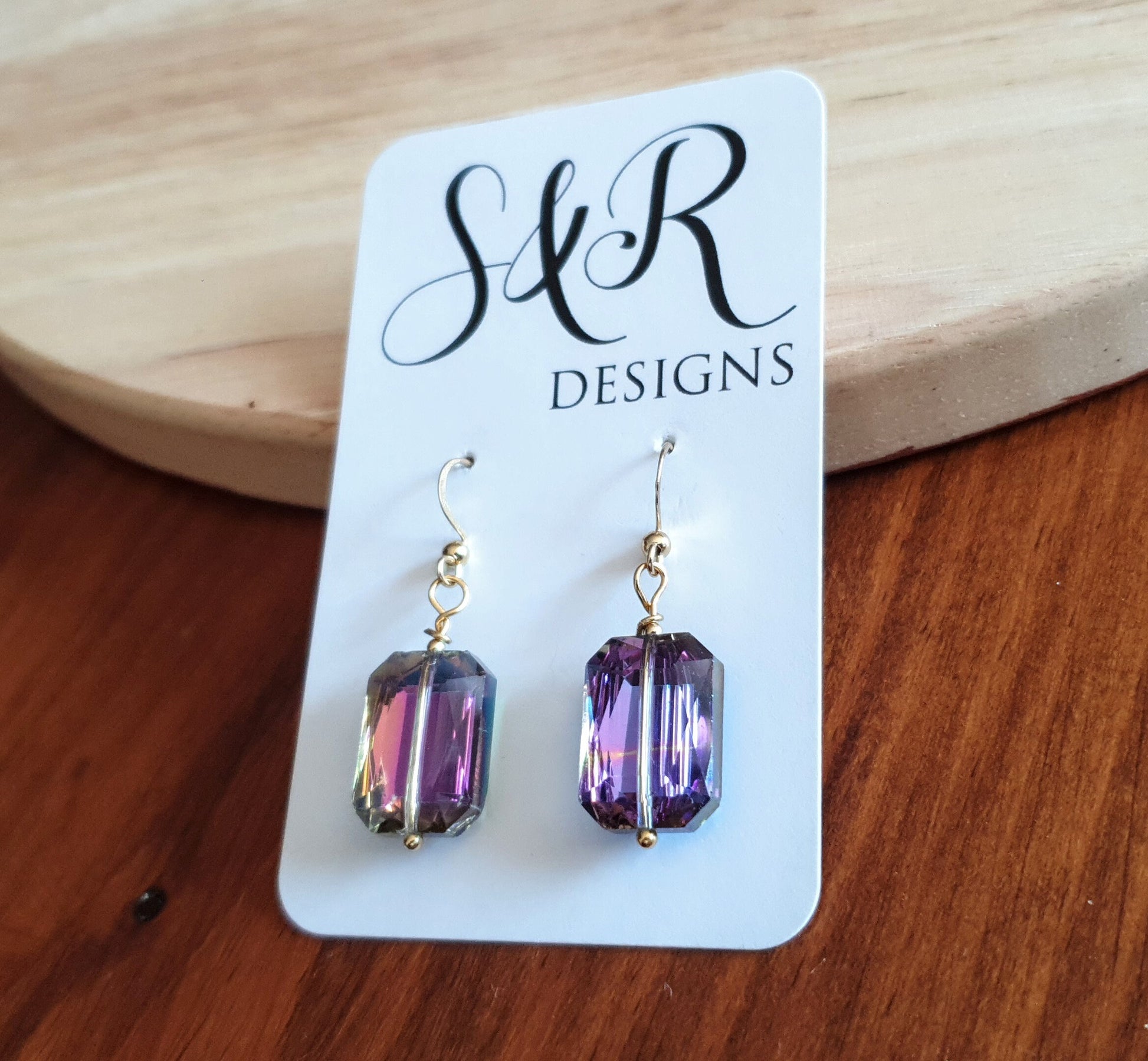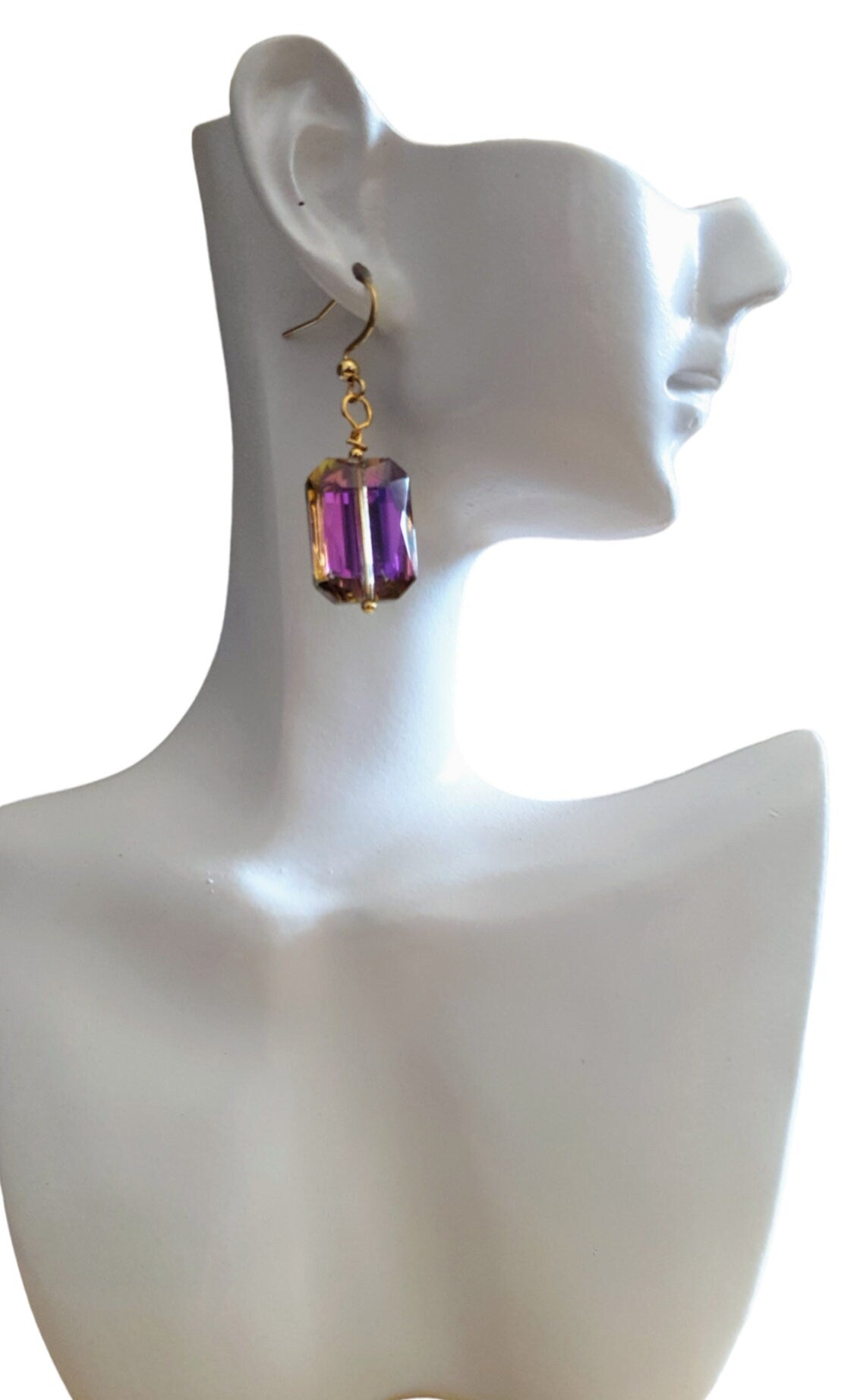 Stunning Statement Purple Multicoloured Rectangle Earrings. They change colour from purple to blue to pink as they move. Beautiful multicoloured effect.Material: Gold Stainless steel, glassColour: purple, blue, gold and pink yellow Size: 45mm length X 14mm wide