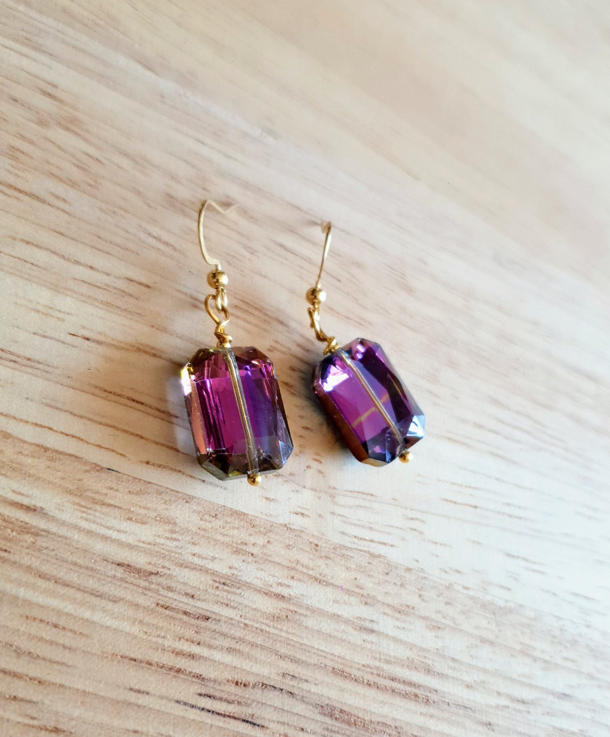 Multicoloured Glass Dangle Drop Earrings, Statement Purple Pink Blue Rectangle Drops, Hook Earwire Gold Earrings, Gold Stainless Steel
