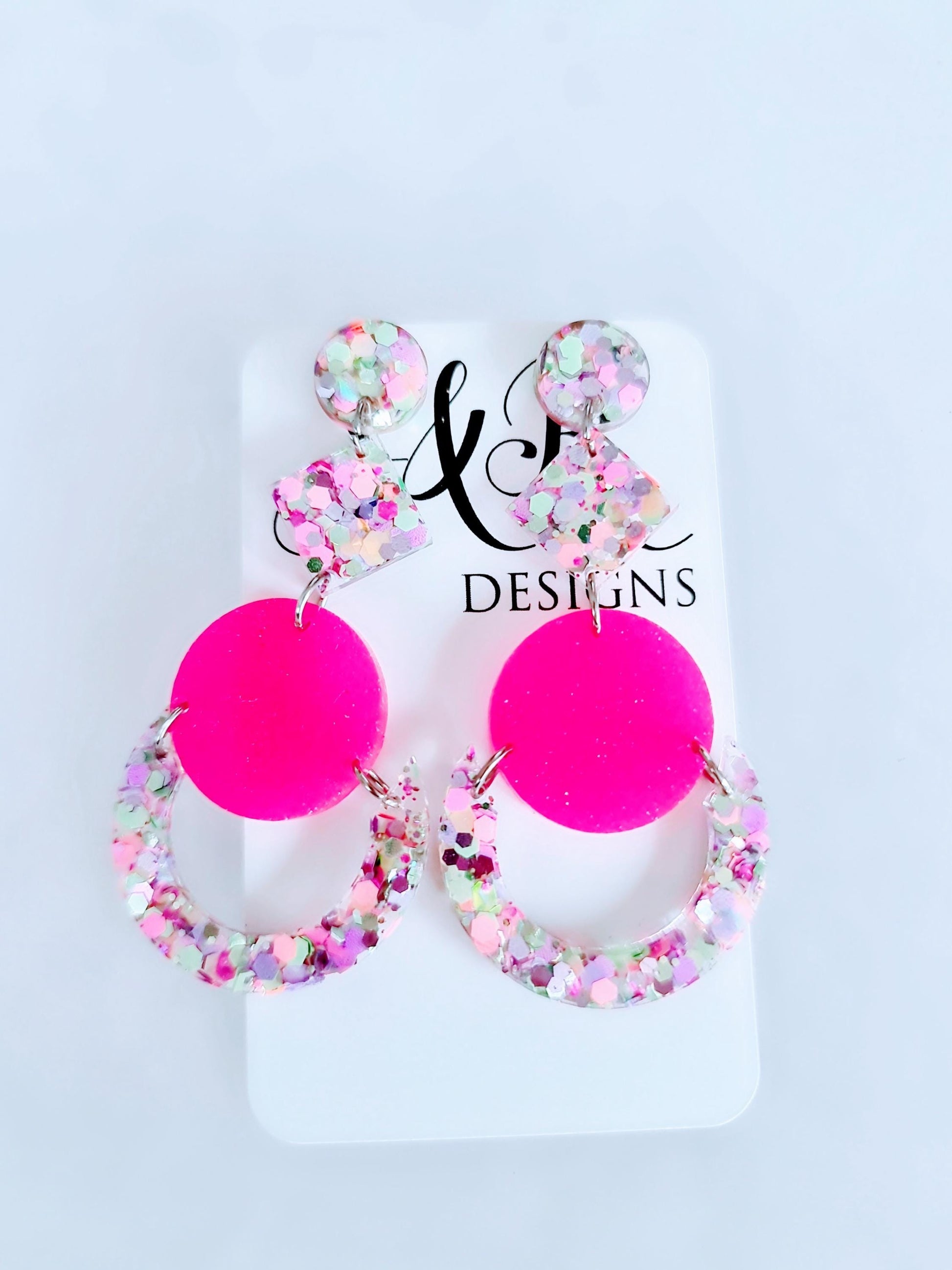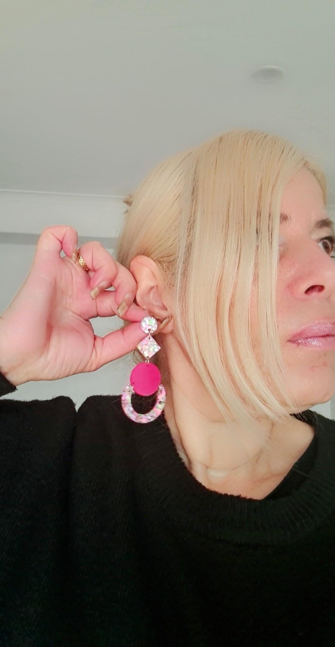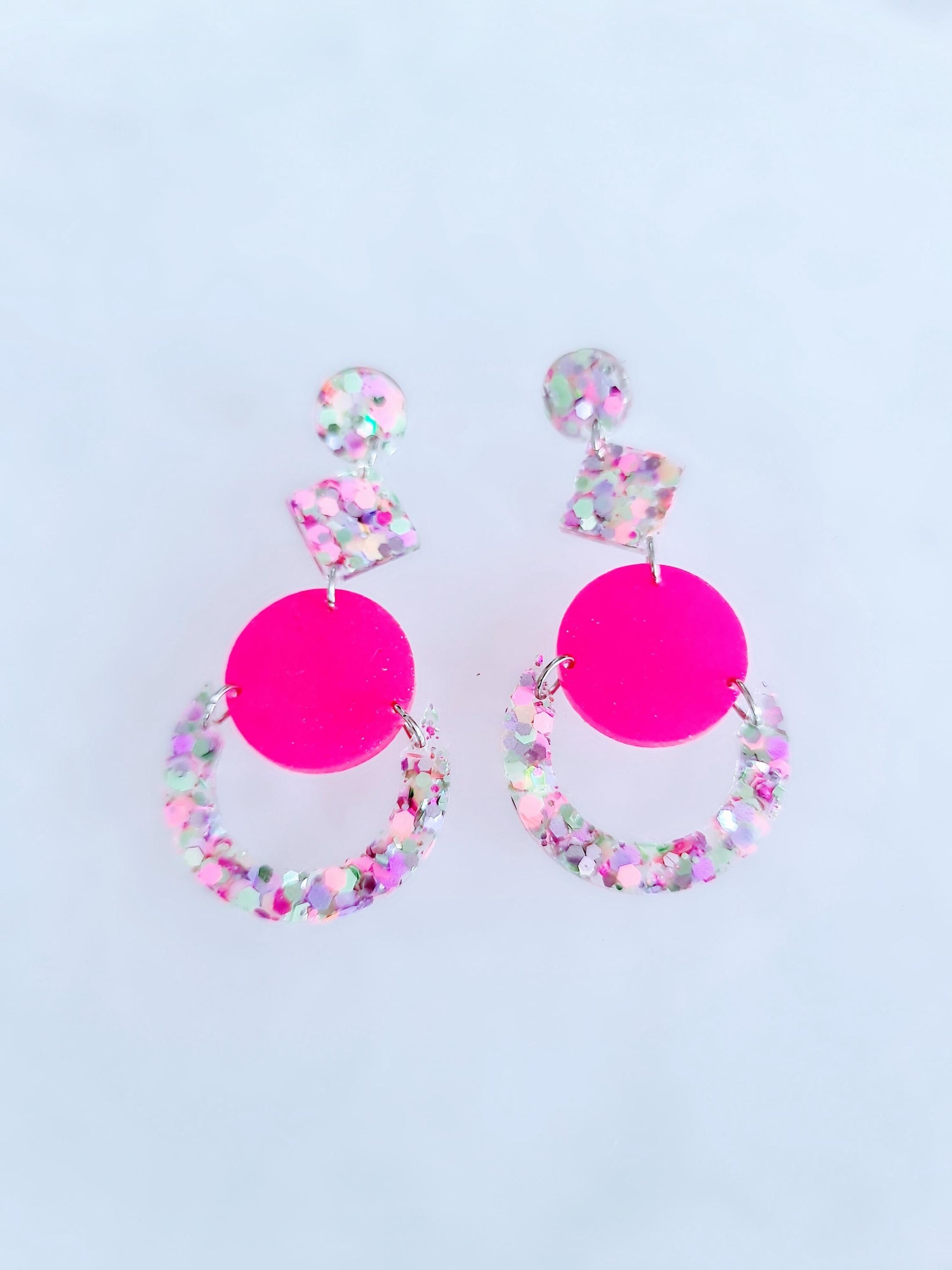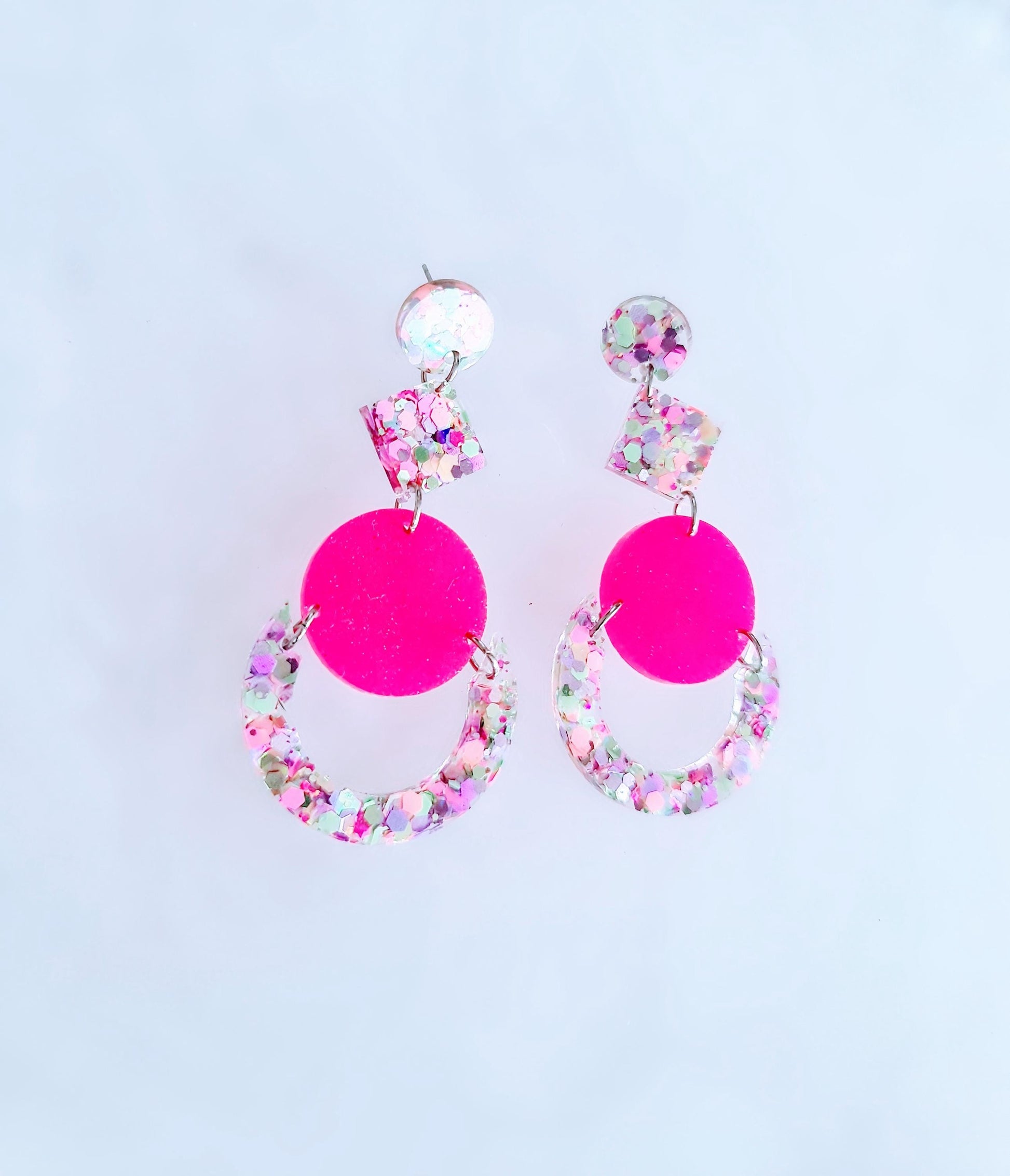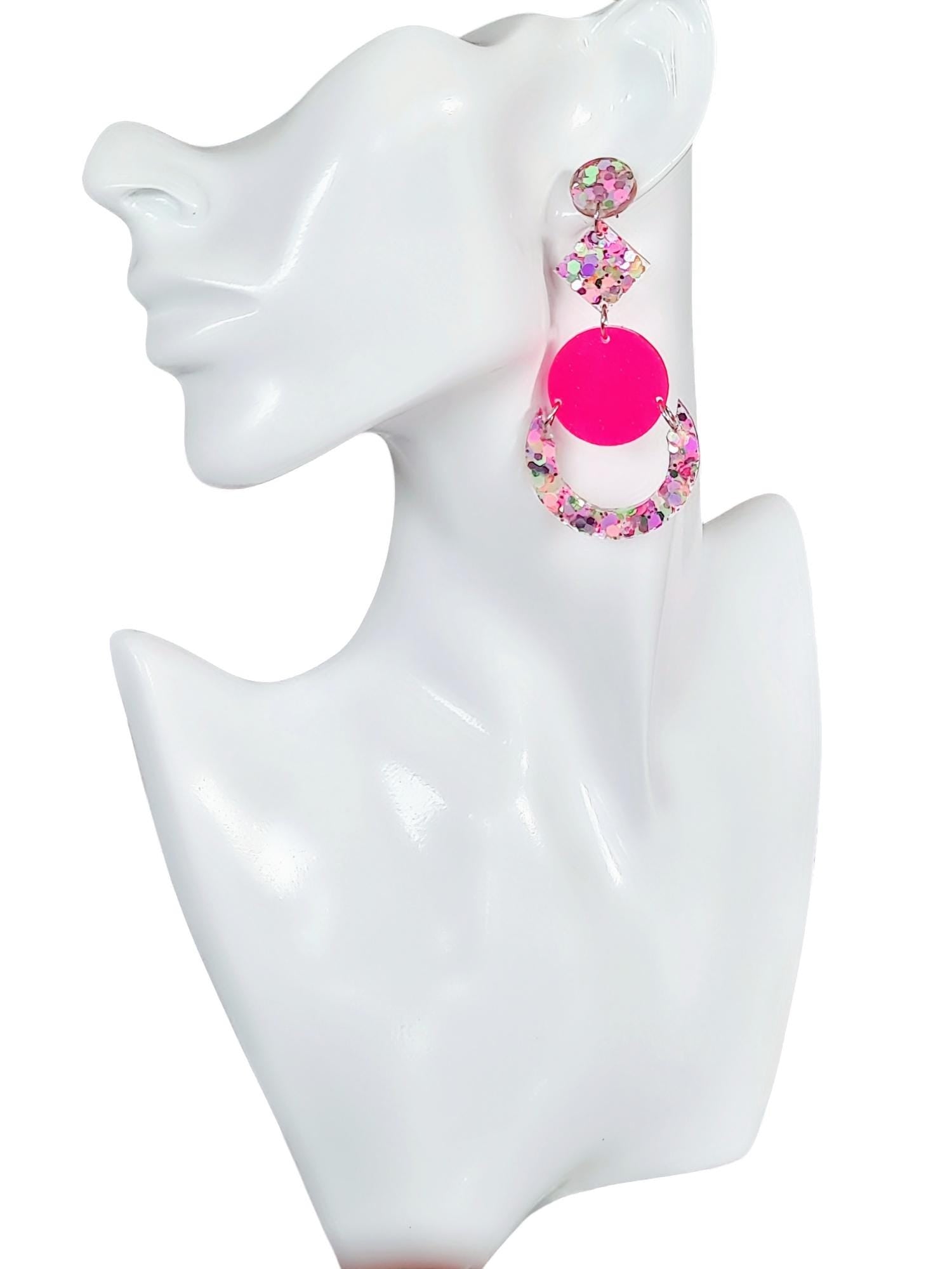 Long Hot Pink and Multicoloured Pastel Glitter Circle Diamond Resin Earrings Material: Stainless steel, resin, glitter.Colour: mixed glitter and Pink Size: 65mm length drop X 35mm wideIf you like light weight comfortable earrings then these are for you. Sparkly you can wear everyday or a night out. Show stopper earrings very glamorous. These earrings can be made in any colour you want. Custom your colour or if you would like shapes moved around.All metals are made with stainless steel which is perfect for sensitive ears hypoallergenic and never changes colour.
