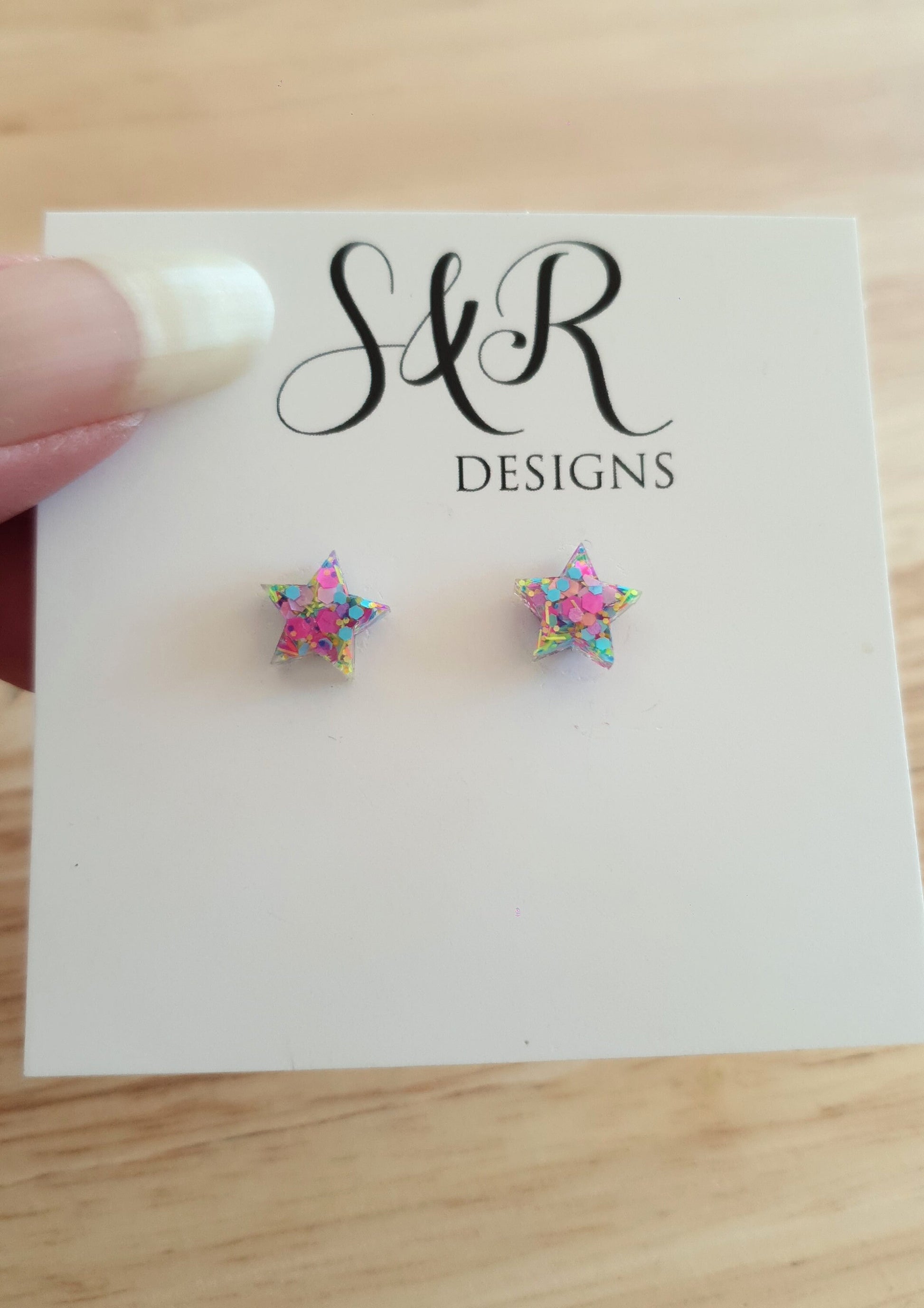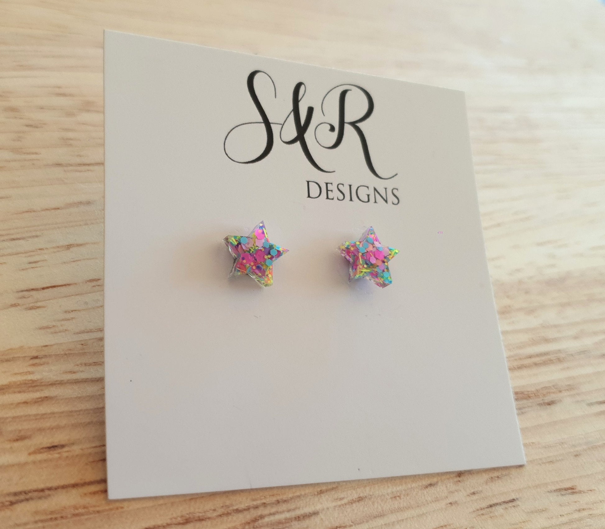 Introducing our stunning Star Earrings, a perfect accessory to add a touch of sparkle to any outfit. These pastel mix colours of green, yellow, pink and blue star earrings are designed for those who love to shine and stand out from the crowd.Crafted with care using high-quality materials, these earrings feature stainless steel studs adorned with poured resin and glitter. The multicoloured combination pastel pink, blue, yellow and green creates a vibrant and eye-catching color palette that will surely turn heads.Measuring at 9mm x 9mm, these earrings are lightweight and comfortable to wear all day long. Made with stainless steel for sensitive ears. Whether you're attending a special occasion or simply want to elevate your everyday style, these star earrings are the perfect choice.What sets our star earrings apart is the option for customization. If you prefer different colors to match your personal style, simply reach out to our dedicated team. Our talented artist Angie will be delighted to create custom earrings just for you.Add a touch of enchantment and individuality to your jewelry collection with our beautiful Star Earrings. Don't miss out on this opportunity to own a unique piece of wearable art. Order yours today and let your inner star shine bright!