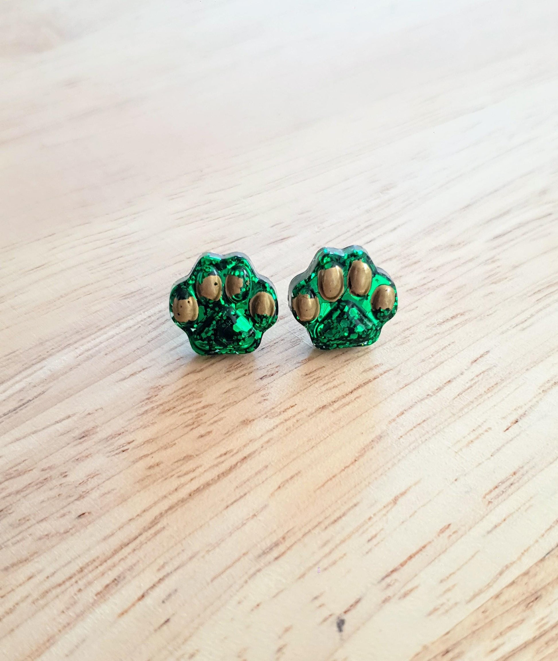 Beautiful Shiny Emerald Green and Gold Paw Print Stud Earrings. Material: Stainless steel, poured resin and glitter.Colour: Emerald green Size: 15mm All resin is mixed and poured, sanded and polished and made by me Angie. If you would like different colours please message me.