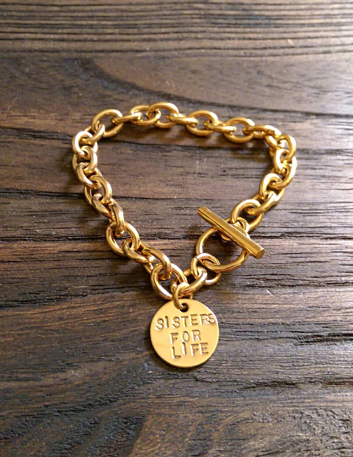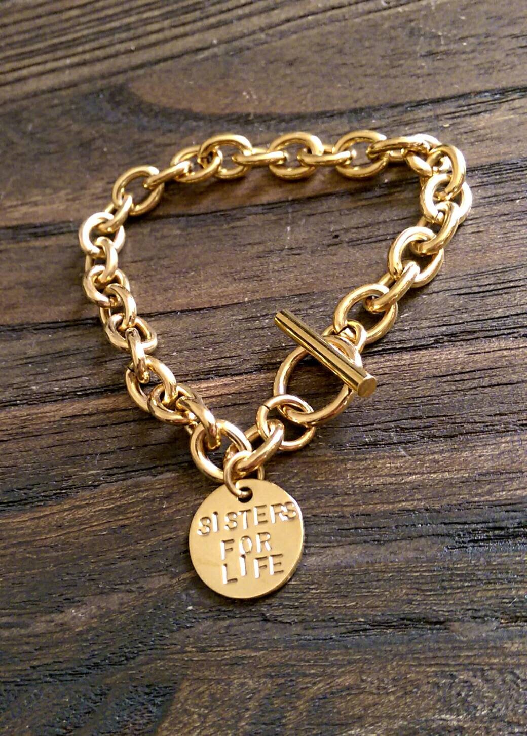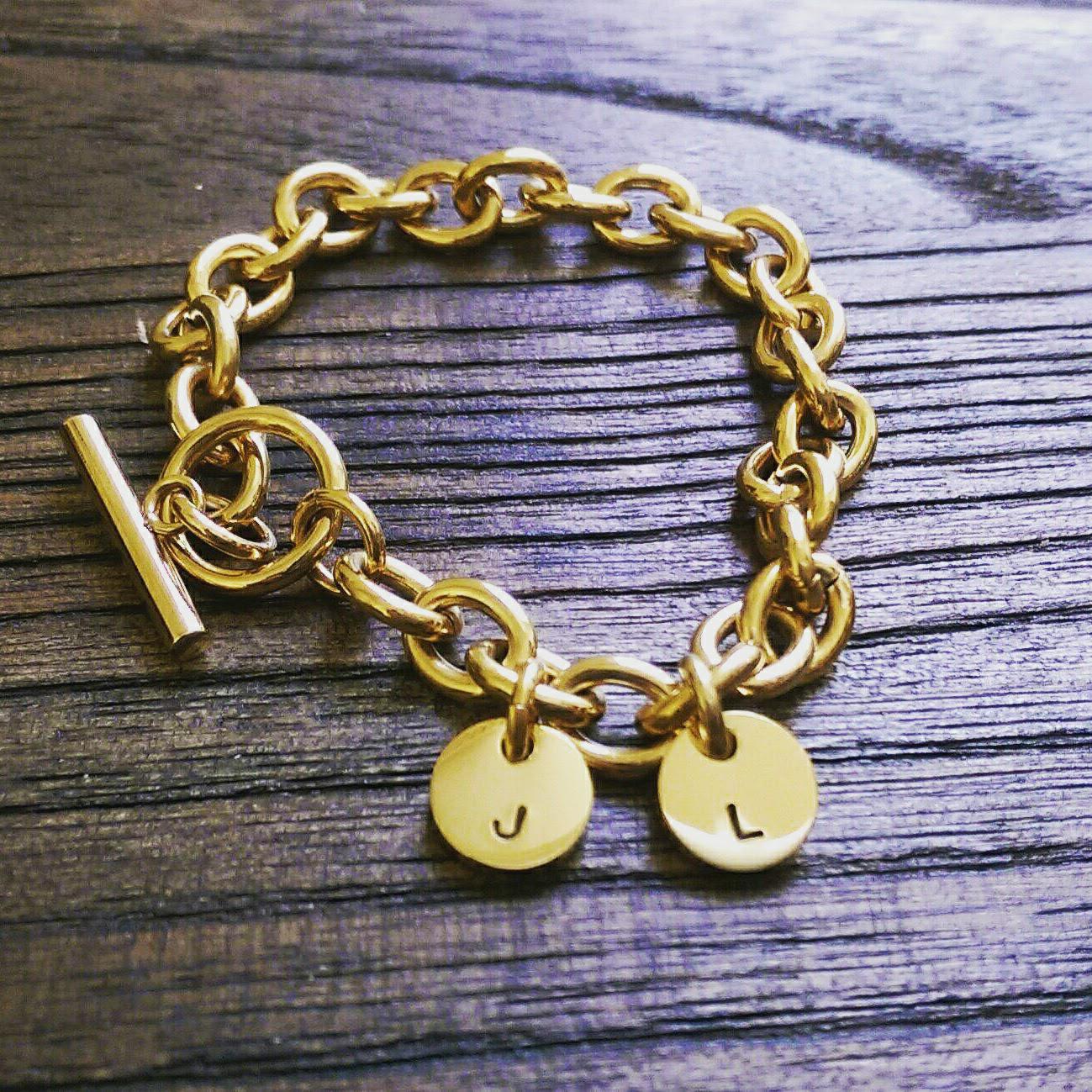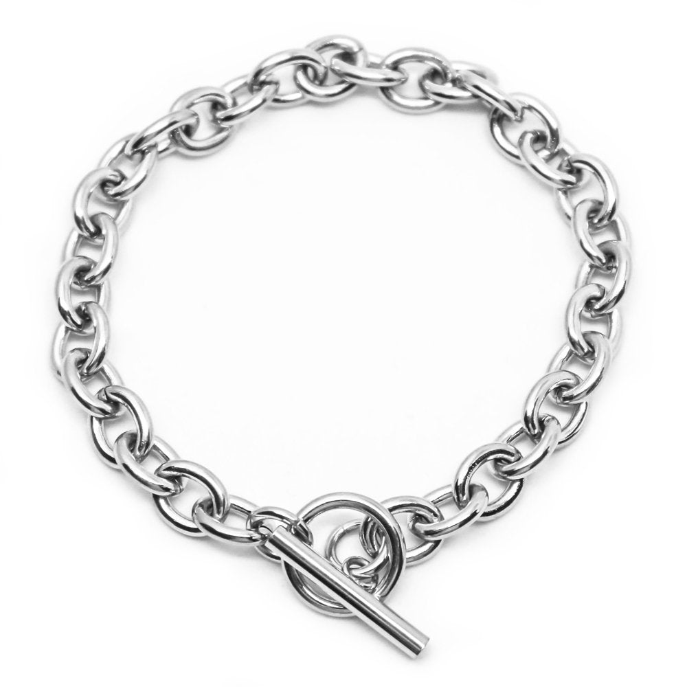 Stainless Steel Link Toggle Bracelet with hand stamped Disc.Toggle Bracelet with personalised Disc charm which will be hand stamped with the Letter, date, name or word you prefer. Lovely Mothers Day Present, Valentine's, Birthday Present keep sake.The Bangle is created using high quality jewellery grade stainless steel, making it hypo-allergenic and suitable for all skin types, to give you the peace of mind you deserve. Toggle Bracelet come in 19cm or 21cm in length.
