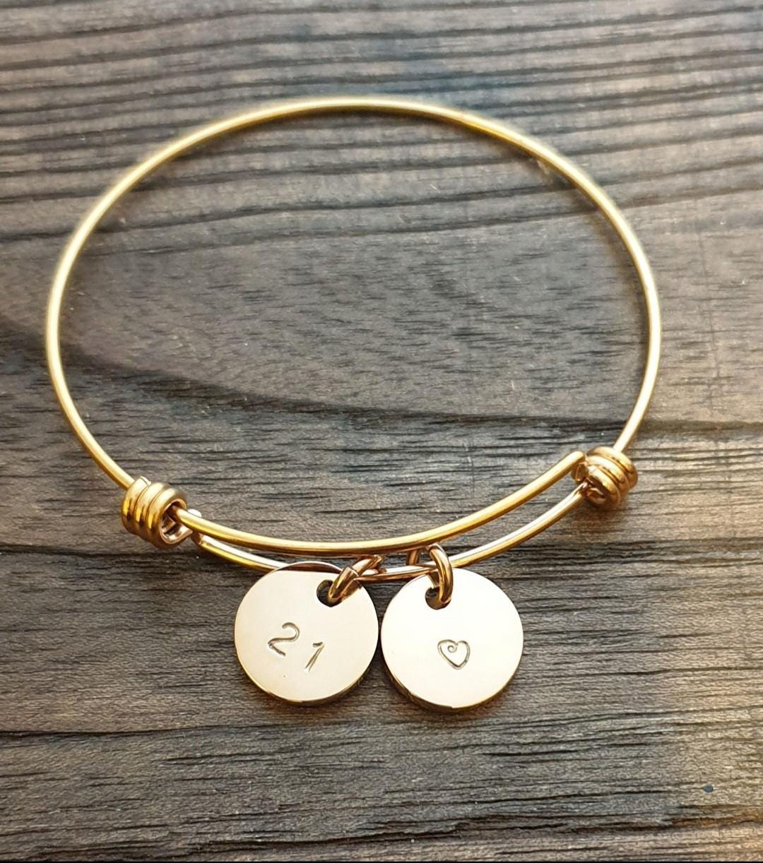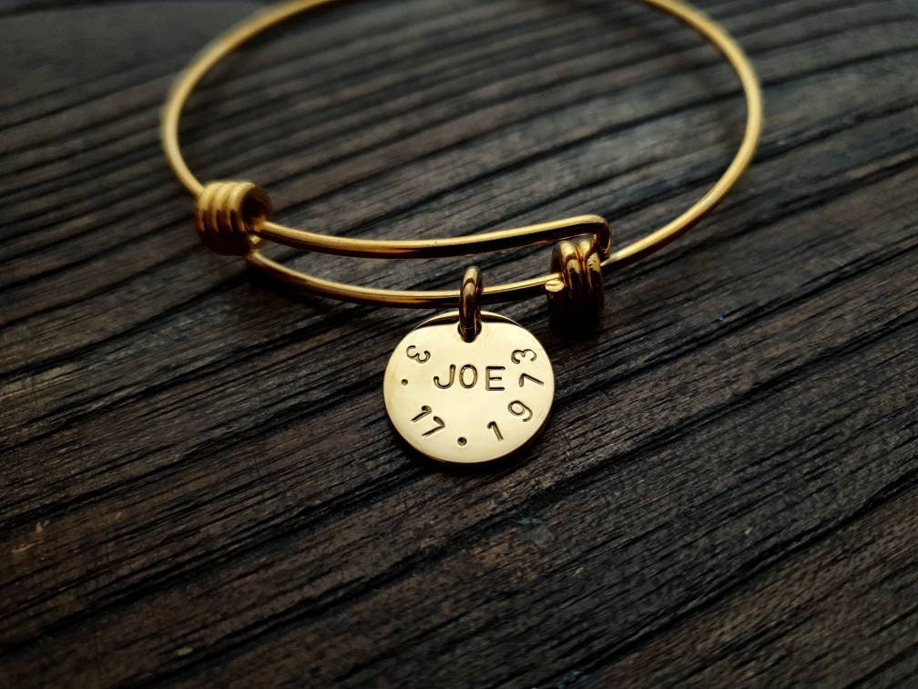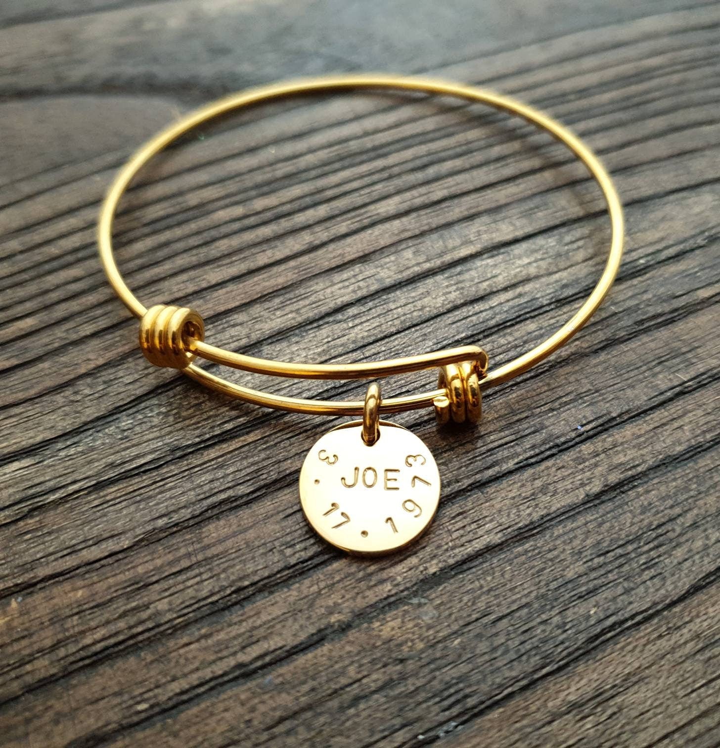 Lovely Wedding present, Mothers Day Present, Valentines, Birthday Present keepsake.A beautiful personalised adjustable bangle that can be worn on its own or mixed together. The Personalised Bangle is created using high quality jewellery grade stainless steel, making it hypoallergenic and suitable for all skin types, to give you the peace of mind you deserve.Available in three finishes; Silver, Gold & Rose Gold This listing is for the Gold, look in my store for more designs and colours.15mm disc personalised with name, date or word.Please be aware that there are limited space as to what I can hand stamp. If you would like it blank as picture and not hand stamped, please email me a I will place a new listing for you.If you have any questions please do not hesitate to contact me.