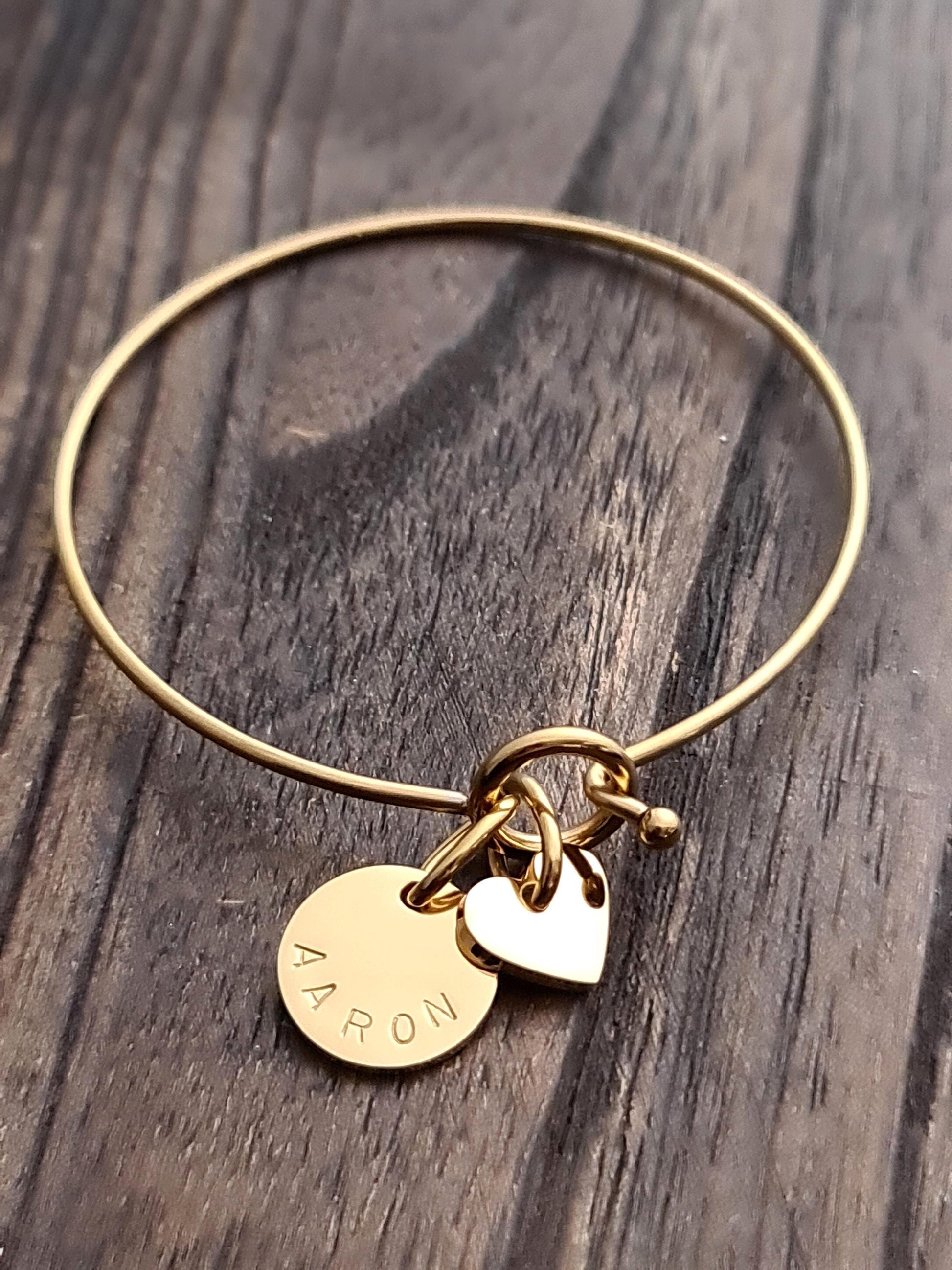 Personalised Hand Stamped Bangle with or without Heart Charm, Personalised Disc, Choose how many Disc Charms you want, Personalized Gift